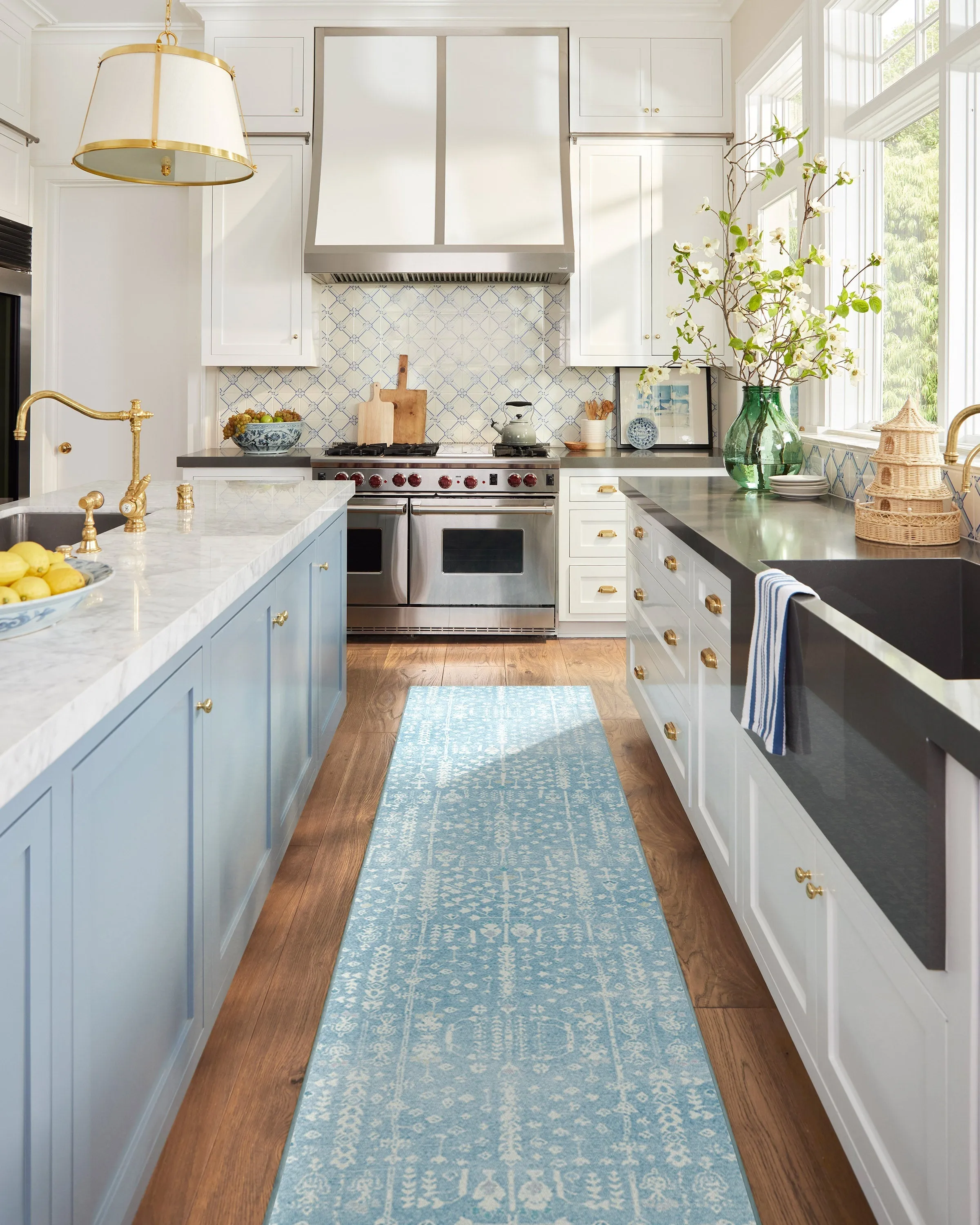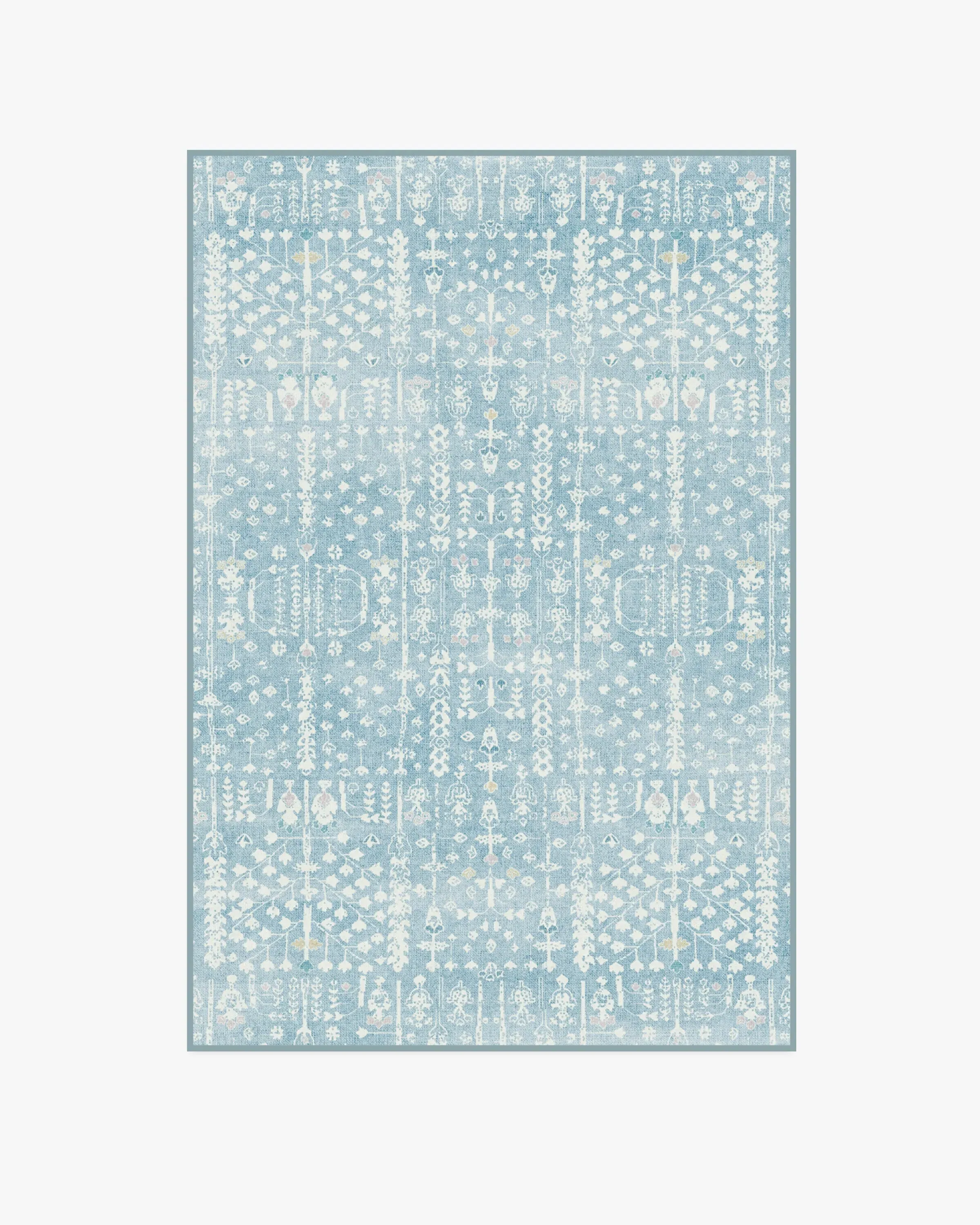 The Palmetto Rug features hand-drawn Persian motifs with a subtly distressed repeat pattern on a soft blue background. Ivory details combine with buttercream, pink, and teal accents for airy, coastal elegance. The flatwoven construction offers durability, while water-resistant and stain-resistant properties provide practical benefits. Machine-washable design makes maintenance effortless. W60 x D90 cm.