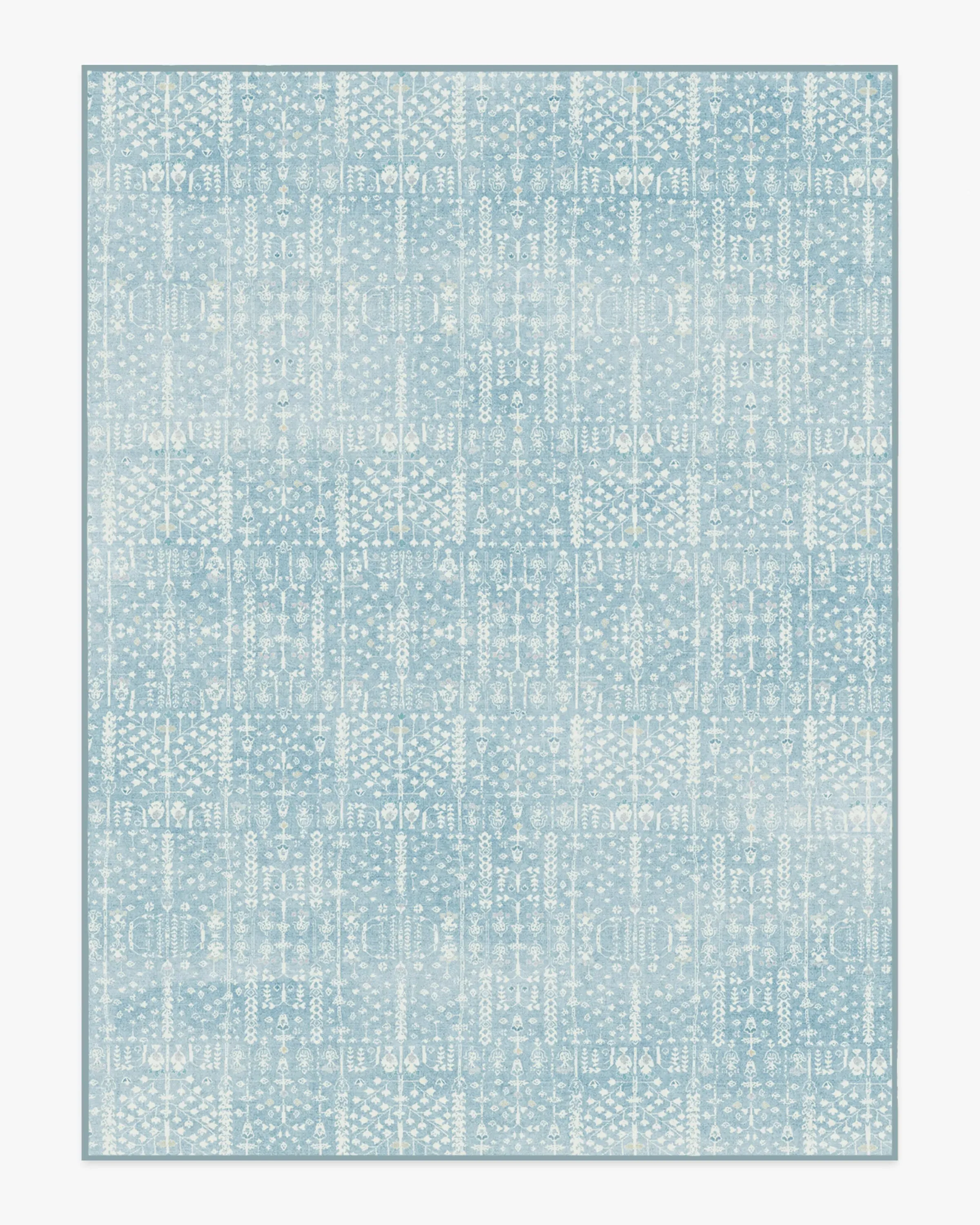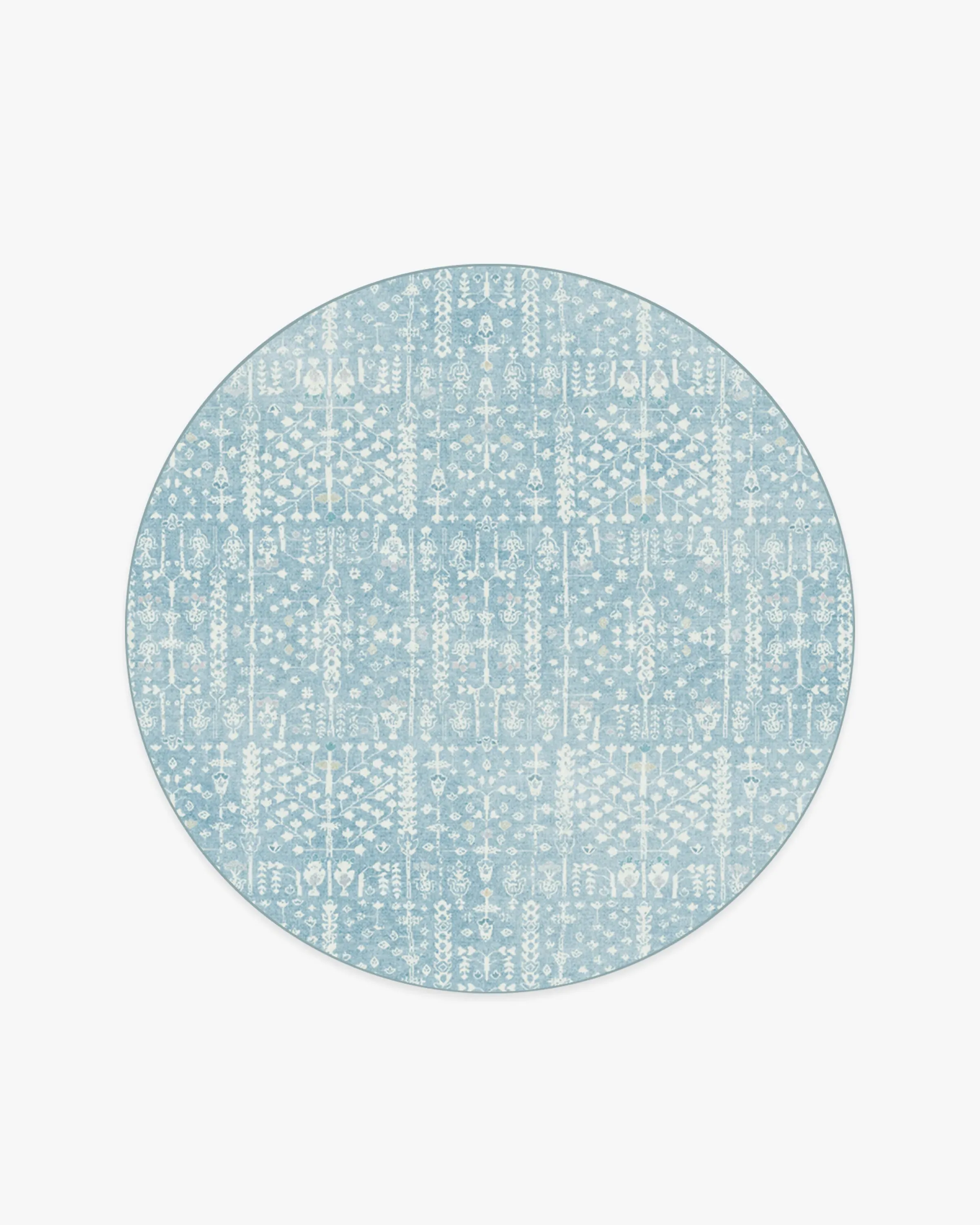 A fresh spin on classic Persian design, the Palmetto Rug features hand-drawn motifs and a subtly distressed repeat pattern. Set on a soft blue background, ivory details mingle with playful pops of buttercream, pink, and teal for a sun-washed, airy elegance. Water-resistant, stain-resistant, and fully machine-washable. Colours may vary by device and lighting.. 60x90 | Machine Washable Area Rug | Kid & Pet Friendly | Indoor Rugs | Palmetto Coastal Blue Flatwoven Rug by Gray Malin | Ruggable