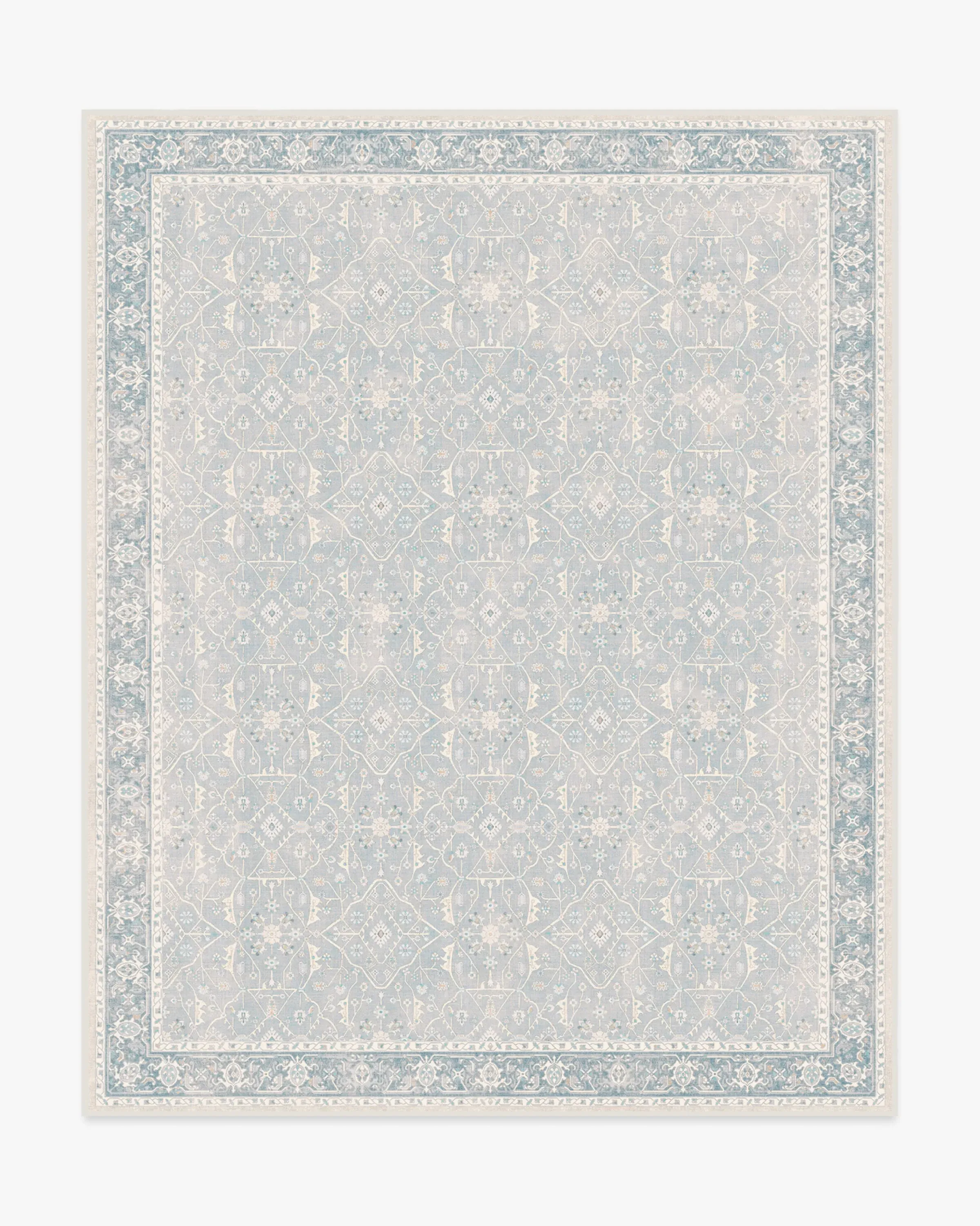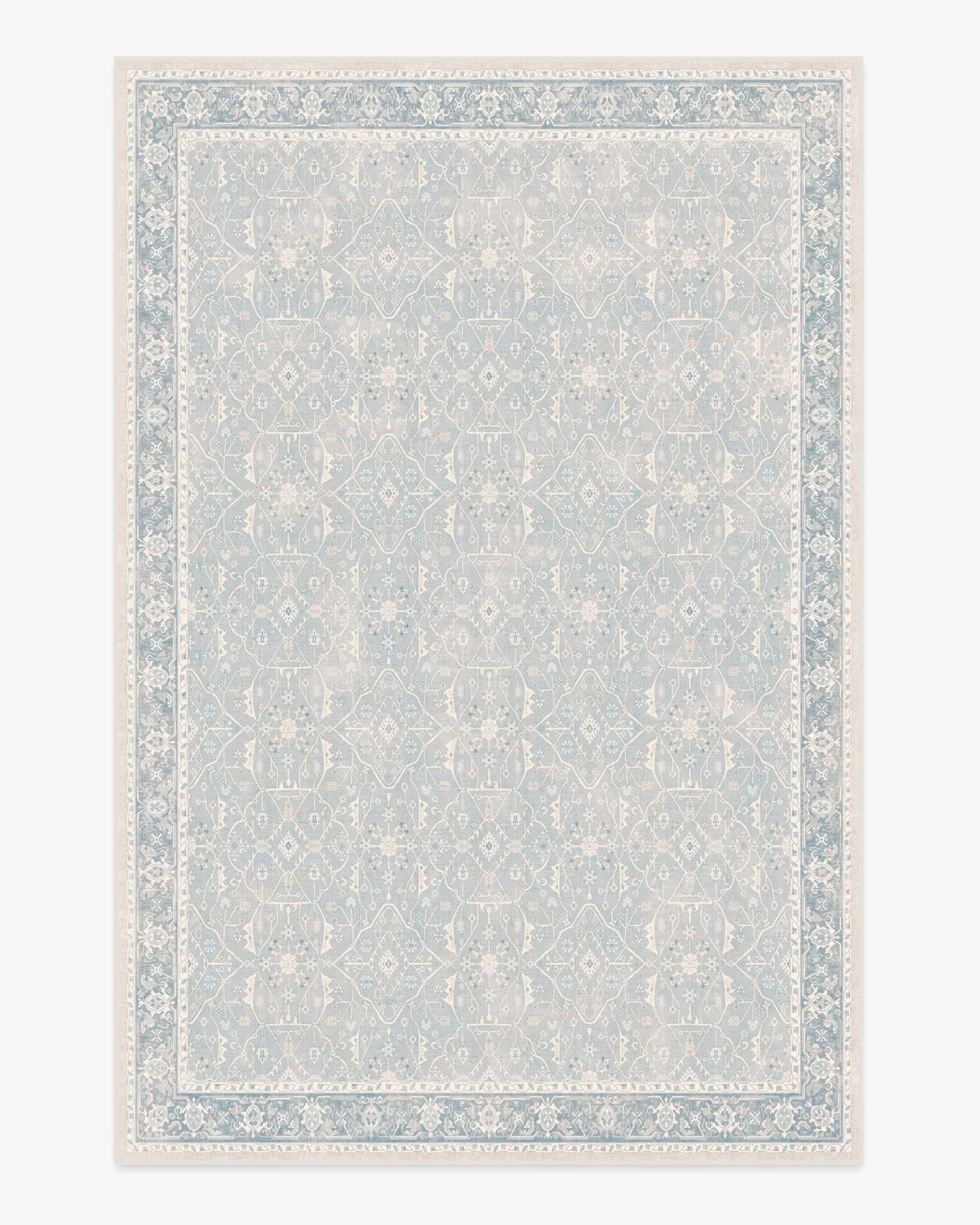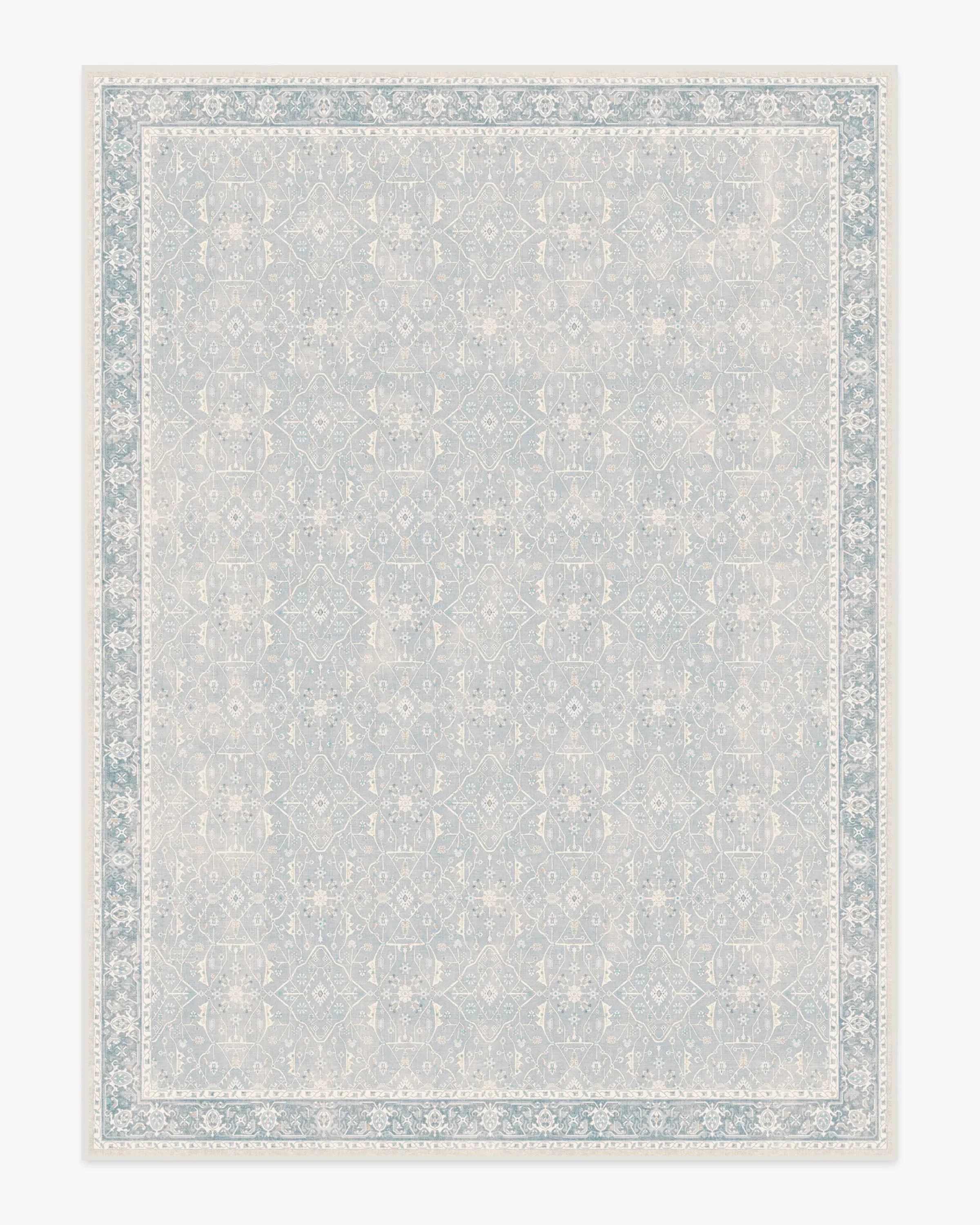 Dream in blue. Our vintage-inspired Celestine Soft Blue Rug exudes soothing blue pops of colour with hints of coral and a warm fog undertone. The whimsical floral theme sparks happiness with its intricate flowering vine lattice panel design. Made from our water-resistant, stain-resistant, and machine-washable low-pile Chenille material. 60x90 | Machine Washable Area Rug | Kid & Pet Friendly | Indoor Rugs | Celestine Soft Blue Flatwoven Rug | Ruggable