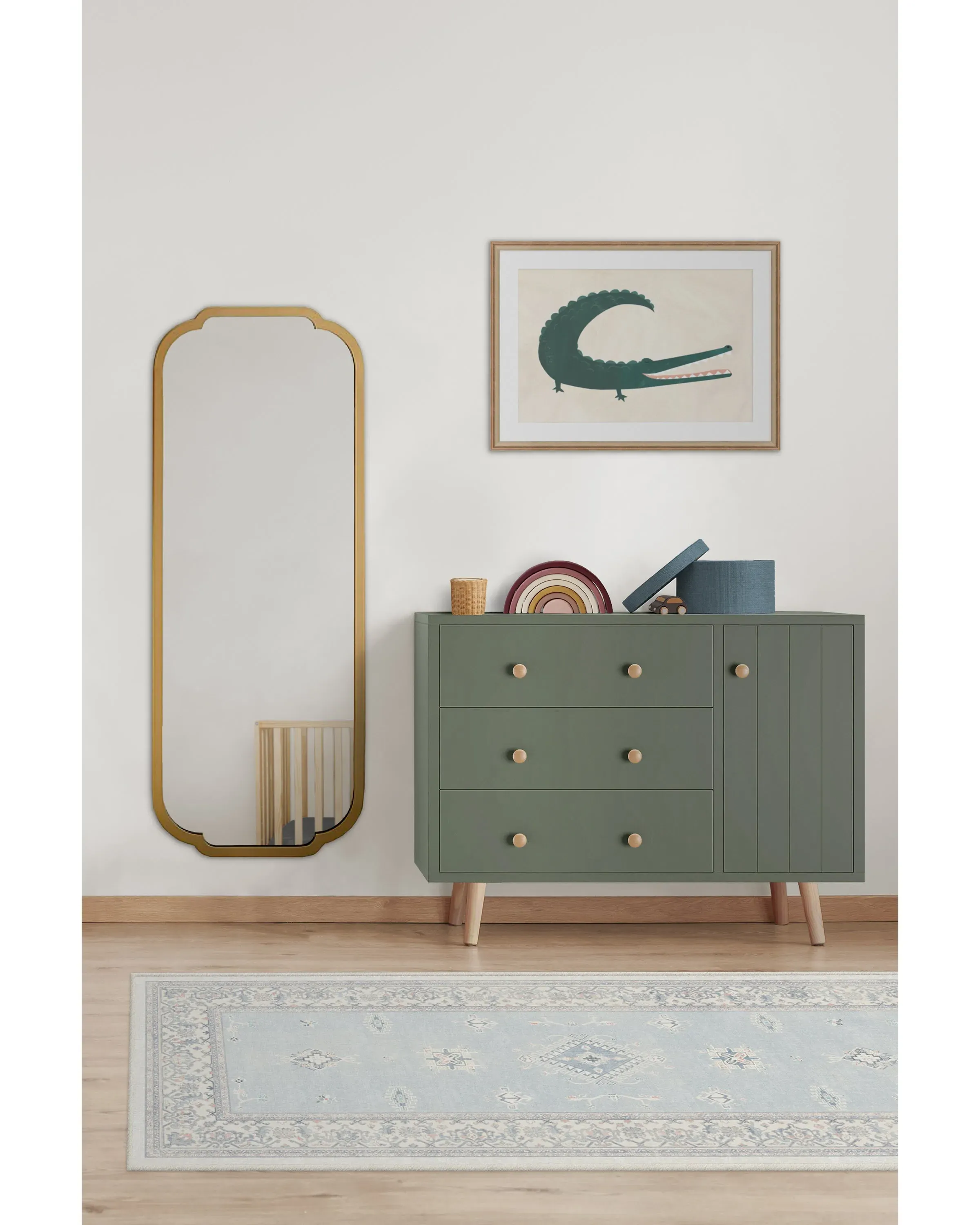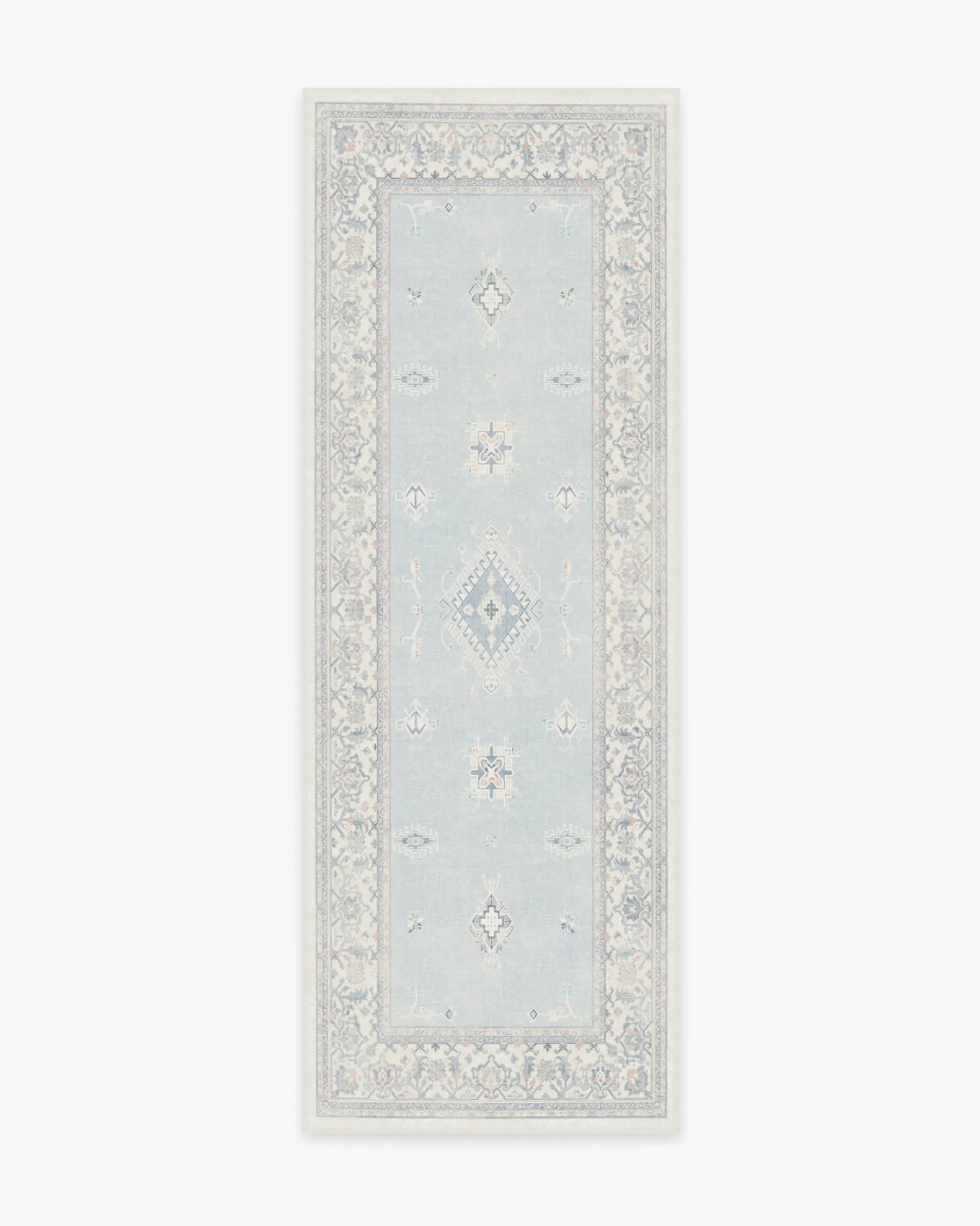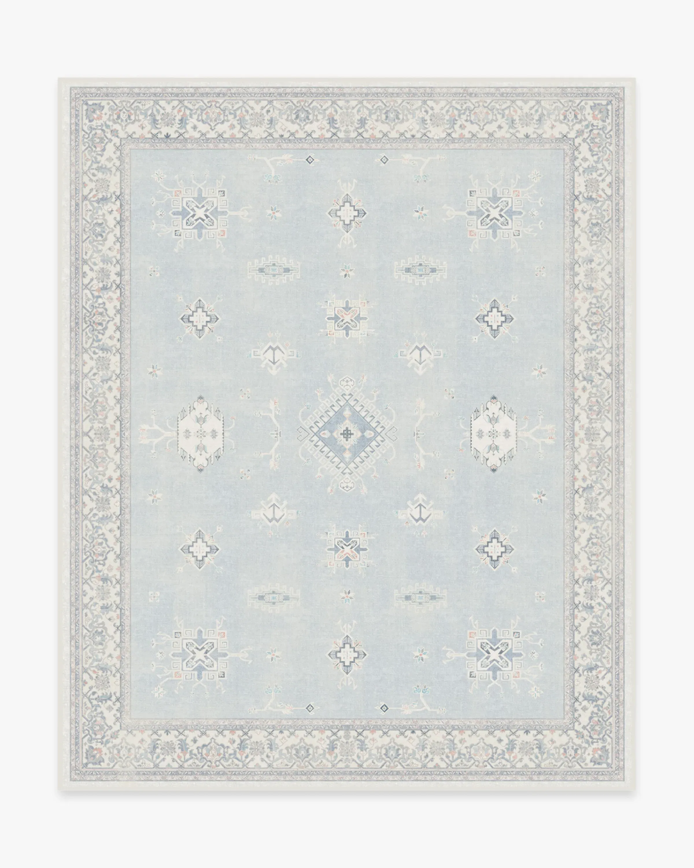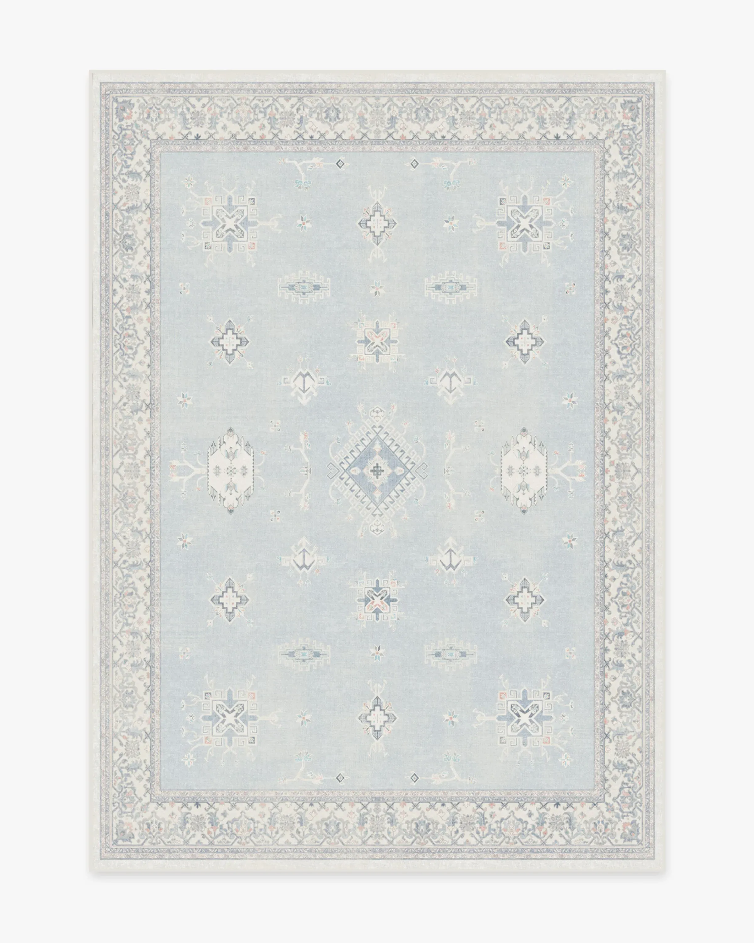 Total softy. Our Verena Soft Blue Rug delights your space with a sky blue background adorned with a grid of geometric shapes reminiscent of embellished jewels. This Persian-style design encapsulates a feeling of youth and tranquility with its shades of light blues and hints of soft pinks amongst its distressed texture. Made from our water-resistant, stain-resistant, and machine-washable low-pile Chenille material. 60x90 | Machine Washable Area Rug | Kid & Pet Friendly | Indoor Rugs | Verena Soft Blue Flatwoven Rug | Ruggable