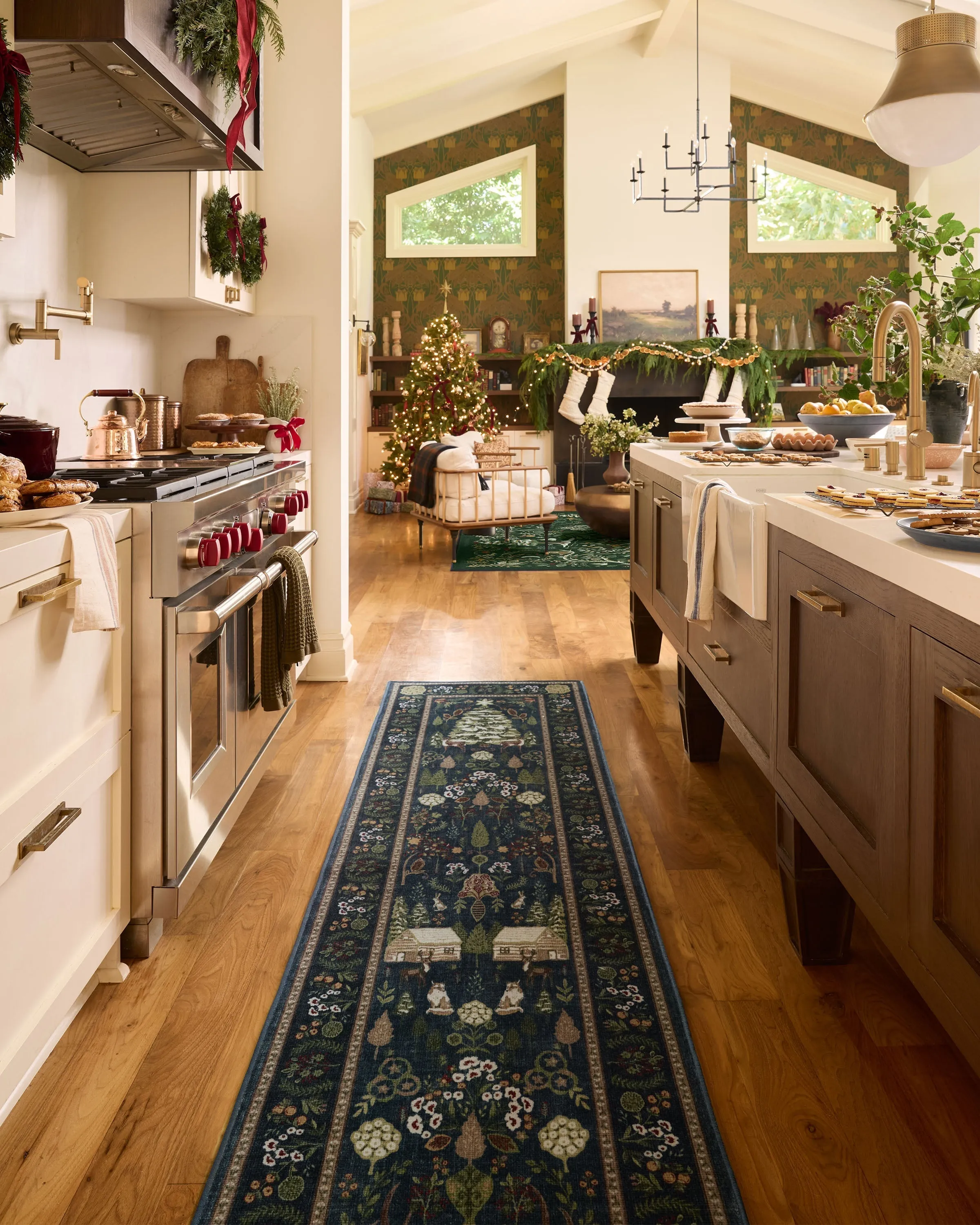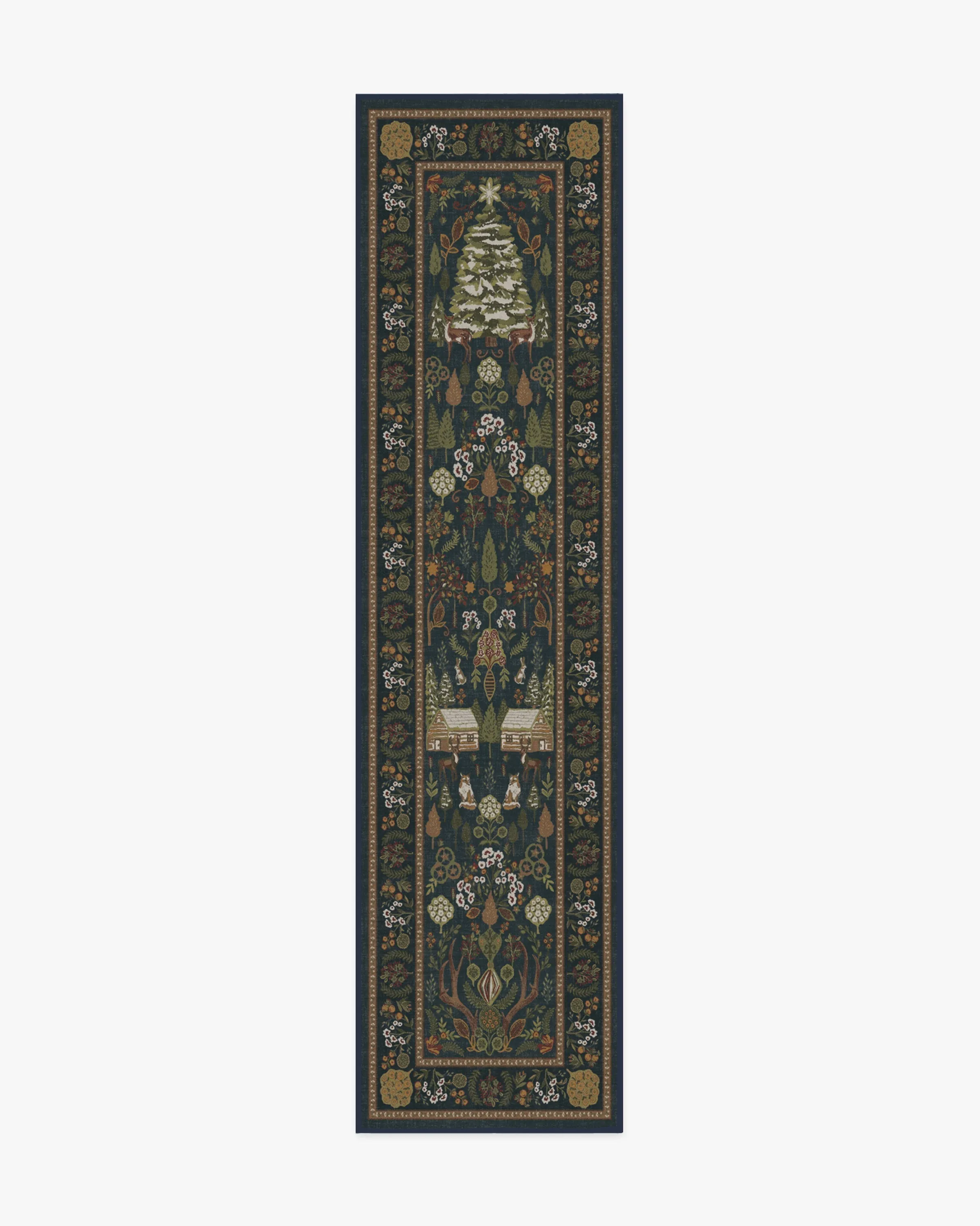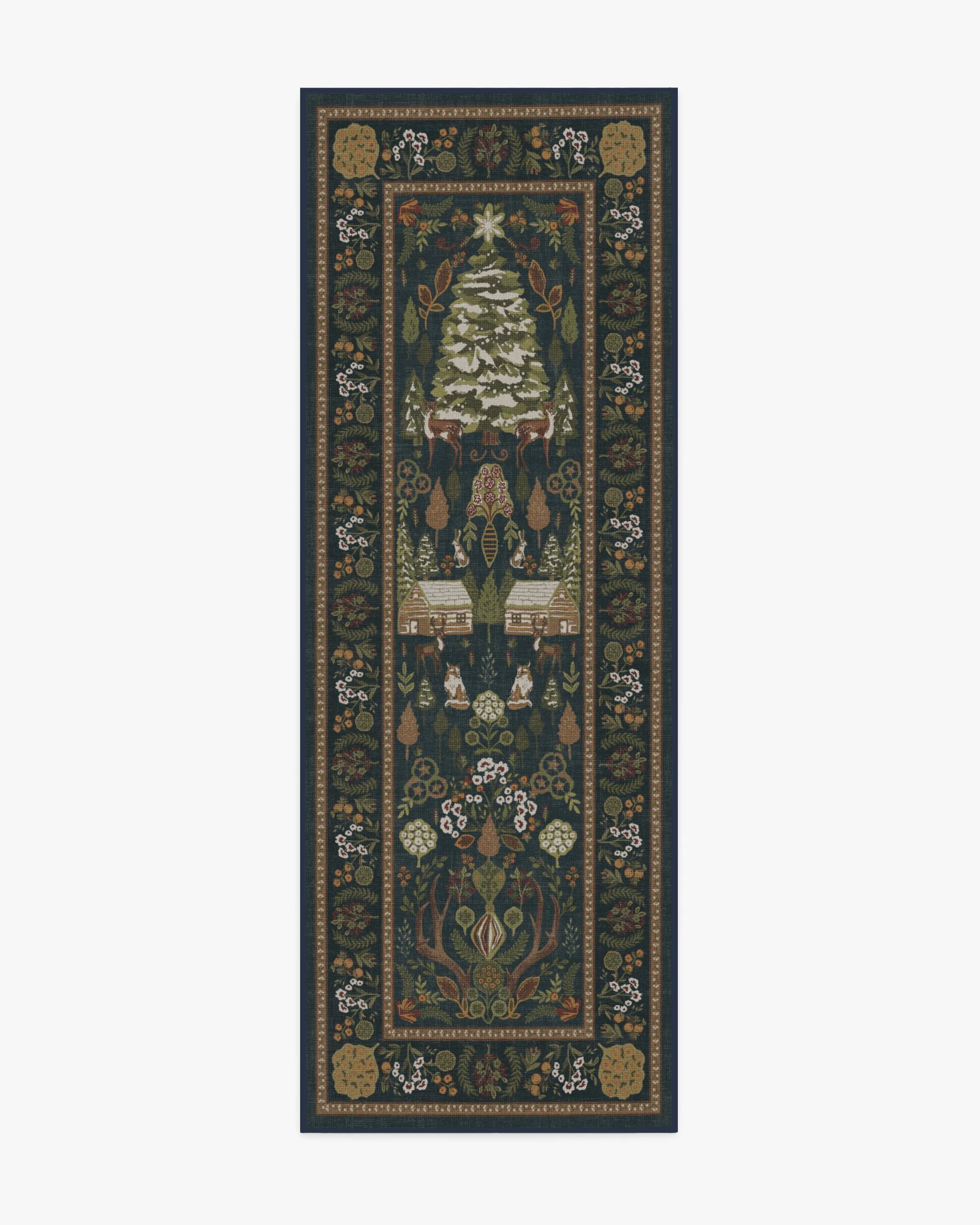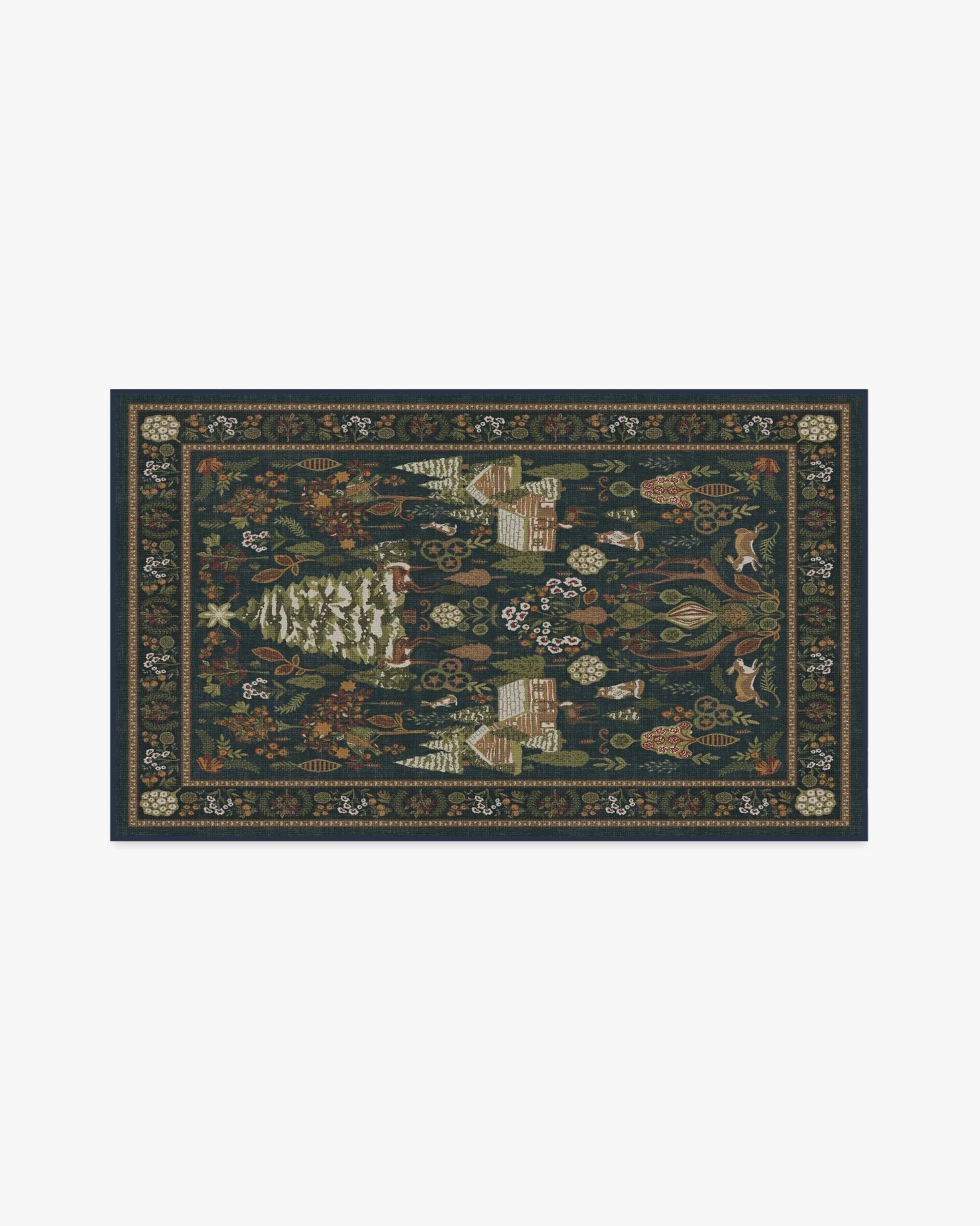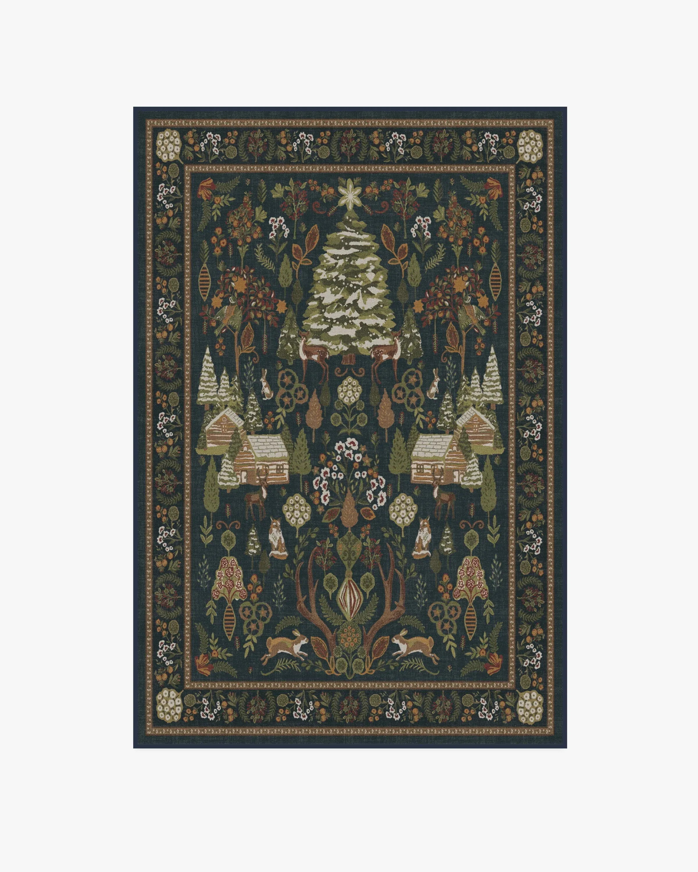 Merrily frolic through a winter wonderland with our Juniper Midnight Blue Rug. This cottagecore design features pine trees, winter animals, log cabins, and pretty foliage throughout. The deep blue background sets the tone for sage, light greens, warm neutrals, and lush red motifs, highlighted with pops of light cream. Water-resistant, stain-resistant, and machine-washable. Rug colours may vary slightly according to your device and the lighting in your space. 60x90 | Machine Washable Area Rug | Kid & Pet Friendly | Indoor Rugs | Juniper Midnight Blue Flatwoven Rug | Ruggable
