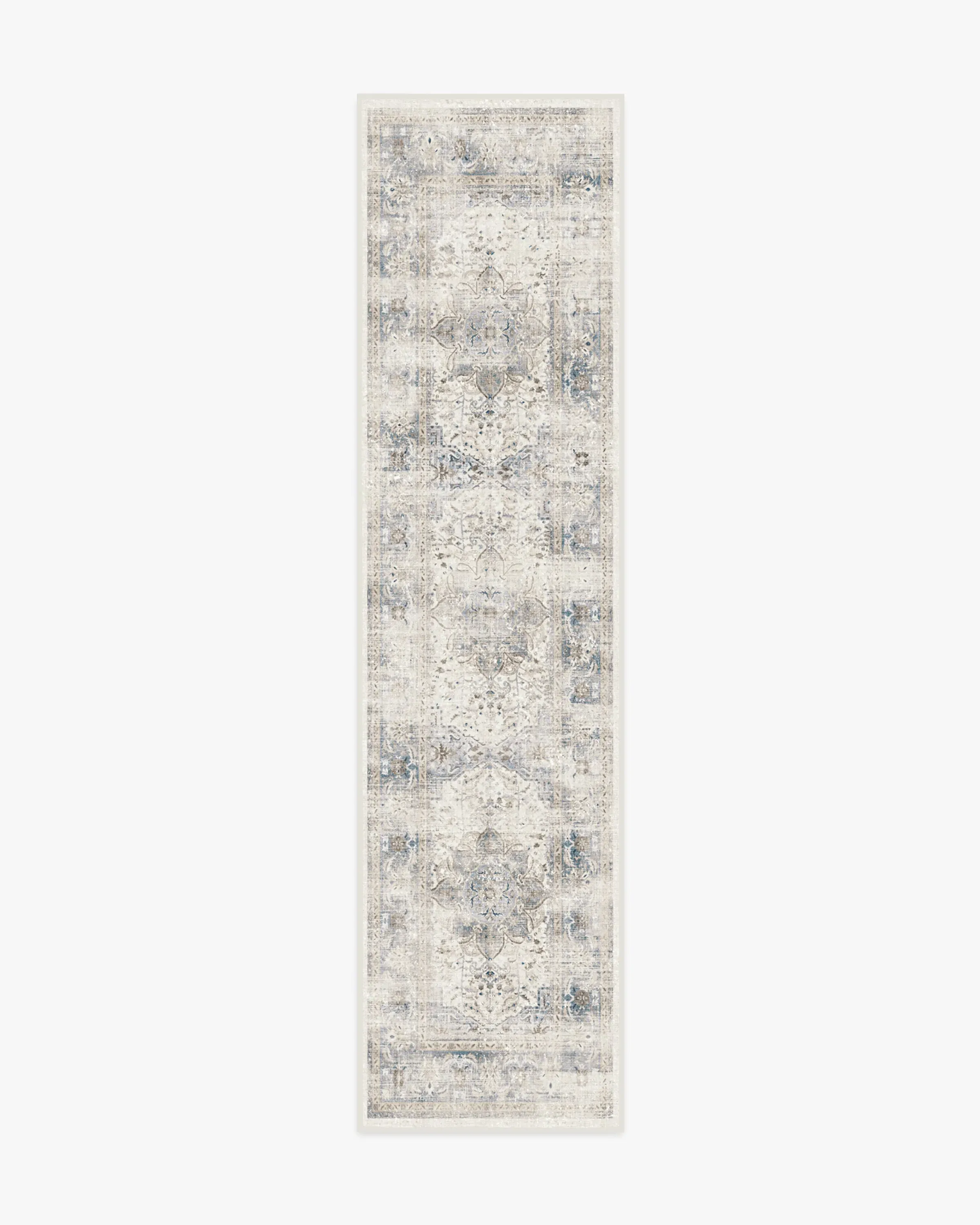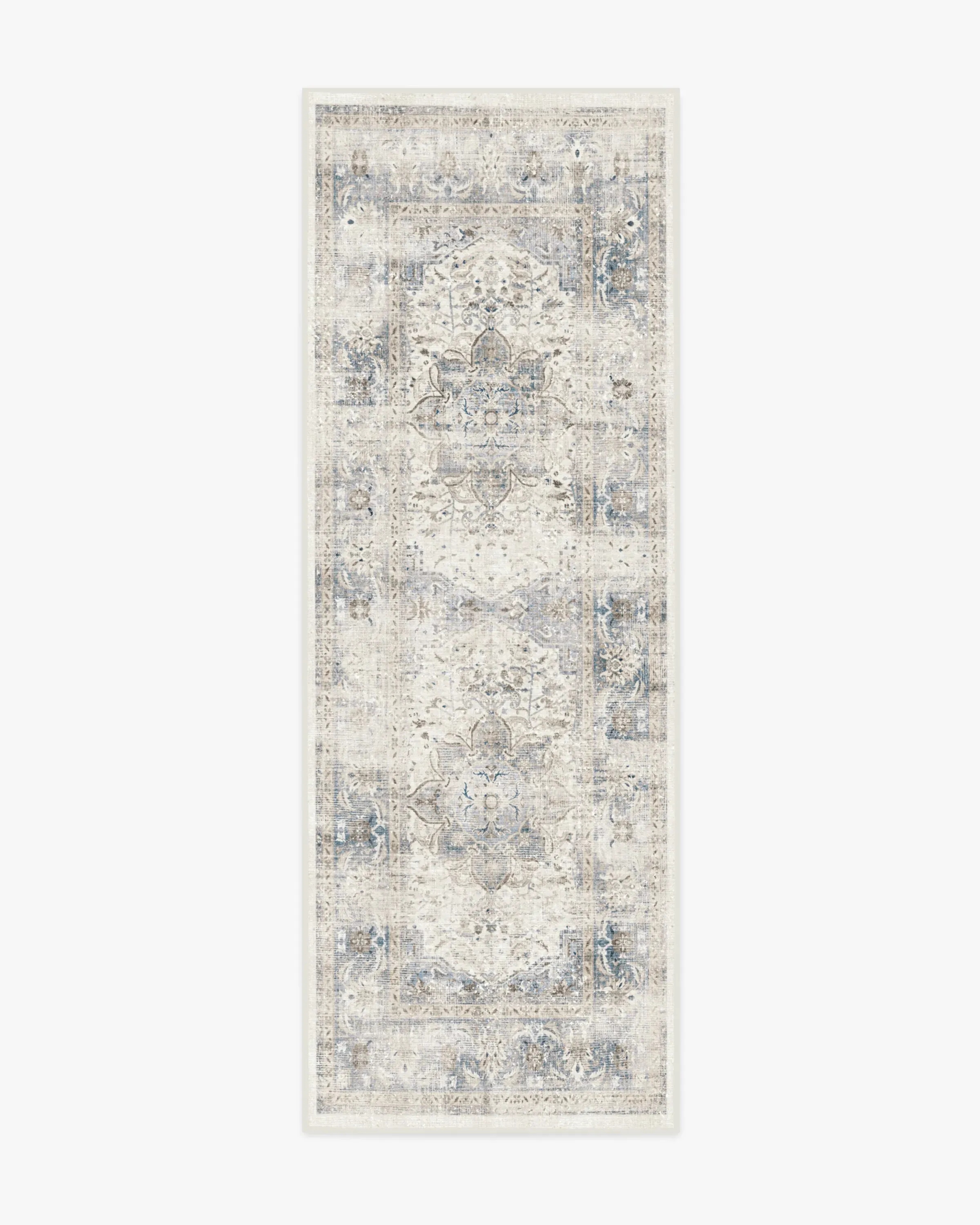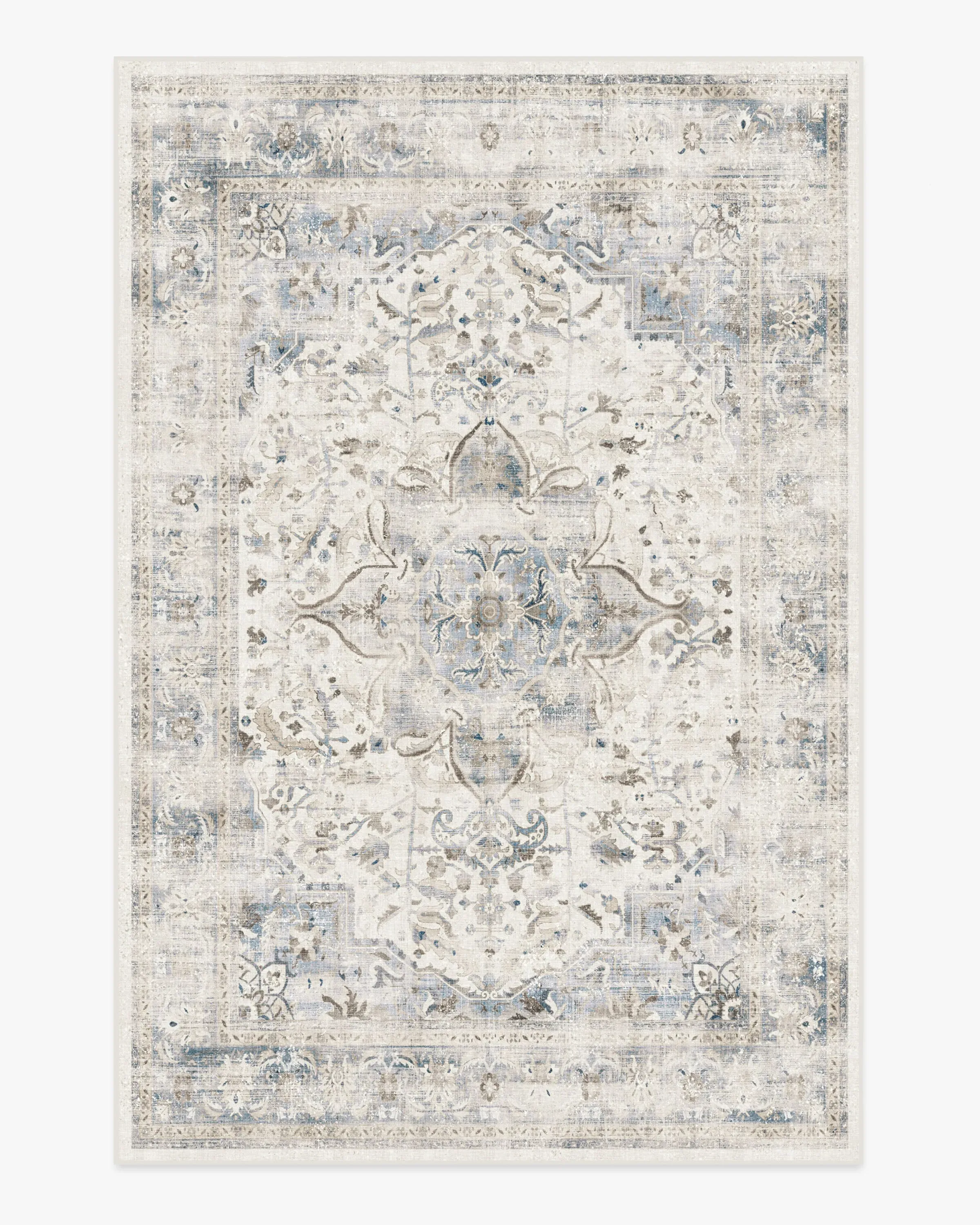 Vintage with a touch of chic. This rug features a floral medallion and decorated border in shades of slate and sapphire blue balanced with off-white. The whitewashing effect gives this rug a vintage feel. Water-resistant, stain-resistant, and machine-washable. 60x90 | Machine Washable Area Rug | Kid & Pet Friendly | Indoor Rugs | Sarrah Blue Quartz Rug | Ruggable