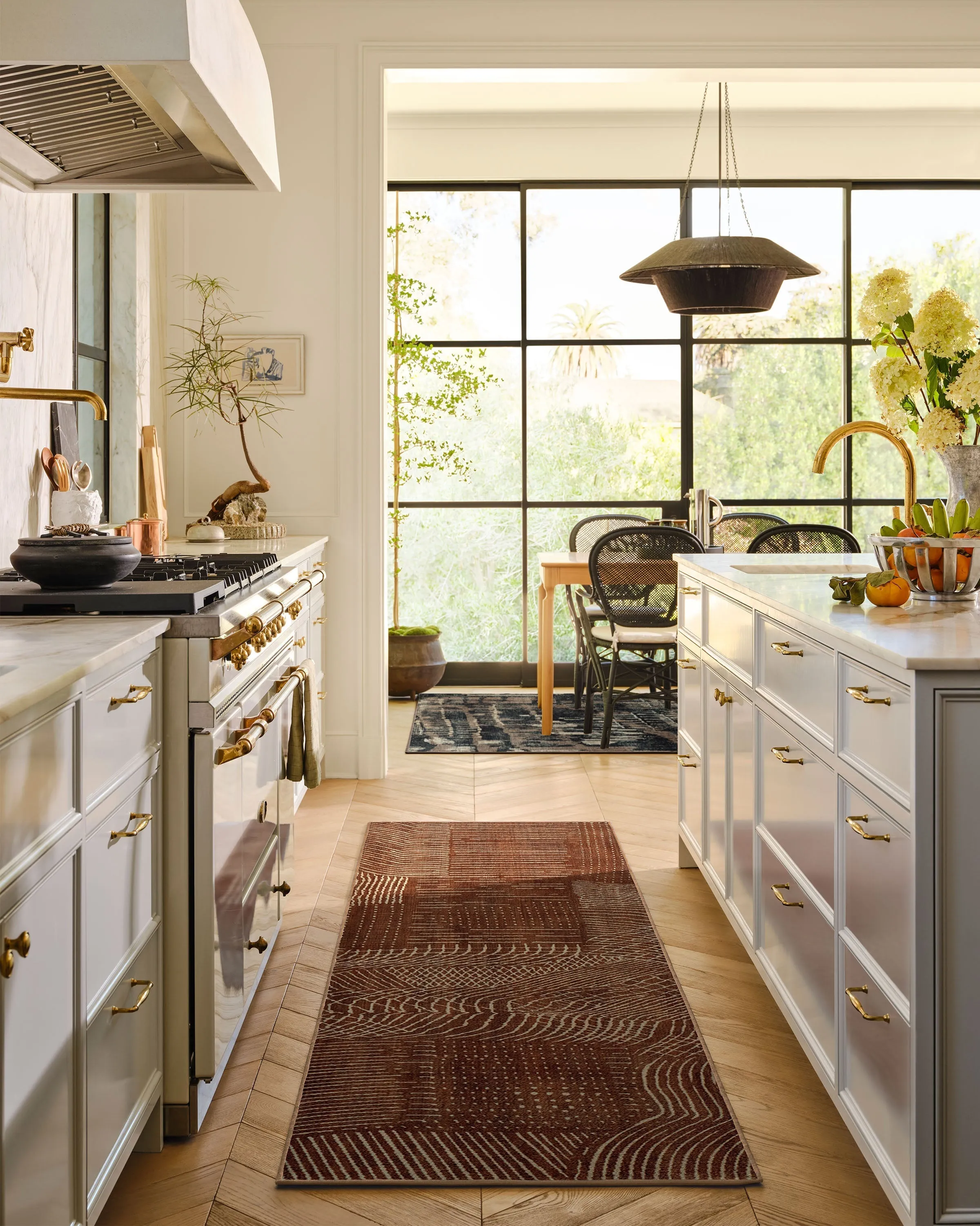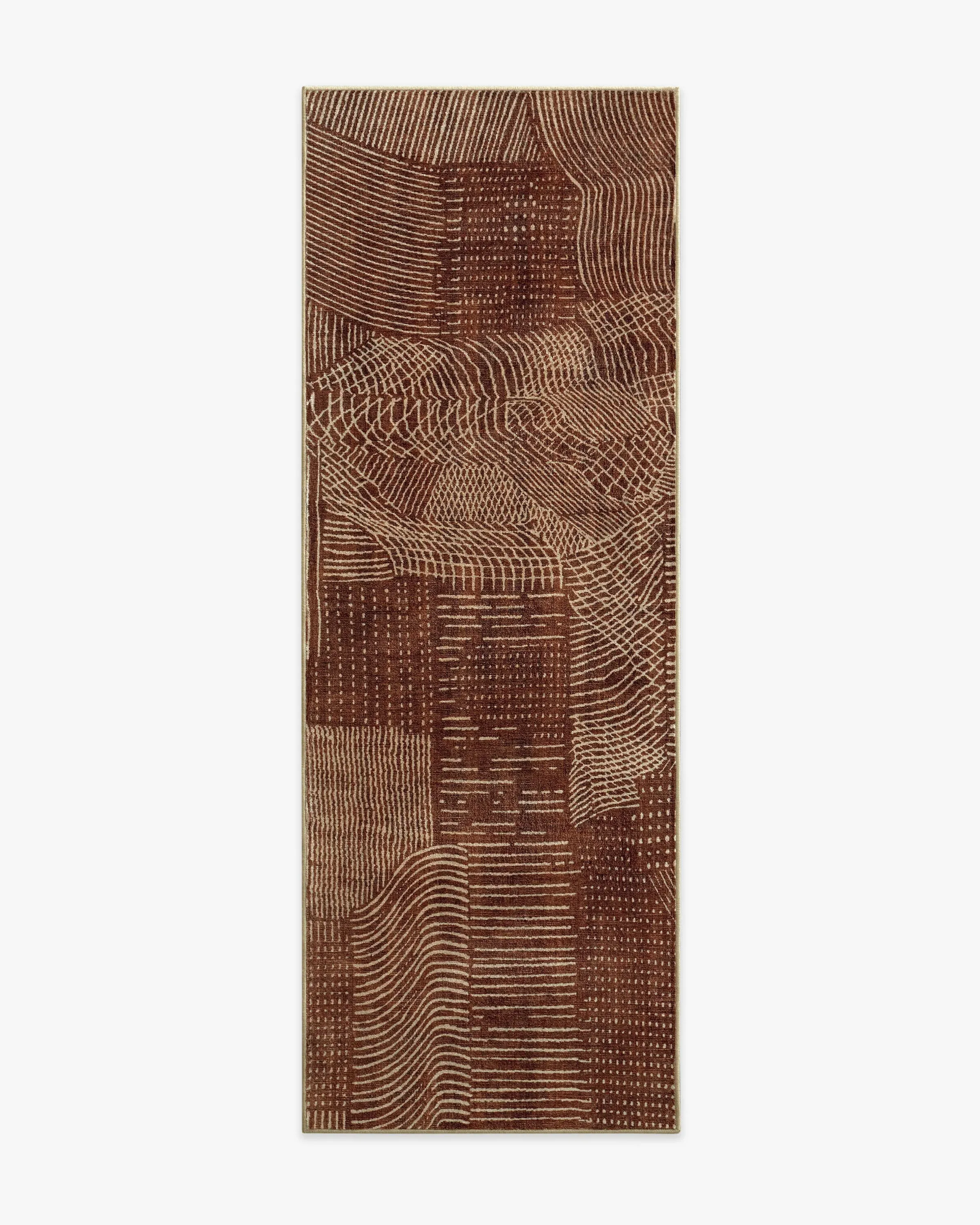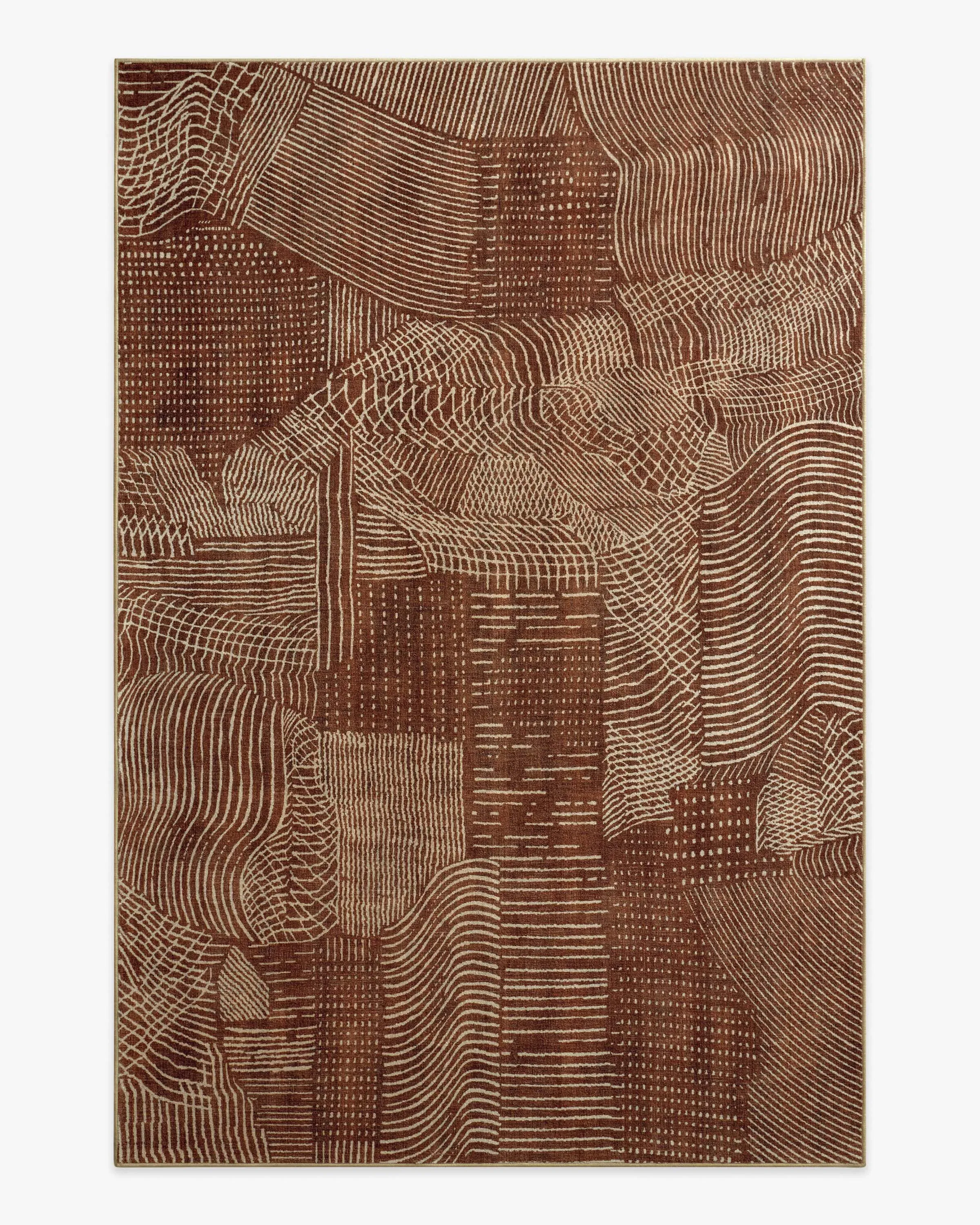 Cosy up to the Ferra Copper Tufted Rug and its patchwork-like pattern in soft beige linework on a warm copper ground. Feelings of comfort and warmth will fill your space, along with a dash of uniqueness thanks to the rhythmic movement and balance of curved and straight lines. Water-resistant, stain-resistant, and fully machine-washable. Colours may vary by device and lighting. 60x90 | Machine Washable Area Rug | Kid & Pet Friendly | Indoor Rugs | Ferra Copper Rug Brown | Ruggable
