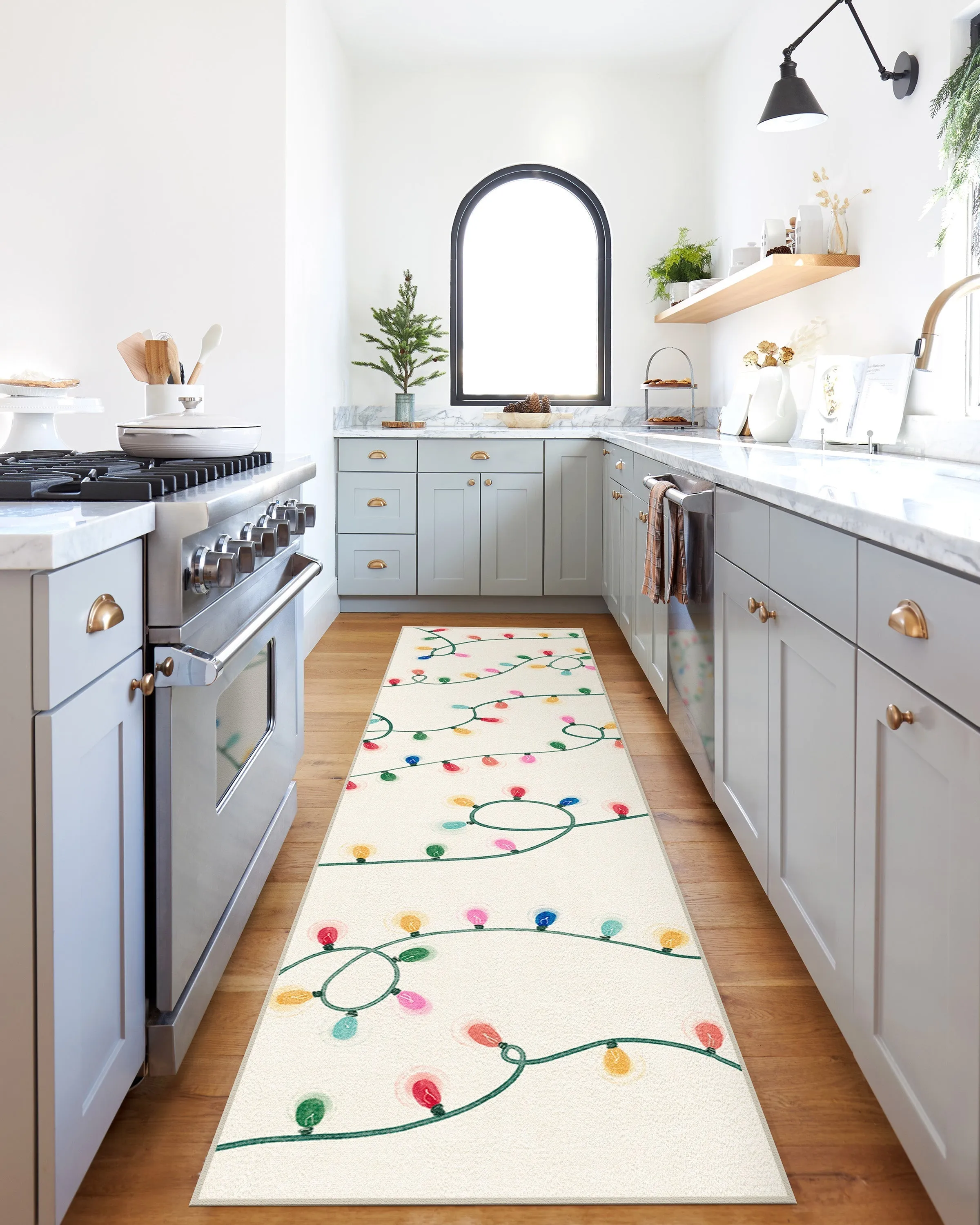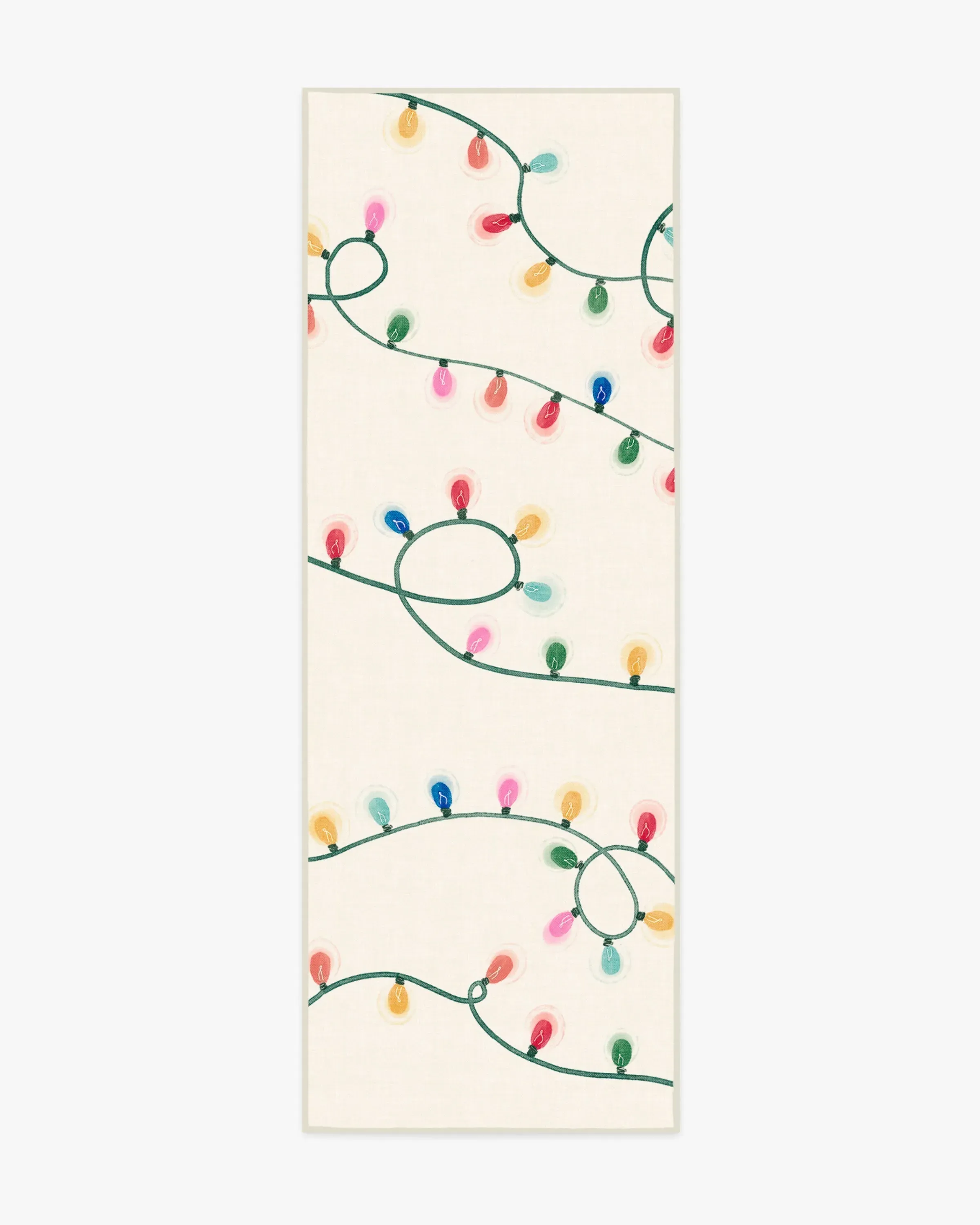 Bring cheerful whimsy to all who enter with the Let It Glow Cream Multicolour Rug. Strung with colourful festive string lights, youâll lay the groundwork for a very merry Christmas with bold, energetic colours set against a warm, creamy background. Water-resistant, stain-resistant, and fully machine-washable. Colours may vary by device and lighting. 60x90 | Machine Washable Area Rug | Kid & Pet Friendly | Indoor Rugs | Let It Glow Cream Flatwoven Rug | Ruggable