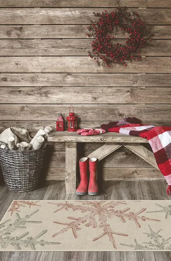 The area rug features delicate snowflakes in sage green and farmhouse red that float against a creamy background. Its low-pile chenille construction provides water-resistant and stain-resistant properties, while the machine-washable design offers easy maintenance. The flatwoven structure ensures durability and comfort underfoot. W60 x D90 cm