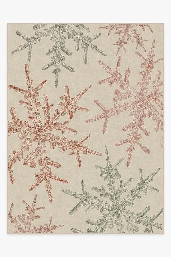 An elevated holiday design. Our classic Snowflake Creme Rug displays delicate snowflakes coloured in sage green and farmhouse red that float lightly against a creamy sky, resulting in a stunning accent piece to celebrate the richness of your seasonal decor. Made from our water-resistant, stain-resistant, and machine-washable low-pile Chenille material. 60x90 | Machine Washable Area Rug | Kid & Pet Friendly | Indoor Rugs | Snowflake Creme Flatwoven Rug | Ruggable