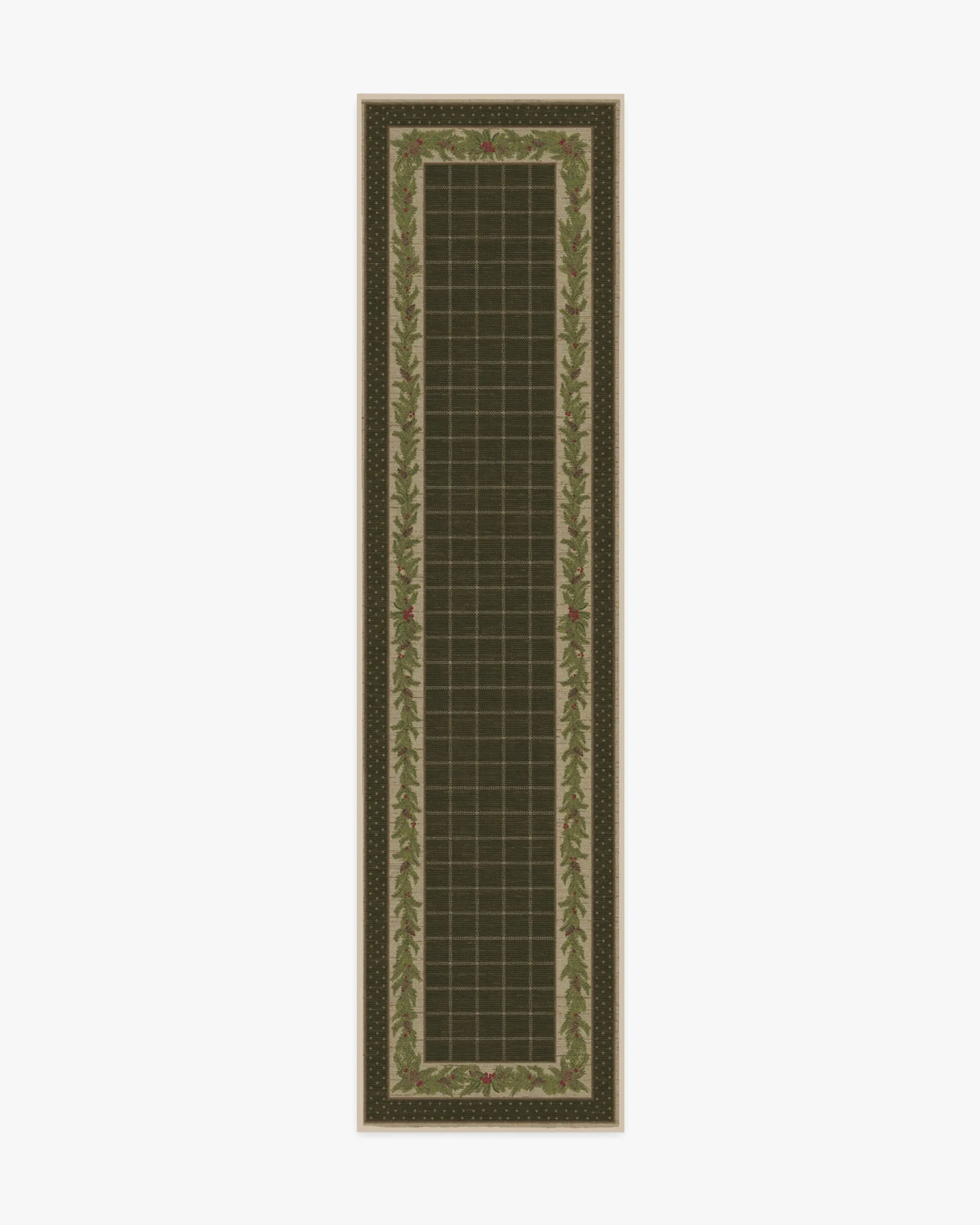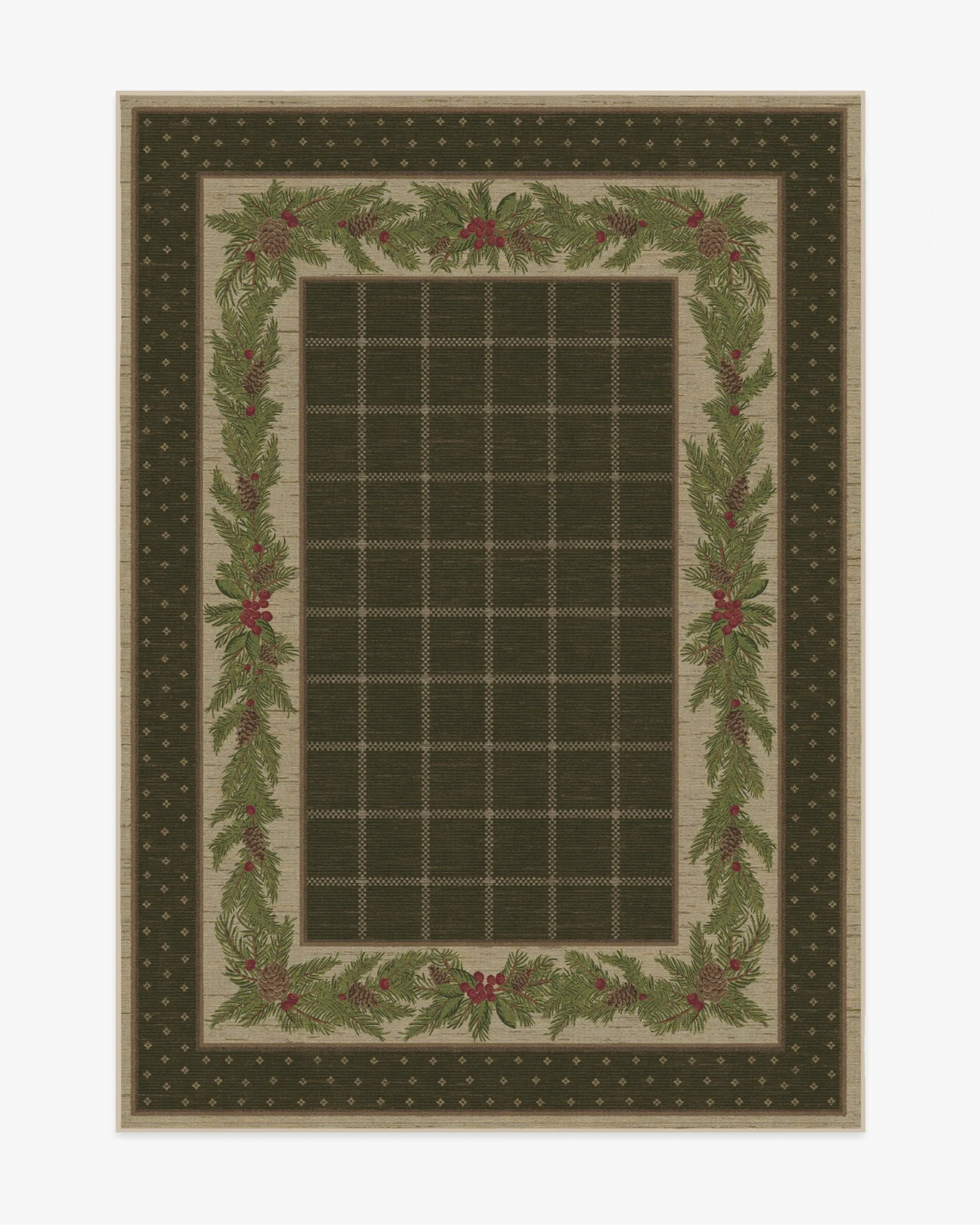 Our Pine Border Dark Olive Rug is the perfect centrepiece for festive celebrations. Inspired by traditional Christmas decor, this winter design features a seasonal, pine border with hints of holly berries and delicate filigree, elegantly framed by an outer decorative foulard border and a chequered field. The colour palette showcases dark olive green tones complemented by warm neutrals and bright pine greens, accented with pops of berry hues. Water-resistant, stain-resistant, and machine-washable. Rug colours may vary slightly according to your device and the lighting in your space. 60x90 | Machine Washable Area Rug | Kid & Pet Friendly | Indoor Rugs | Pine Border Dark Olive Rug Green | Ruggable