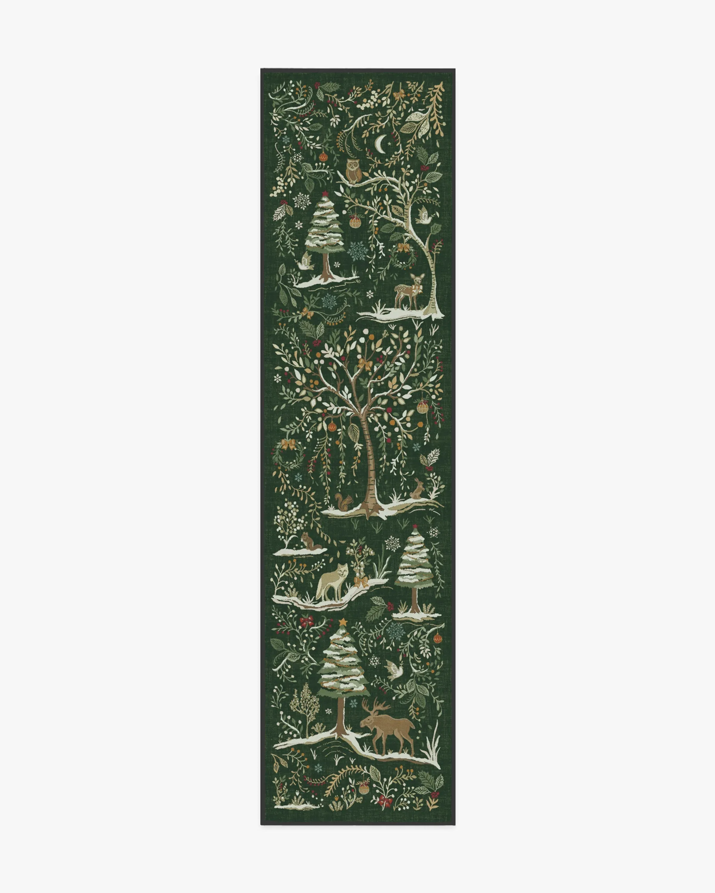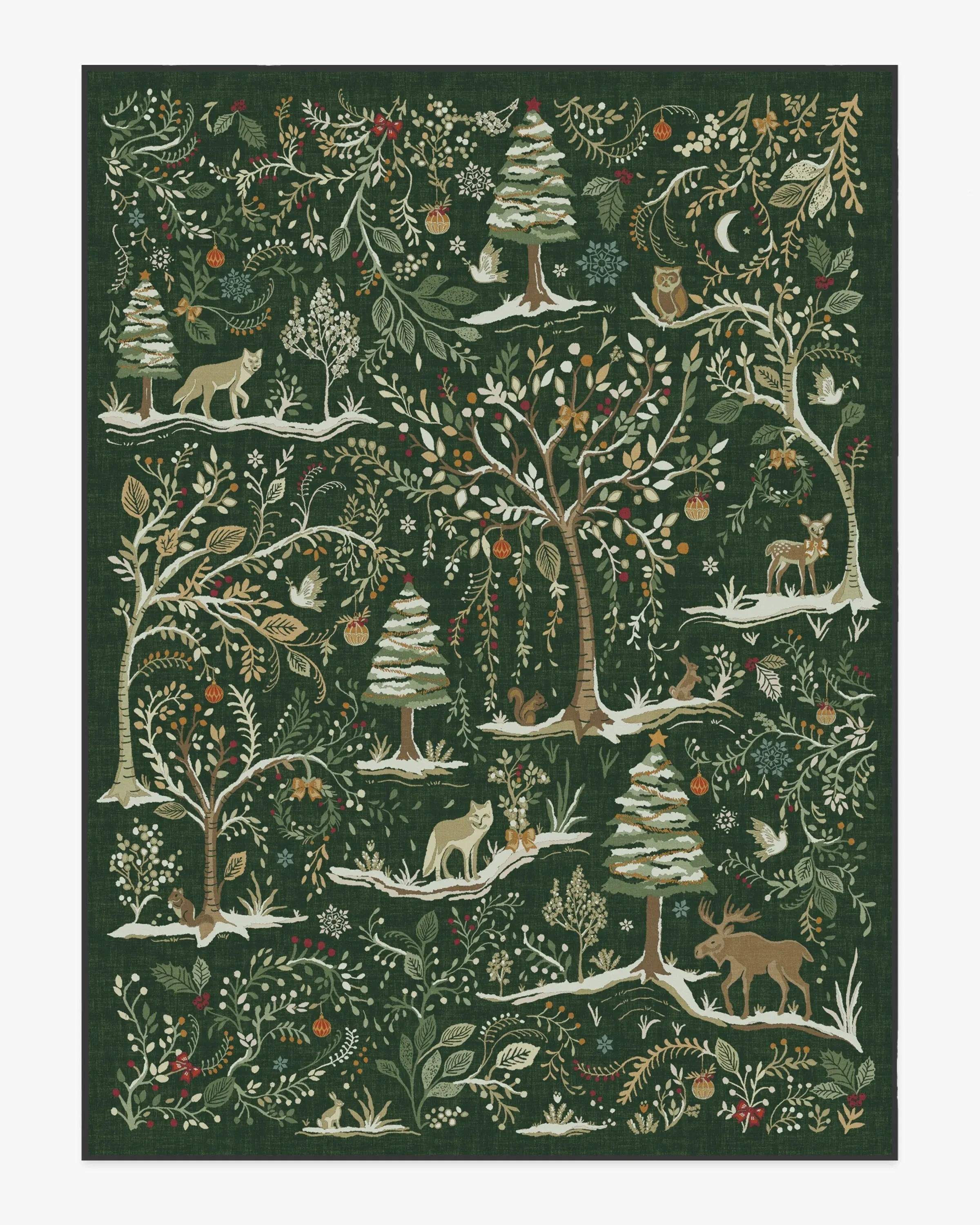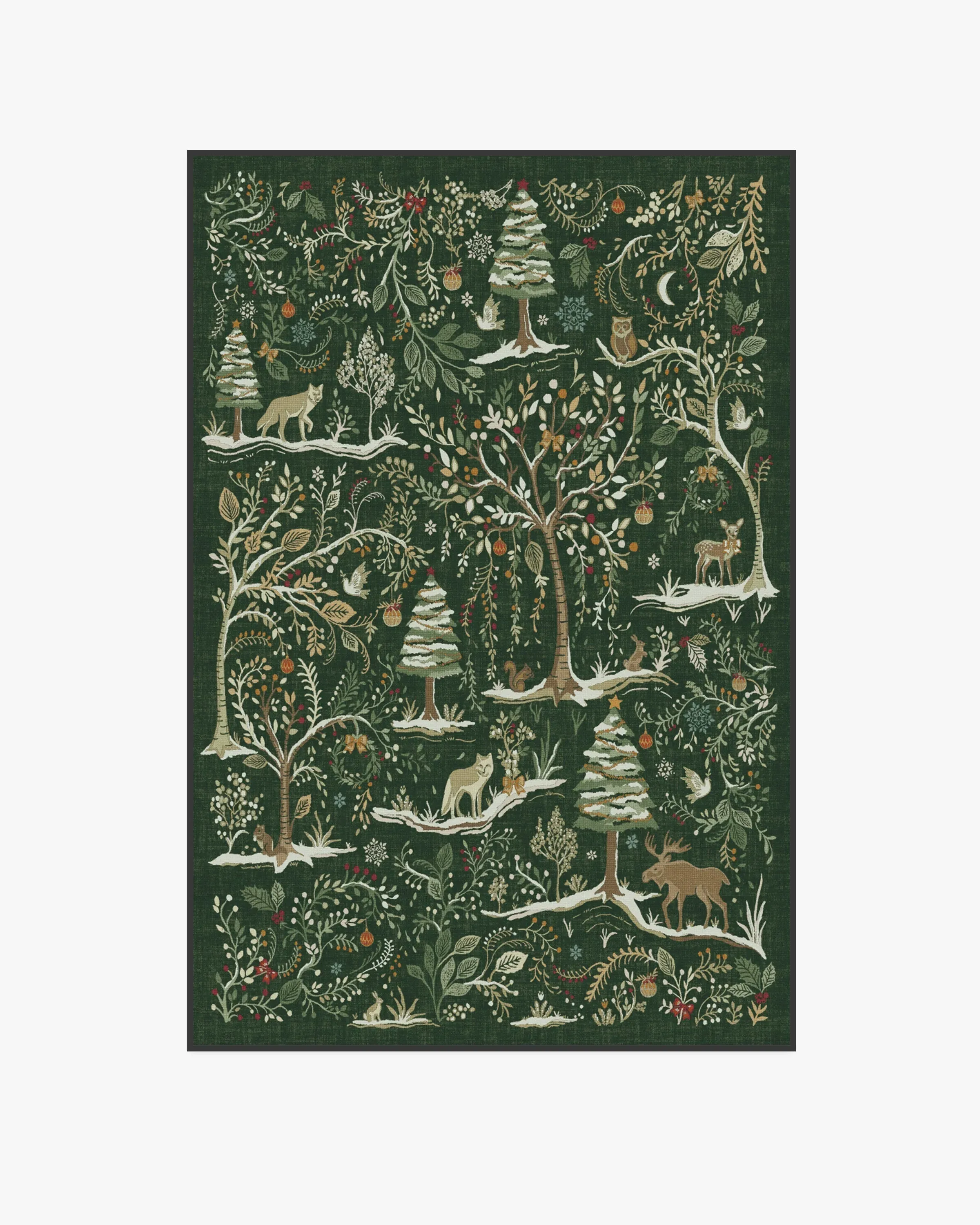 Walk onto a winter wonderland with our Elwood Forest Green Rug. This whimsical design features a snowy forest filled with woodland animals, pine trees, birch trees, and winter foliage. Seasonal touches like bows, wreaths, holly, and garland are all set against a backdrop of gently falling snowflakes. The forest green background is beautifully complemented by soft sage and warm neutral motifs, accented with pops of red, gold, and light cream details. Water-resistant, stain-resistant, and machine-washable. Rug colours may vary slightly according to your device and the lighting in your space. 60x90 | Machine Washable Area Rug | Kid & Pet Friendly | Indoor Rugs | Elwood Forest Green Rug | Ruggable