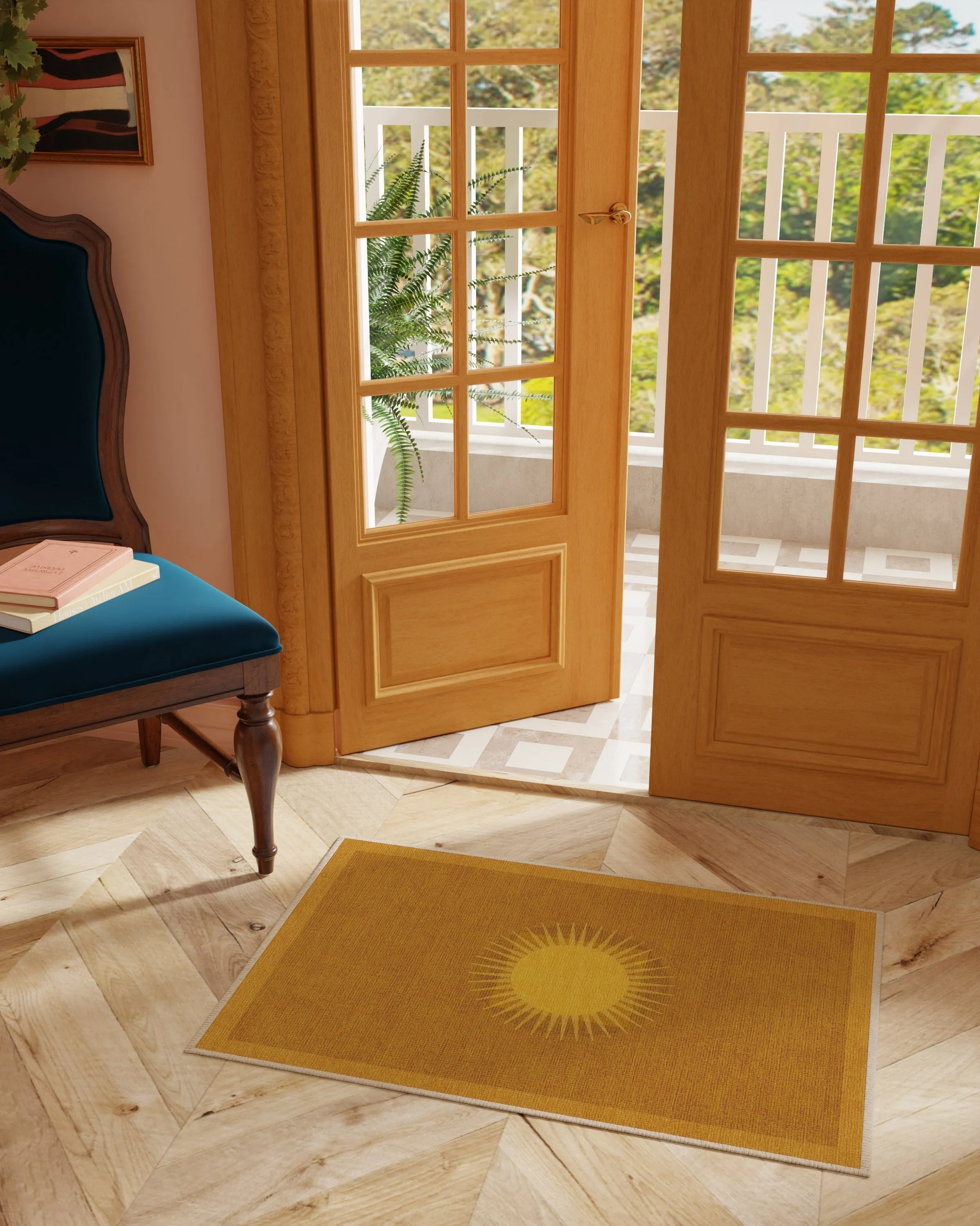 The Helios Gold Area Rug features warm minimalist shapes with a retro aesthetic, combining a light yellow border and warm yellow medallion against a deep ochre background. Its flatwoven construction provides durability, while the water-resistant and stain-resistant properties ensure easy maintenance. The machine-washable design offers convenience for busy households, and the pet-friendly materials make it suitable for homes with animals. W60 x D90 cm
