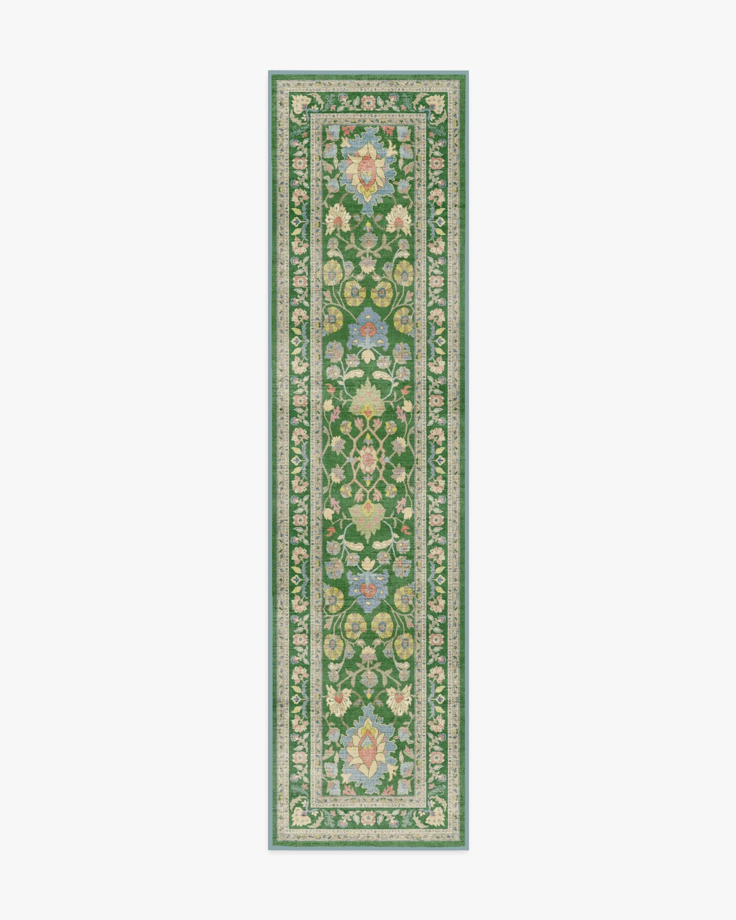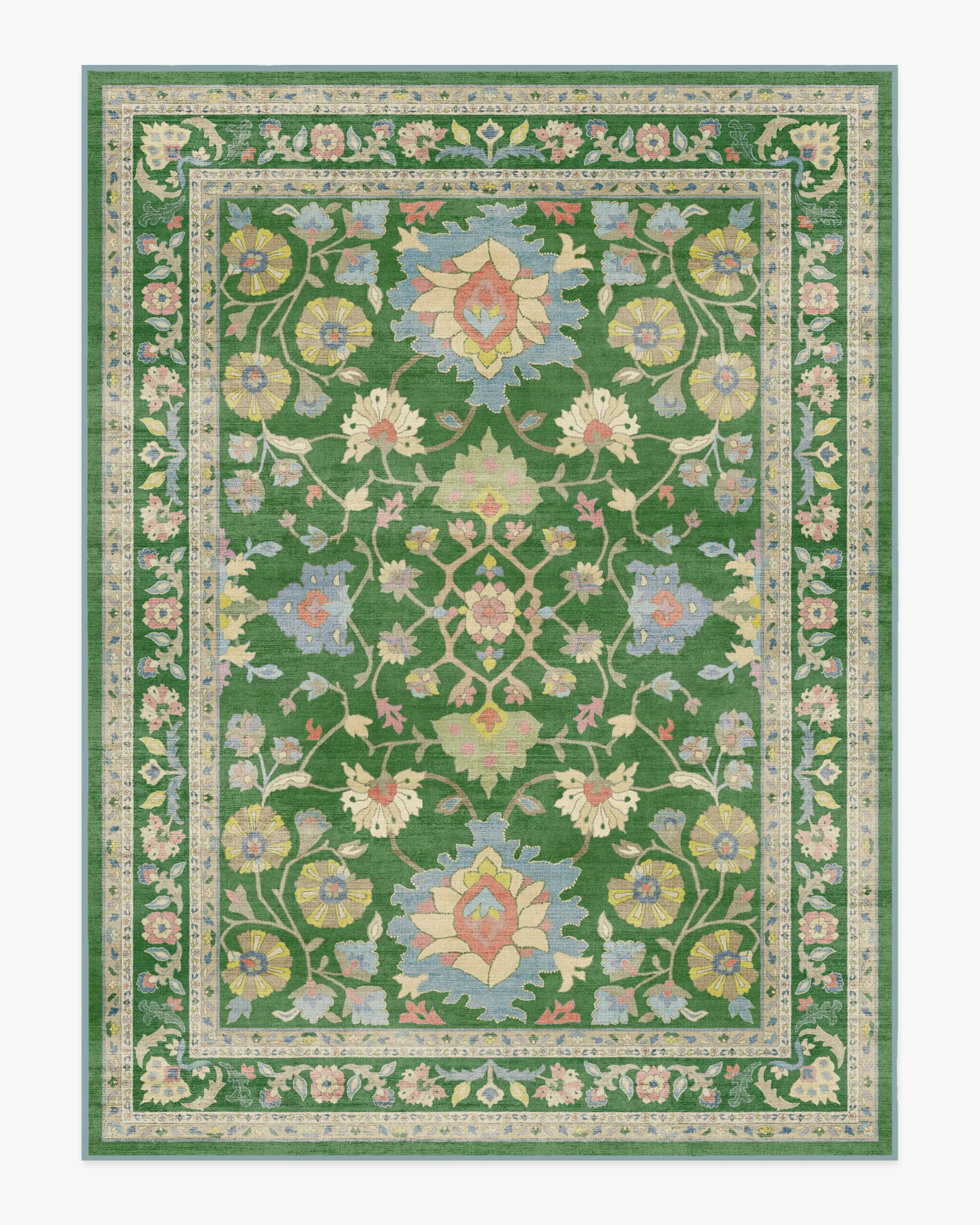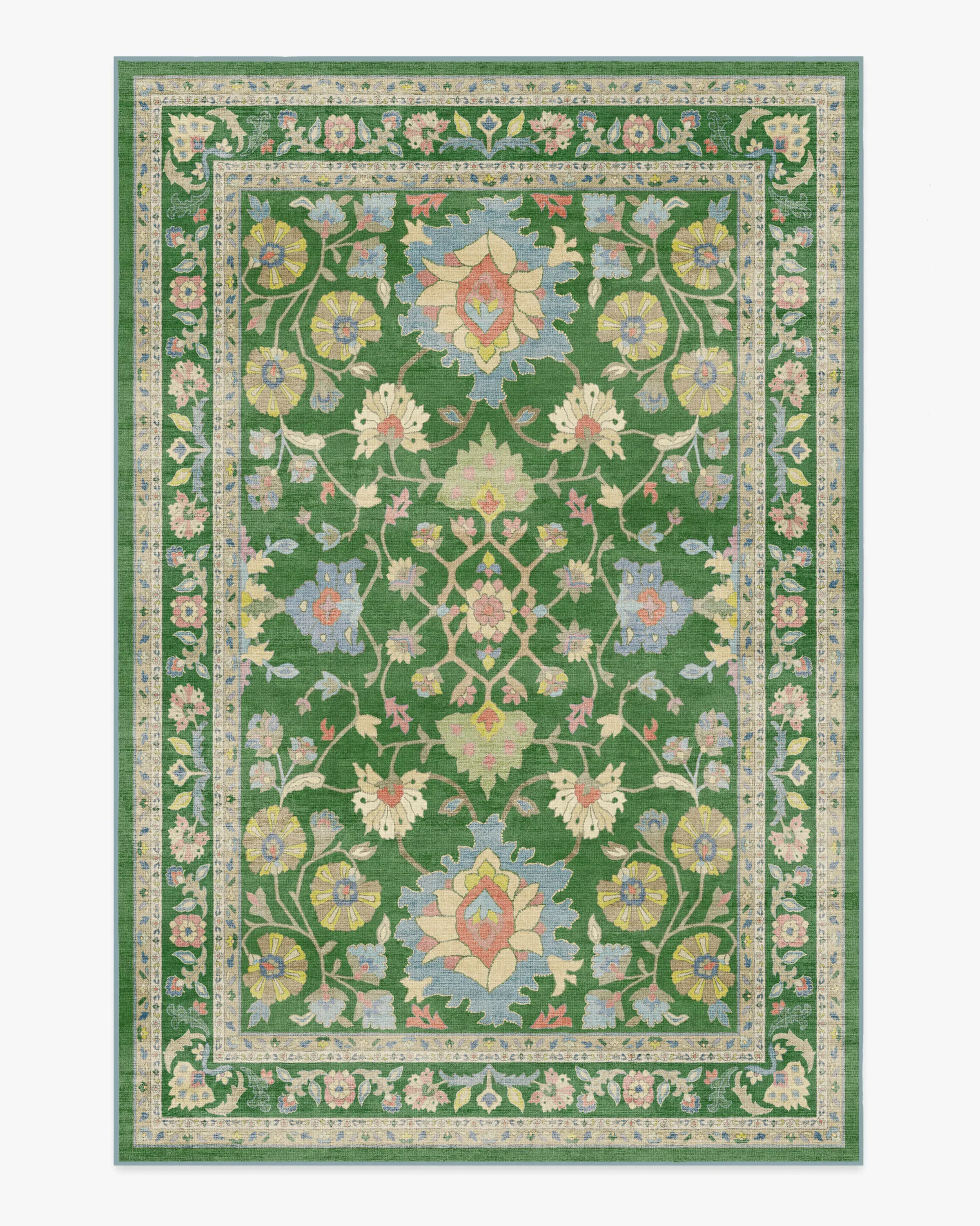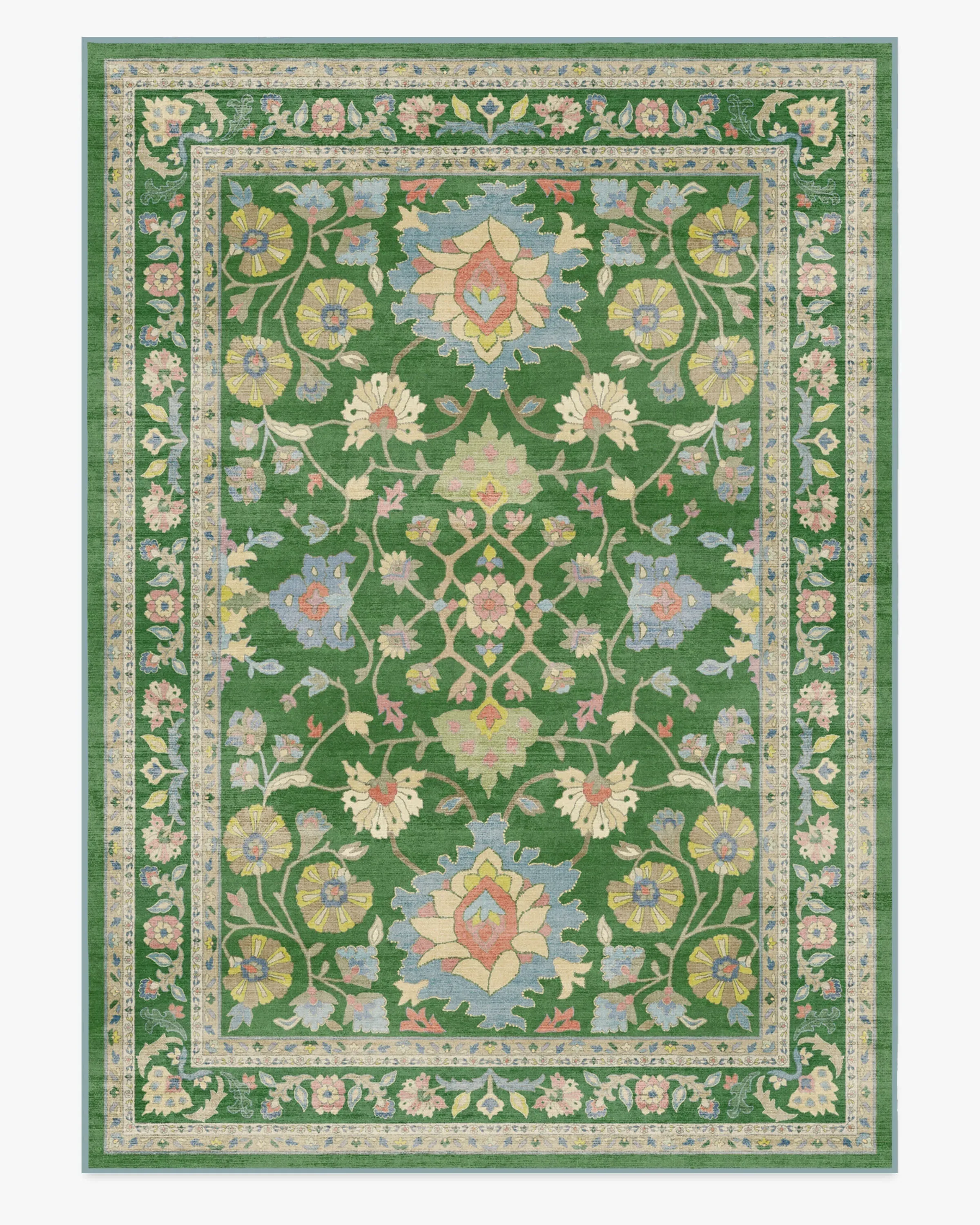 Show your bolder side with the Calabria Green Rug. This vintage, Persian-inspired style showcases mirrored floral motifs, delicate detailing, and ornate borders. A vibrant kelly green backdrop sets the stage for coral, periwinkle, and golden yellow accents, all softened by distressed textures and needlepoint-inspired depth. Water-resistant, stain-resistant, and machine-washable. Colours may vary by device and lighting. 60x90 | Machine Washable Area Rug | Kid & Pet Friendly | Indoor Rugs | Calabria Green Rug | Ruggable