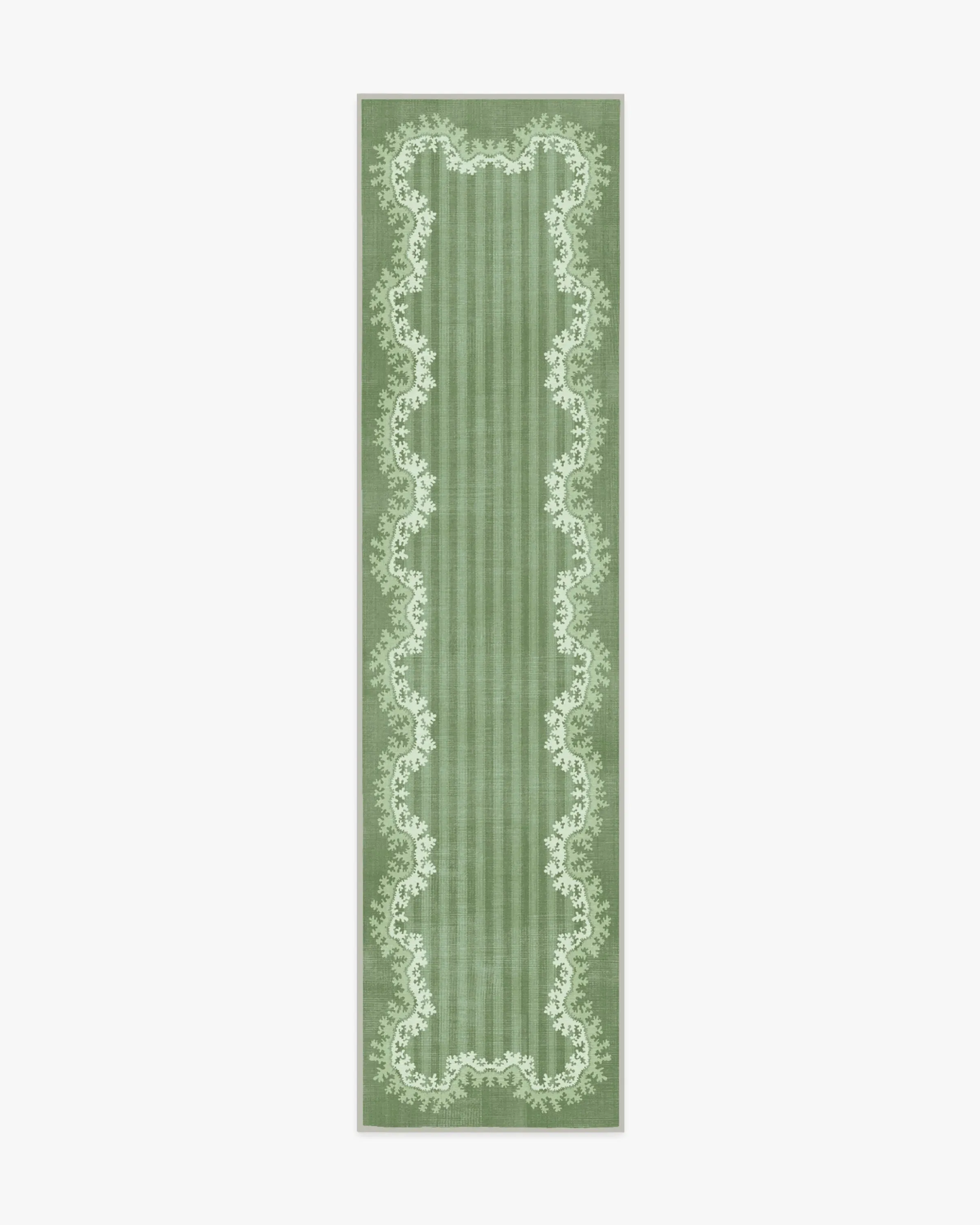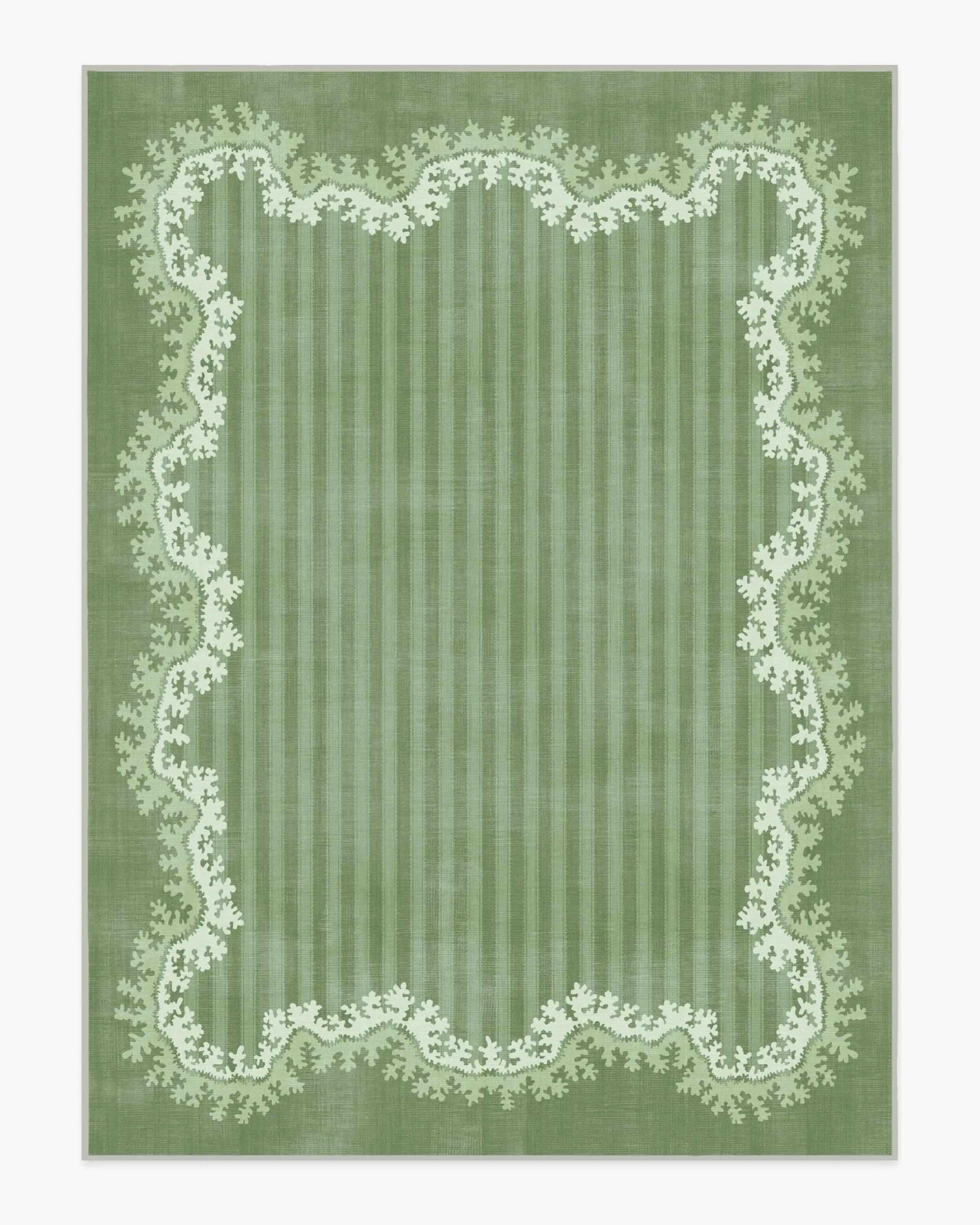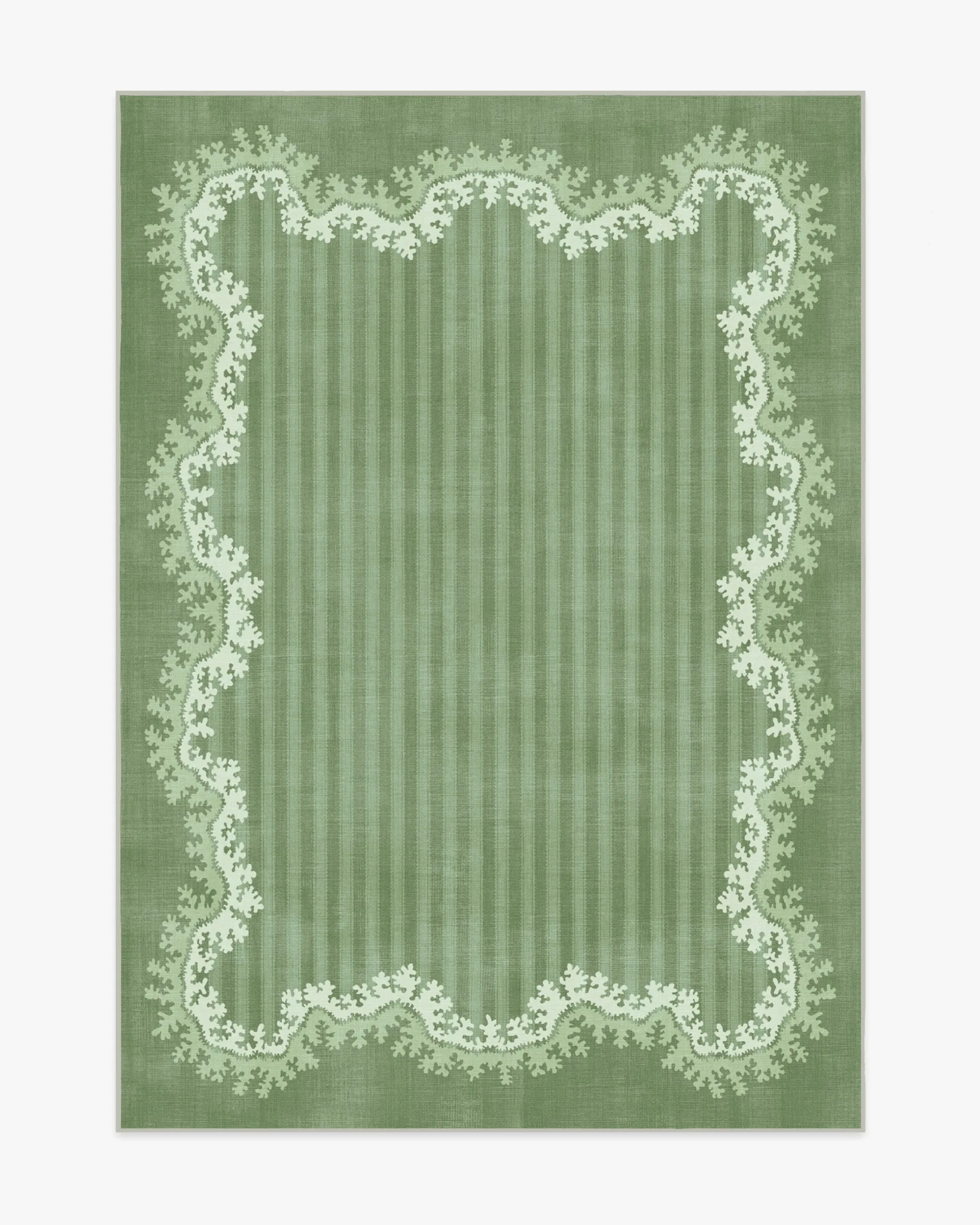 Let imagination in with our Sanderson Oxbow Botanical Green Rug. Referencing Sandersonâs Oxbow pattern, a stylised river design, this rug features tonal stripes and a contrasting organic border that beautifully frames the motif. Shades of green ranging from minty sages to deep evergreens add depth and dimension to the background. Water-resistant, stain-resistant, and machine-washable. Rug colours may vary slightly according to your device and the lighting in your space. 60x90 | Machine Washable Area Rug | Kid & Pet Friendly | Indoor Rugs | Oxbow Botanical Green Rug by Sanderson | Ruggable