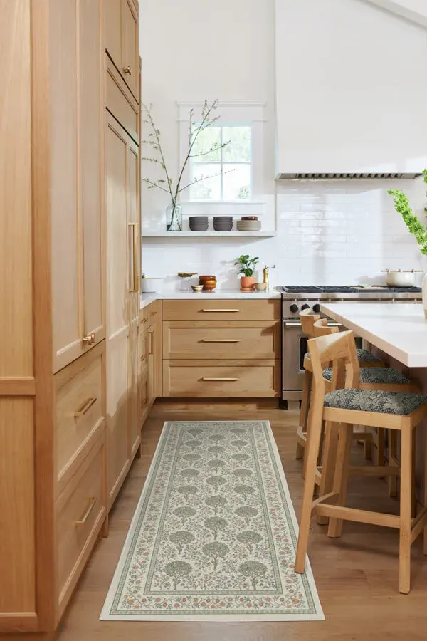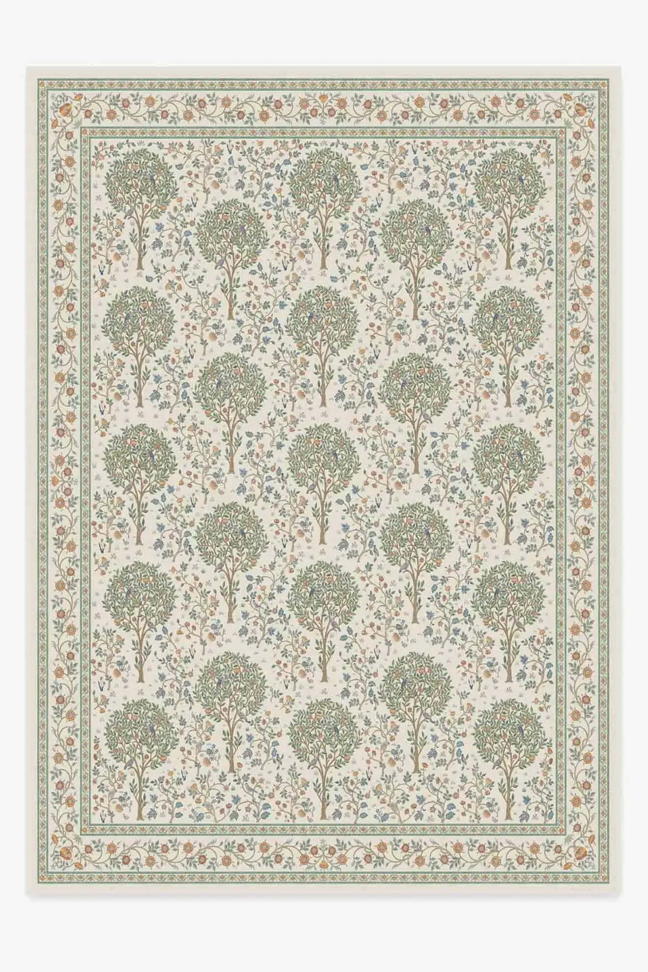 Welcome whimsy home with the Morris & Co. Kelmscott Tree Green Rug. This framed rendition of the tree-studded bed curtains that graced William Morris's home, Kelmscott Manor, is the perfect addition to any contemporary cottage. The intricate illustrations of trees, flowers, birds and vines create a balanced composition with ornate detail. The creamy backdrop is brought to life with nature-inspired greens, blues, browns and oranges. Water-resistant, stain-resistant, and machine-washable. Rug colours may vary slightly according to your device and the lighting in your space. 60x90 | Machine Washable Area Rug | Kid & Pet Friendly | Indoor Rugs | Kelmscott Tree Green Flatwoven Rug by Morris & Co. | Ruggable