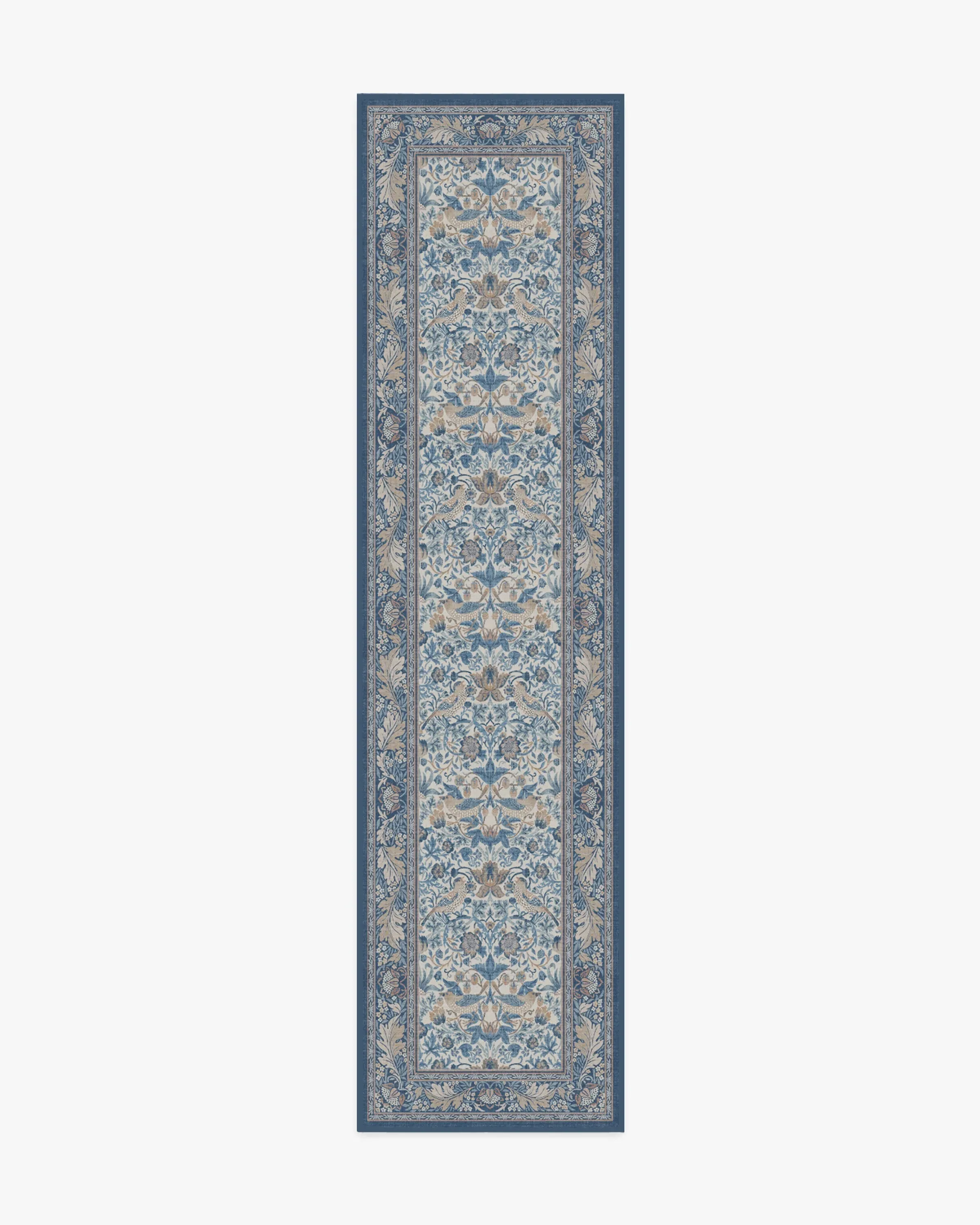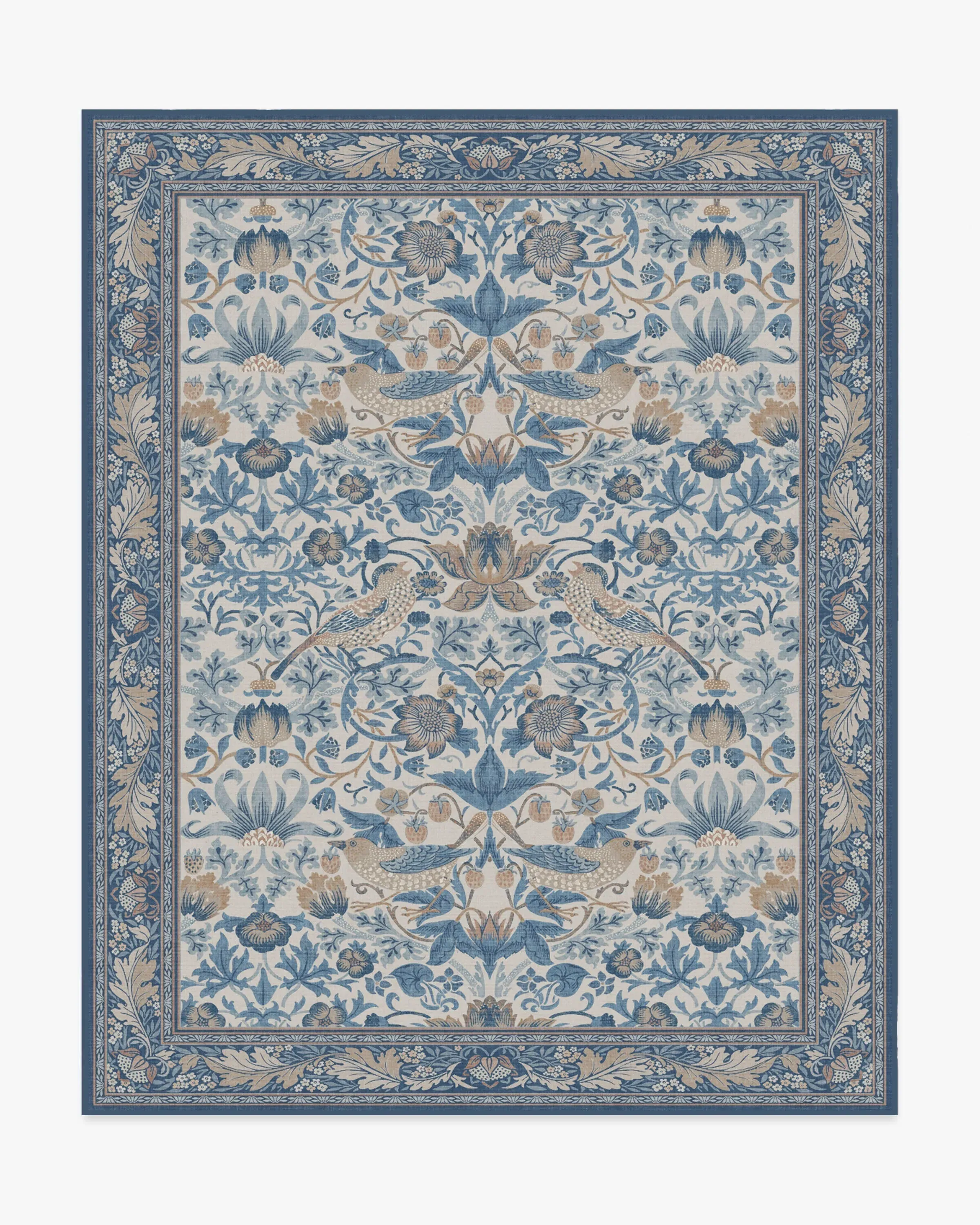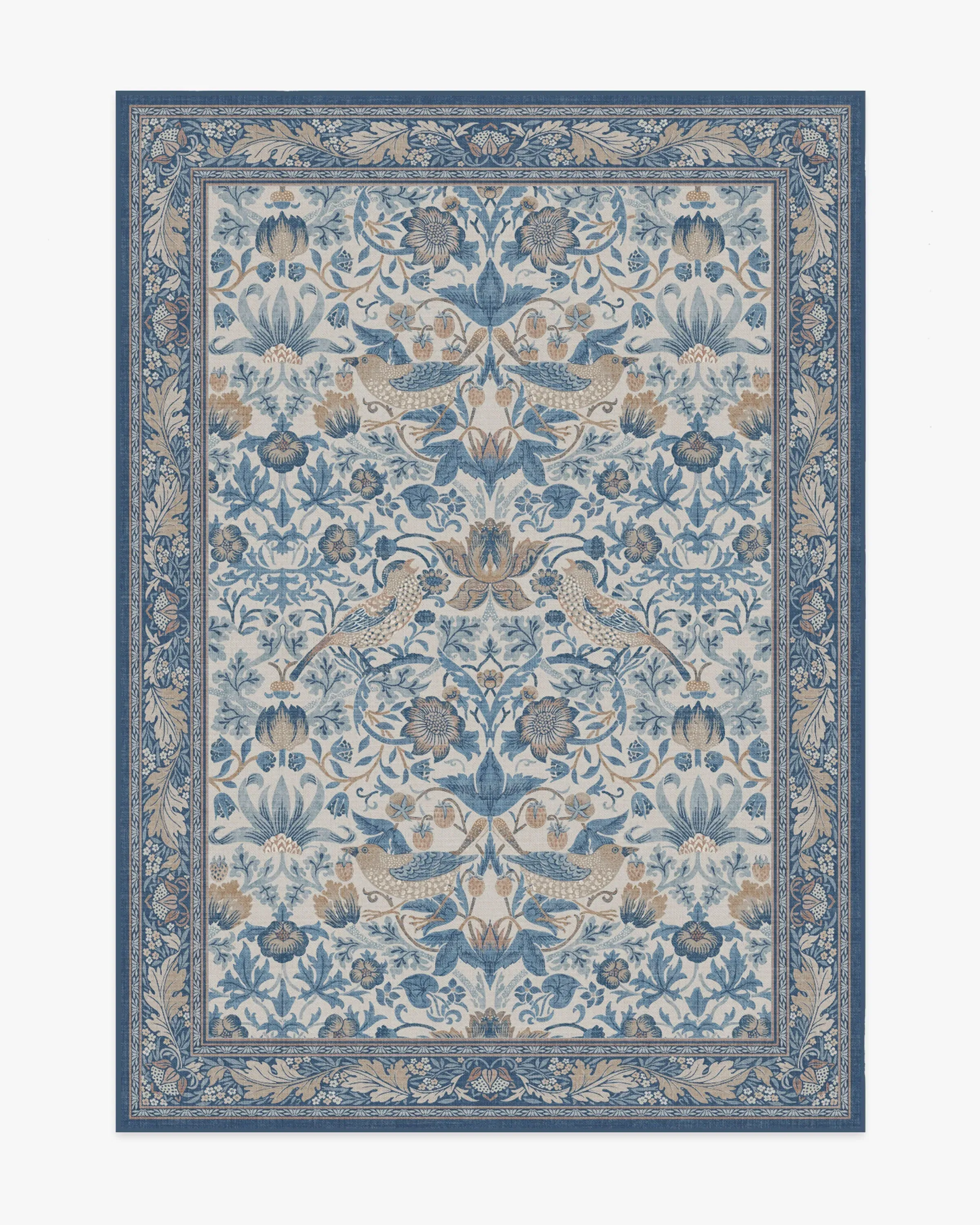 Step into Kelmscott Manor's garden with the Morris & Co. Strawberry Thief Indigo & Ivory Rug. A direct translation of William Morris's recognisable block print textile, this rug depicts Morris's thrushes stealing fruit from his kitchen garden. A classic blue and white recolour of the original design, this colourway balances warm and cool tones with indigo, delft, and dusty blues complementing taupe, ivory, and beige accents, for traditional grandeur. Water-resistant, stain-resistant, and machine-washable. Rug colours may vary slightly according to your device and the lighting in your space. 60x90 | Machine Washable Area Rug | Kid & Pet Friendly | Indoor Rugs | Strawberry Thief Indigo & Ivory Flatwoven Rug by Morris & Co. | Ruggable