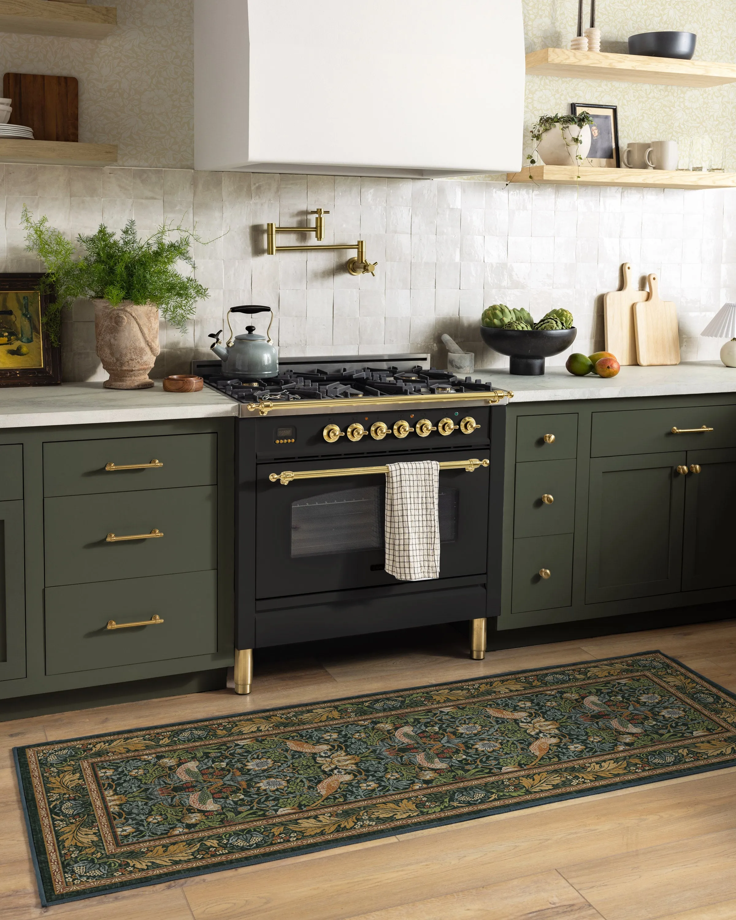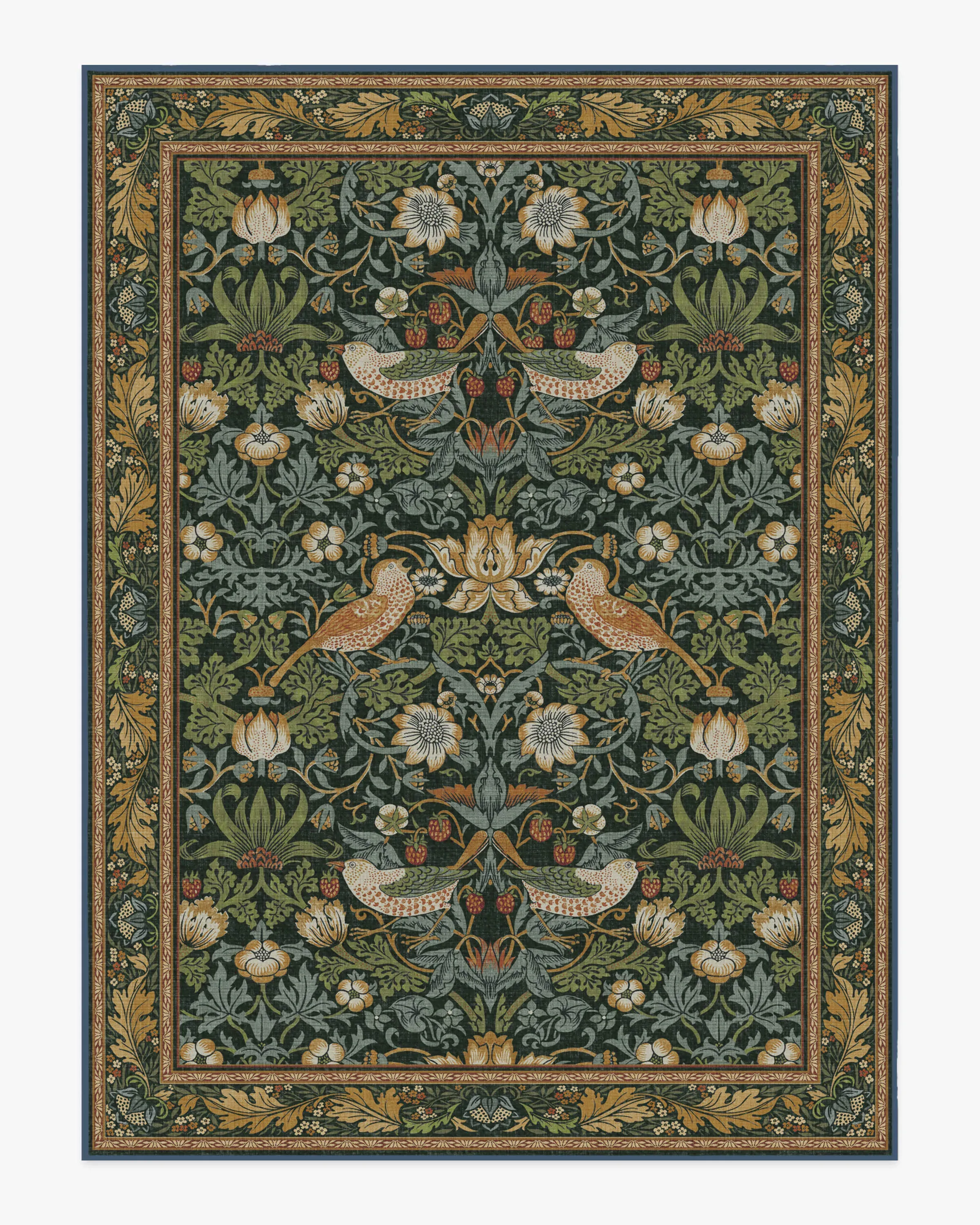 Step into Kelmscott Manor's garden with the Morris & Co. Strawberry Thief Indigo Rug. A direct translation of William Morris's recognisable block print textile, this rug depicts Morris's thrushes stealing fruit from his kitchen garden. A nod to the original design, this colourway contrasts deep indigo with fresh reds, mossy greens, and golden highlights, leaving a grand impact. Water-resistant, stain-resistant, and machine-washable. Rug colours may vary slightly according to your device and the lighting in your space. 60x90 | Machine Washable Area Rug | Kid & Pet Friendly | Indoor Rugs | Strawberry Thief Indigo Flatwoven Rug by Morris & Co. | Ruggable