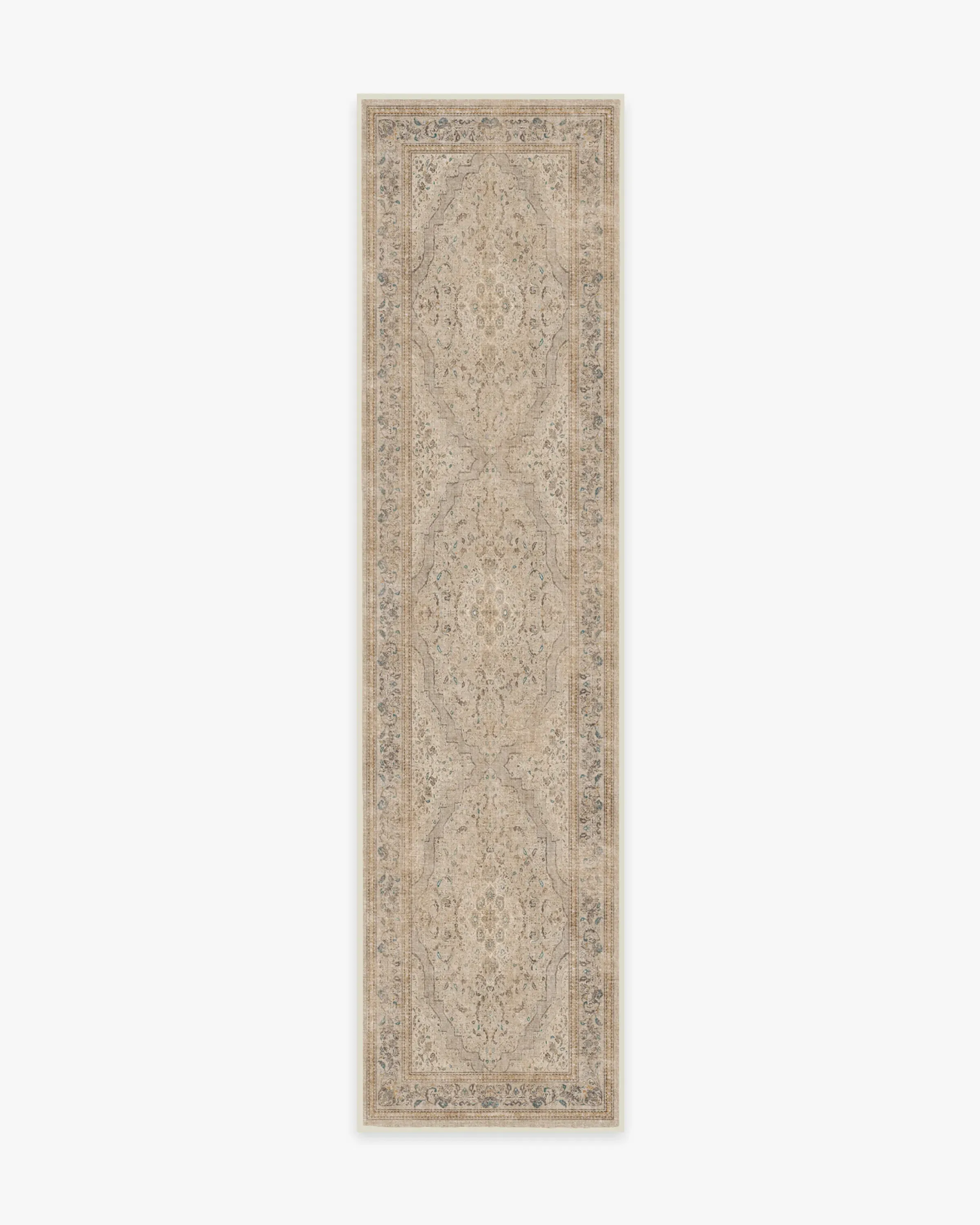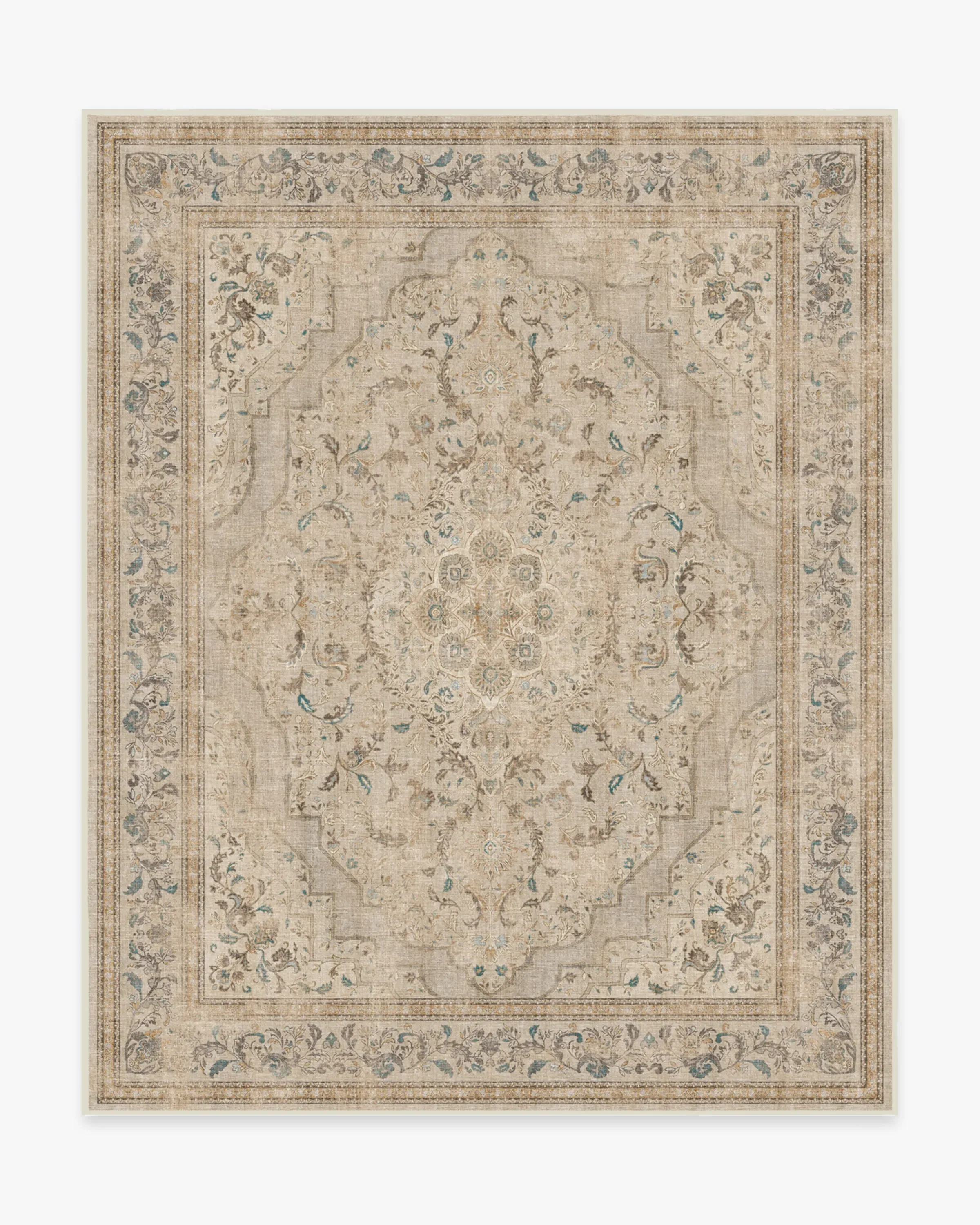 Inspired by classic European rug patterns, our Adeline Ivory Opal Rug features a gently distressed diamond medallion with ornate corners and borders in warm dark brown and tan and highlighted with bright pops of blue, dark teal, and golden yellow. Made from our water-resistant, stain-resistant, and machine-washable low-pile Chenille material. 60x90 | Machine Washable Area Rug | Kid & Pet Friendly | Indoor Rugs | Adeline Ivory Opal Rug | Ruggable
