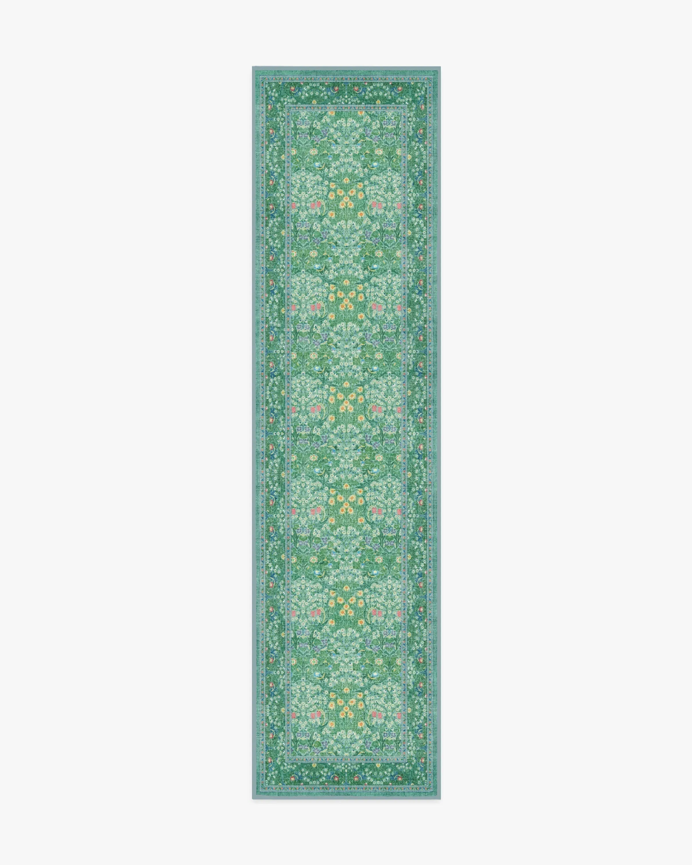 Fall in love with our whimsical Morris & Co. Blackthorn Multicolour Jade Rug. Originally designed for wallpaper by John Henry Dearle in 1892, this intricate weave of blossoms, blooms, and vines layers pops of bold pinks, sunshine yellows, playful greens, and vibrant blues for a cheerful composition. We have reimagined the classic pattern to include a border that anchors the design with a touch of formality and visual order. Water-resistant, stain-resistant, and machine-washable. Rug colours may vary slightly according to your device and the lighting in your space. 60x90 | Machine Washable Area Rug | Kid & Pet Friendly | Indoor Rugs | Blackthorn Jade Rug by Morris & Co. | Ruggable