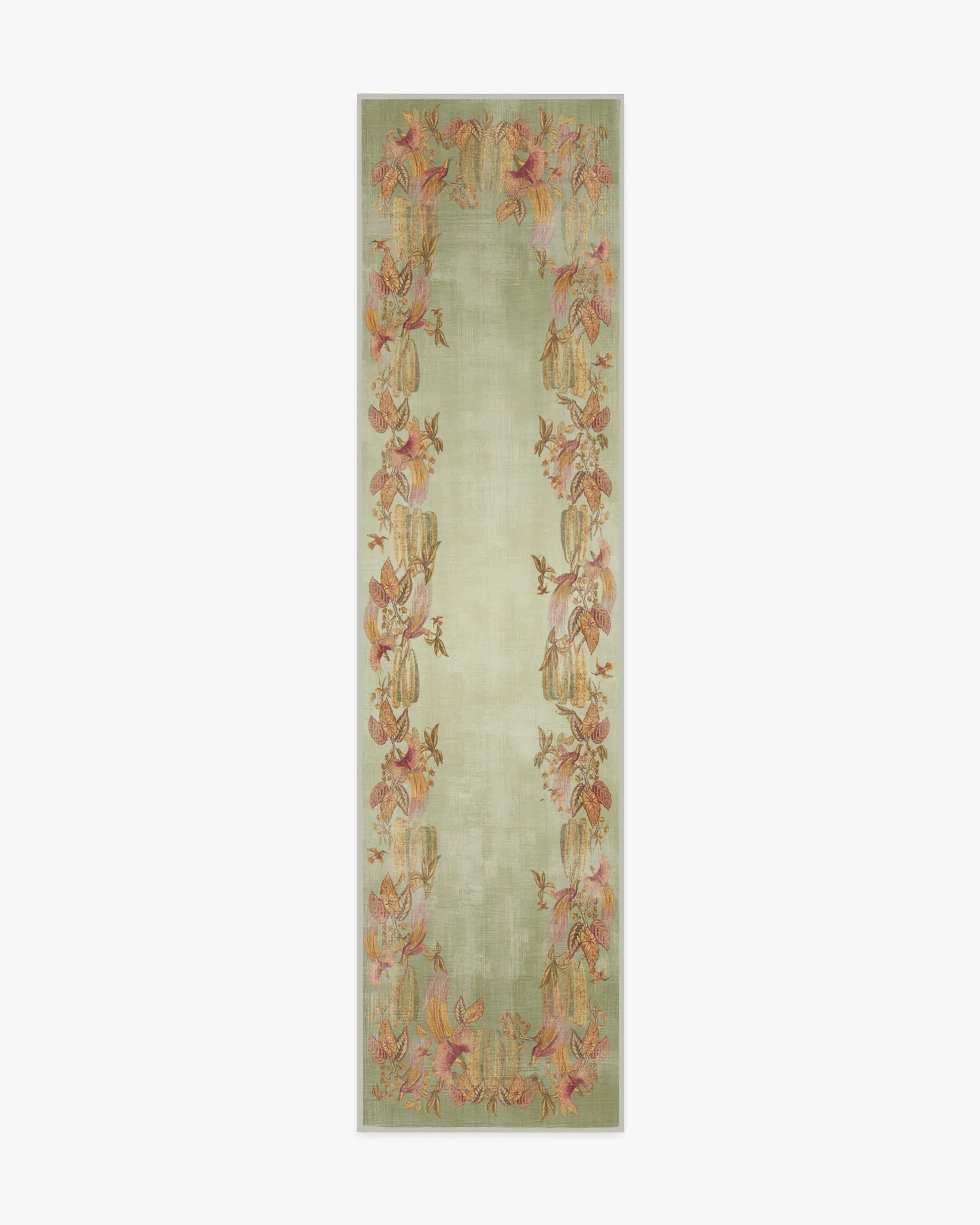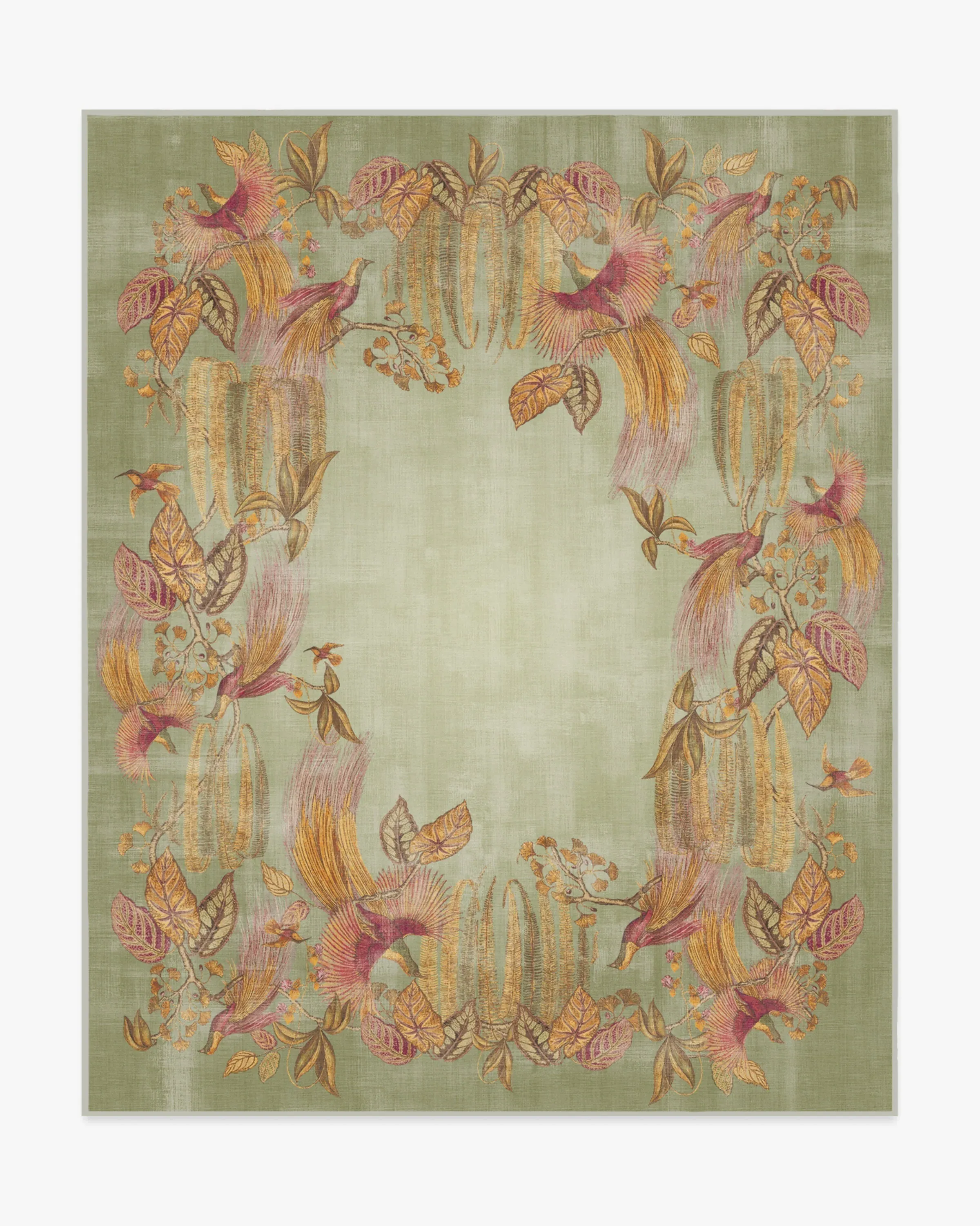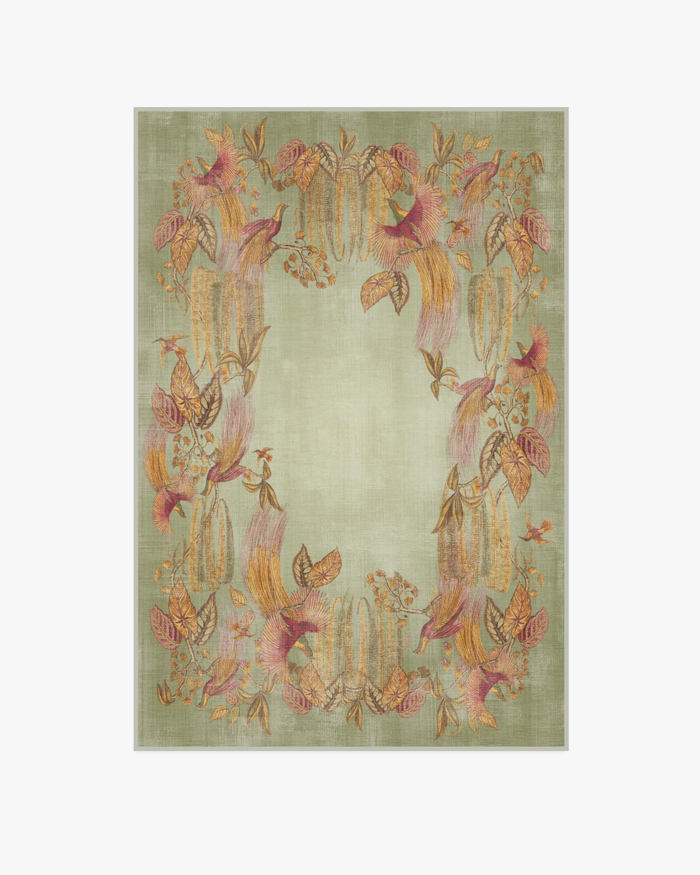 Welcome whimsy with our Sanderson Bird of Paradise Silver Fern Rug. Inspired by Sanderson's Bird of Paradise pattern, this design features motifs of birds, orchids, foliage, and feathers that evolve into an organic border. The palette beautifully blends shades of magenta, pink, green, yellow, and brown against a subtle gradient sage background. Water-resistant, stain-resistant, and machine-washable. Rug colours may vary slightly according to your device and the lighting in your space. 60x90 | Machine Washable Area Rug | Kid & Pet Friendly | Indoor Rugs | Bird of Paradise Silver Fern Rug by Sanderson | Ruggable