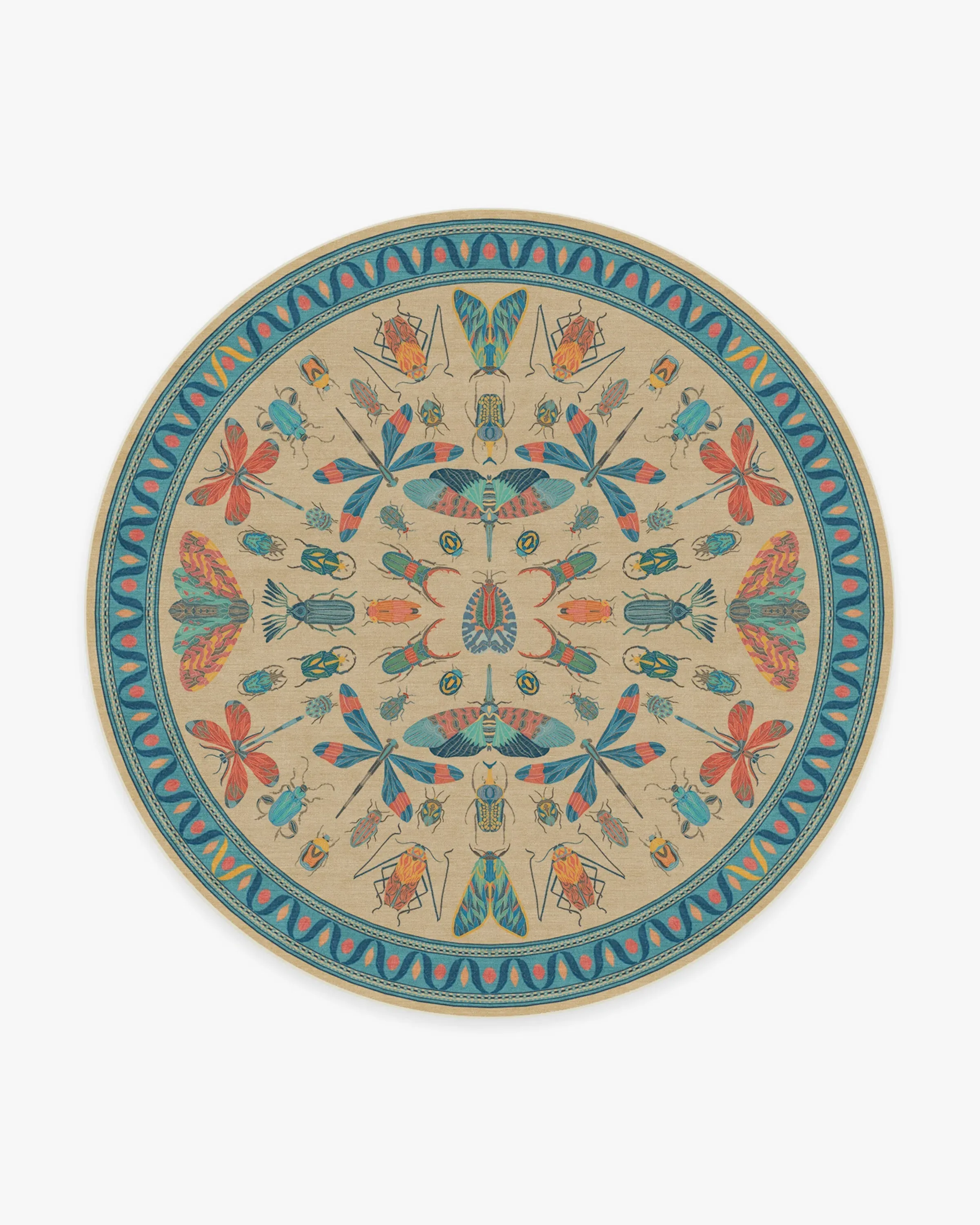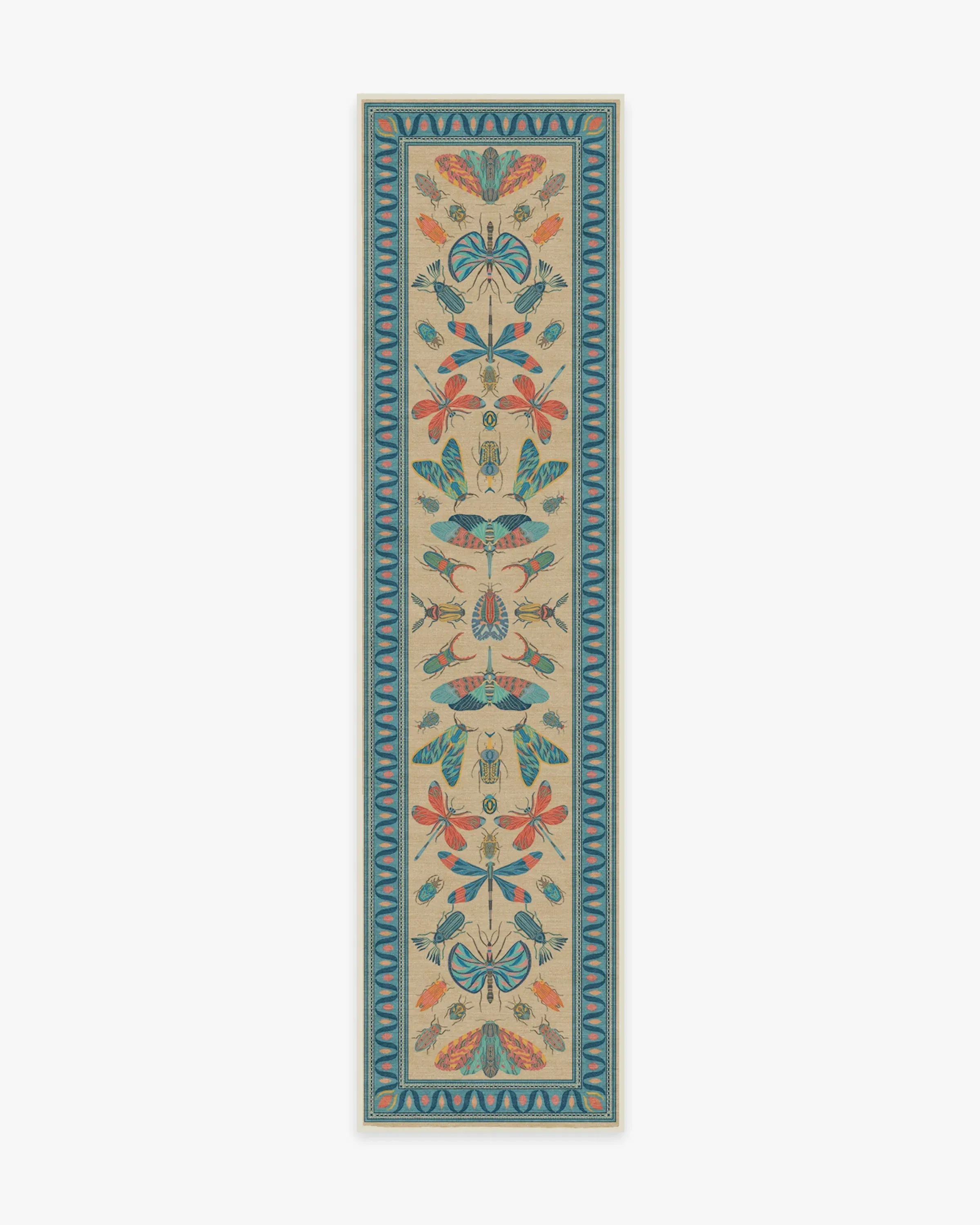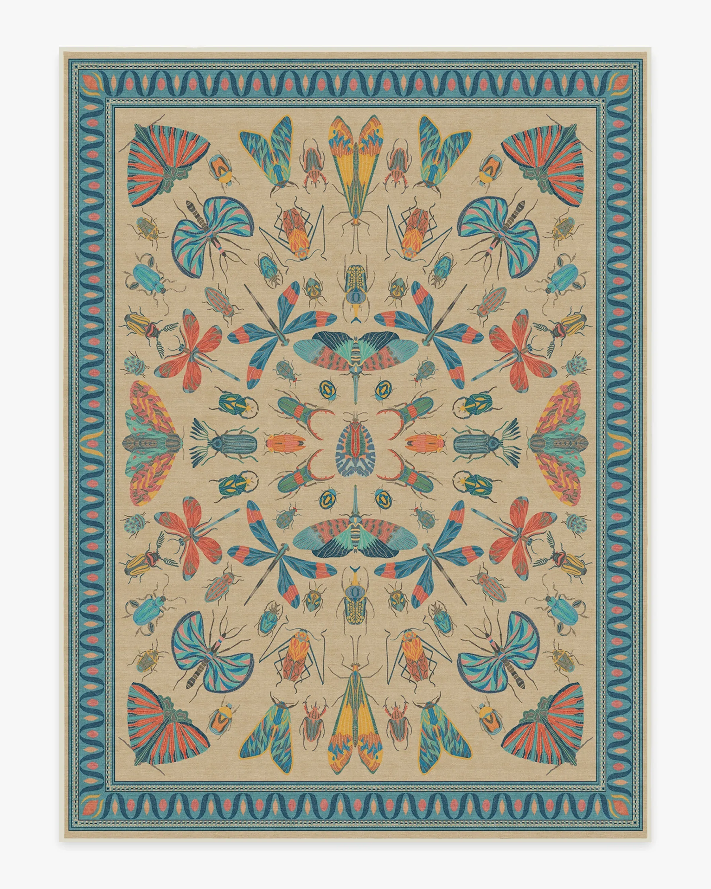 It's a bug's life. Our Iris Apfel Flutterby Multicolour Rug showcases a diverse mix of extravagant insects in candy pink, coral, and shades of blue. Brightly coloured in a spring palette, this intricate design is inspired by the fashion icon's unique and bold sense of style. Look for fluttering butterflies near the zigzag aqua border, all complemented by a gentle nude background. Made from our water-resistant, stain-resistant, and machine-washable low-pile Classic material. Our Classic Rugs are woven from a velvety smooth chenille yarn. Rug colours may vary slightly according to your device and the lighting in your space. 60x90 | Machine Washable Area Rug | Kid & Pet Friendly | Indoor Rugs | Flutterby Multicolor Flatwoven Rug by Iris Apfel | Ruggable