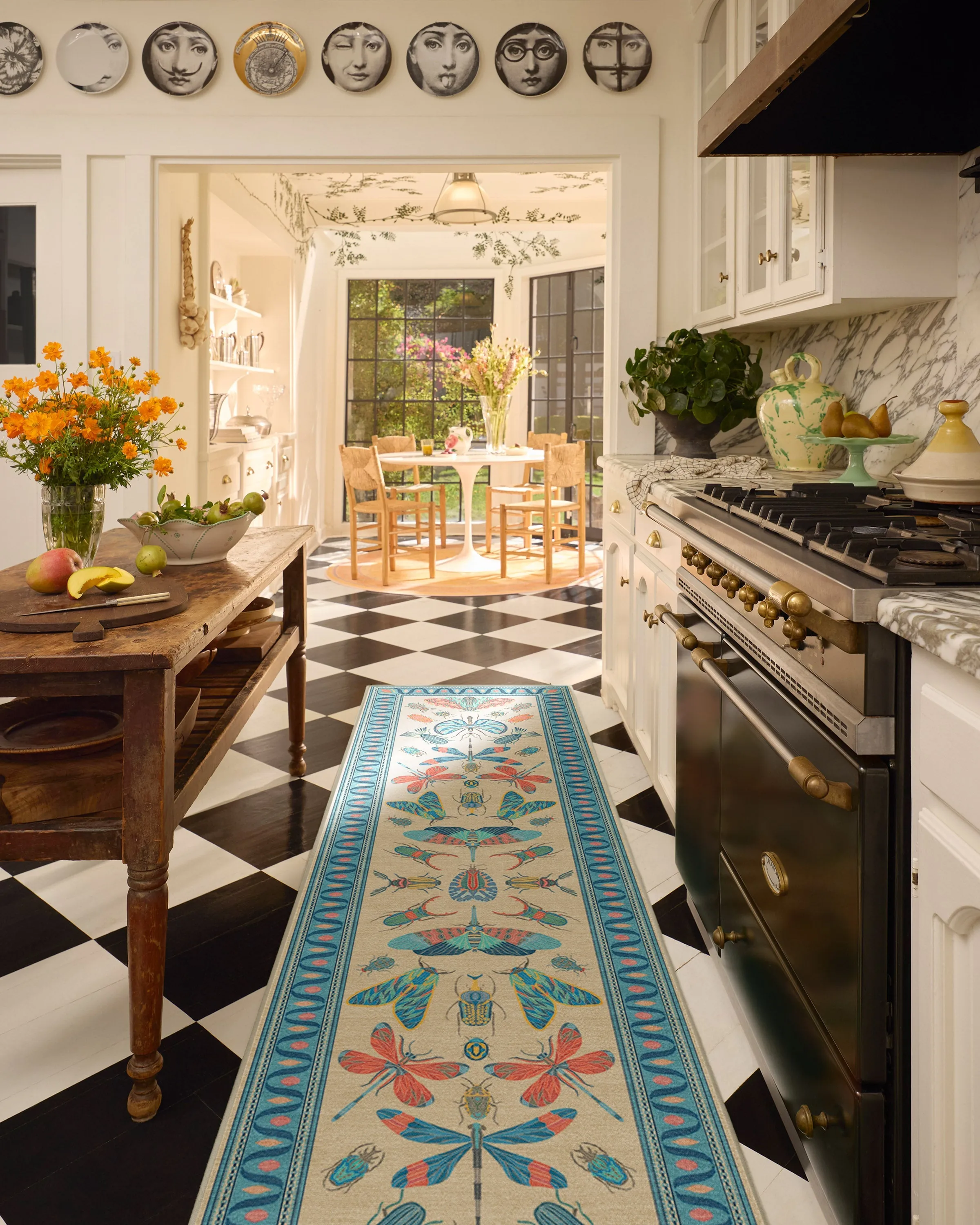 The Flutterby Area Rug features a vibrant insect design in candy pink, coral, and blue tones against a nude background. Its water-resistant and stain-resistant construction provides durability, while the machine-washable low-pile material offers easy maintenance. The flatwoven chenille yarn creates a velvety smooth texture with zigzag aqua borders. W60 x D90 cm.