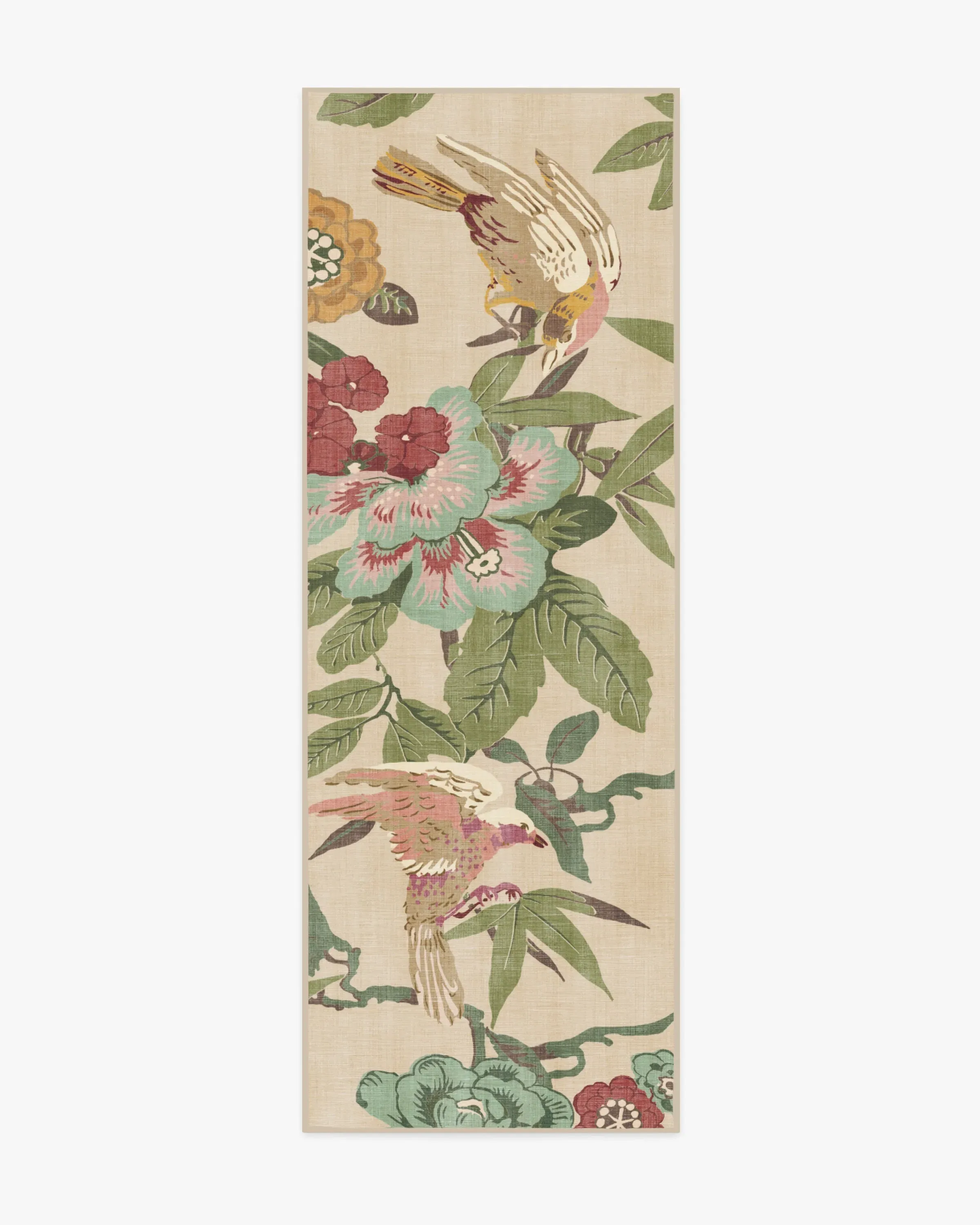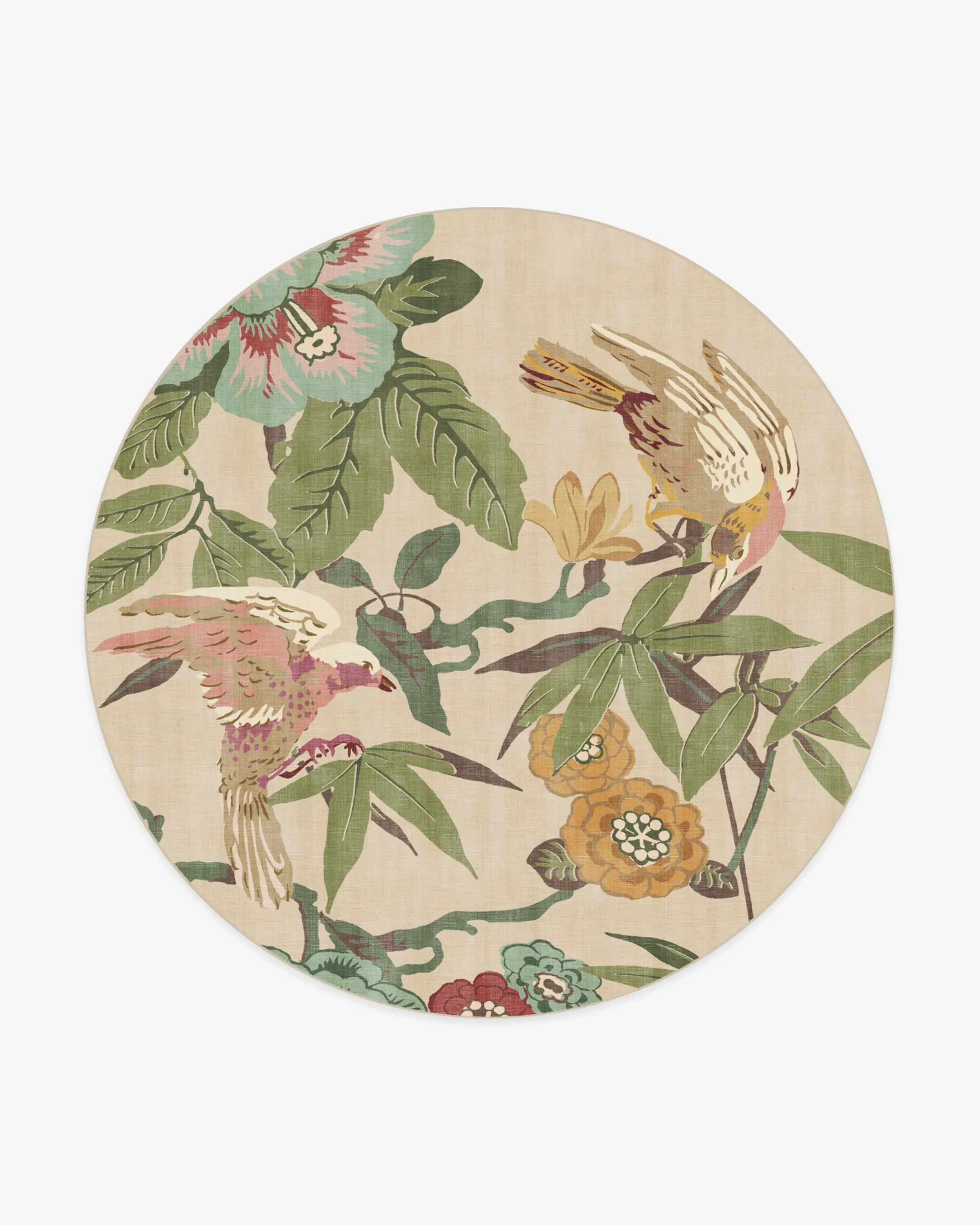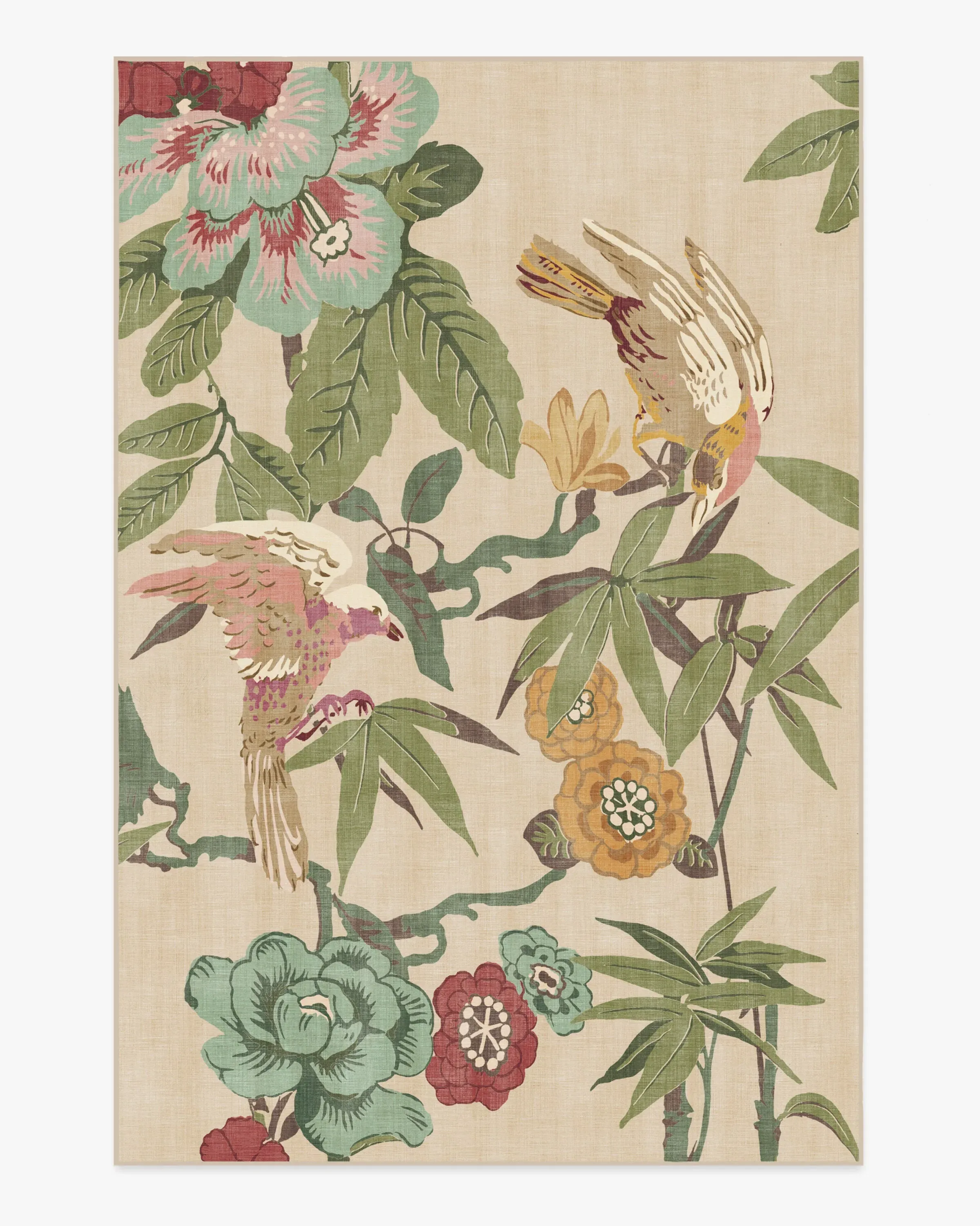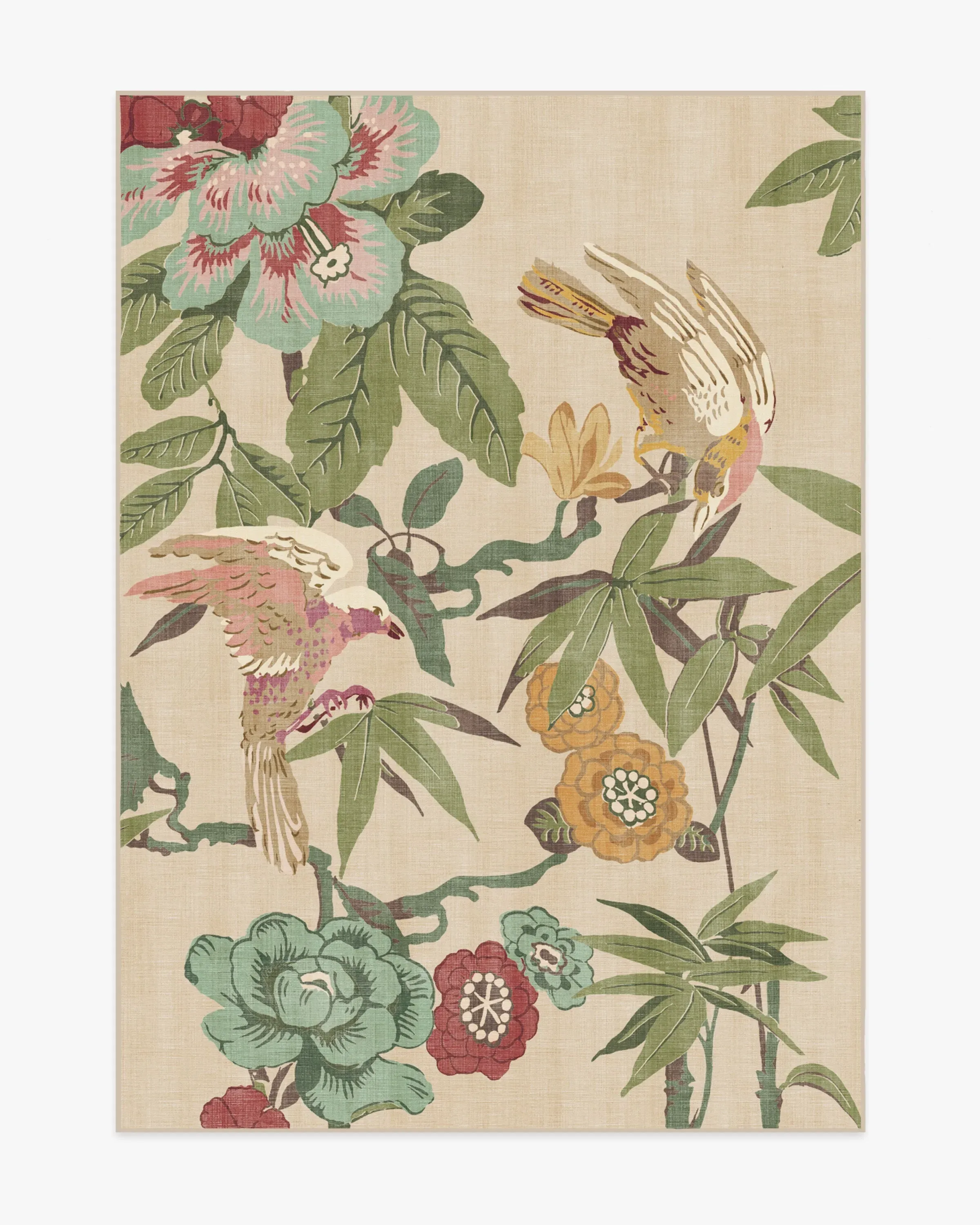 Bring home the tropics with our Sanderson Bamboo & Bird Blush & Jade Rug. Delicate bamboo, hibiscus, hydrangea, and wisteria motifs create a twisting framework for birds to perch. Its palette blends olive greens, teal blues, bright teal accents, browns, yellows, magentas, and pinks, with pops of bright cream against a light cream background. Water-resistant, stain-resistant, and machine-washable. Rug colours may vary slightly according to your device and the lighting in your space. 60x90 | Machine Washable Area Rug | Kid & Pet Friendly | Indoor Rugs | Bamboo & Bird Blush & Jade Flatwoven Rug by Sanderson | Ruggable