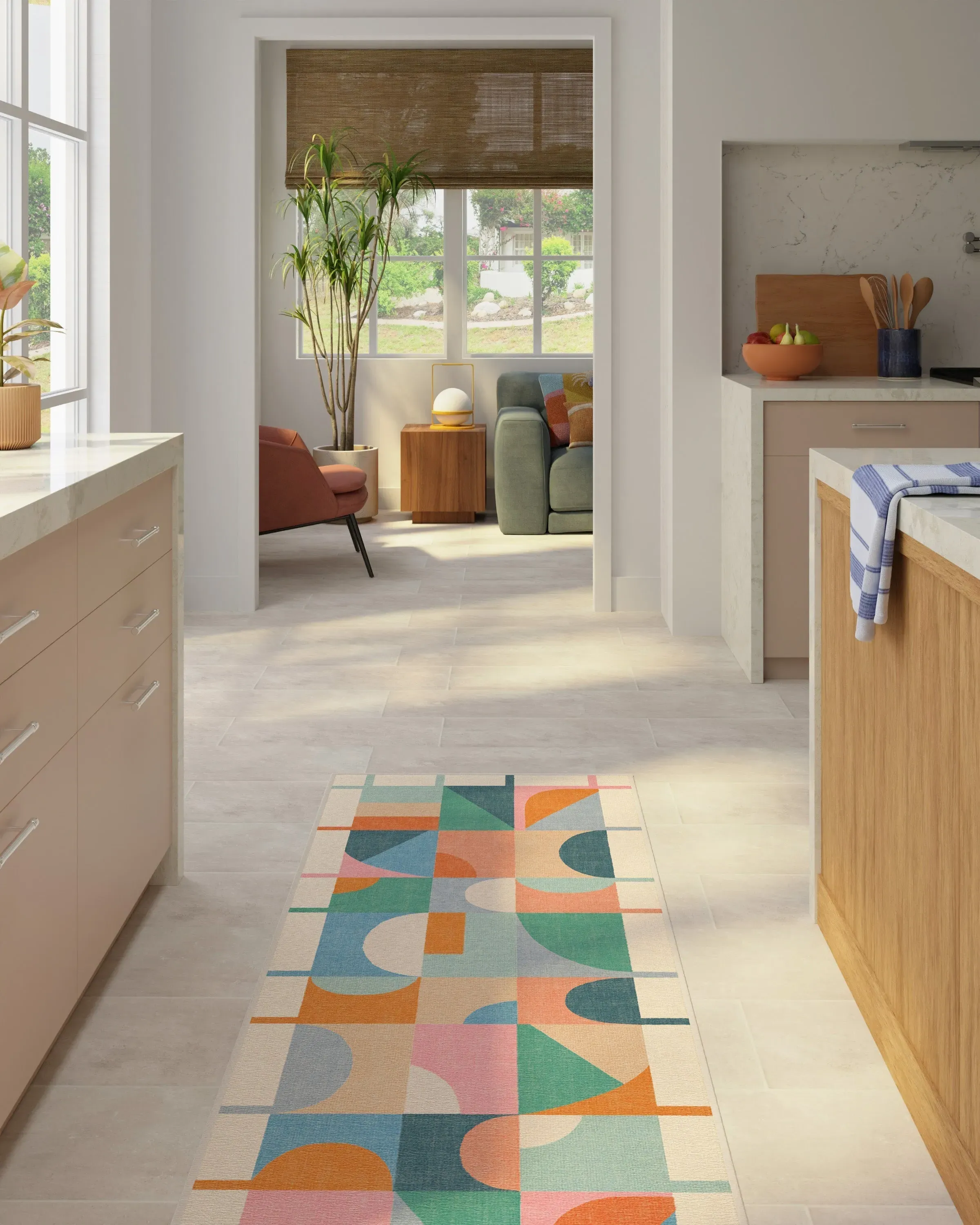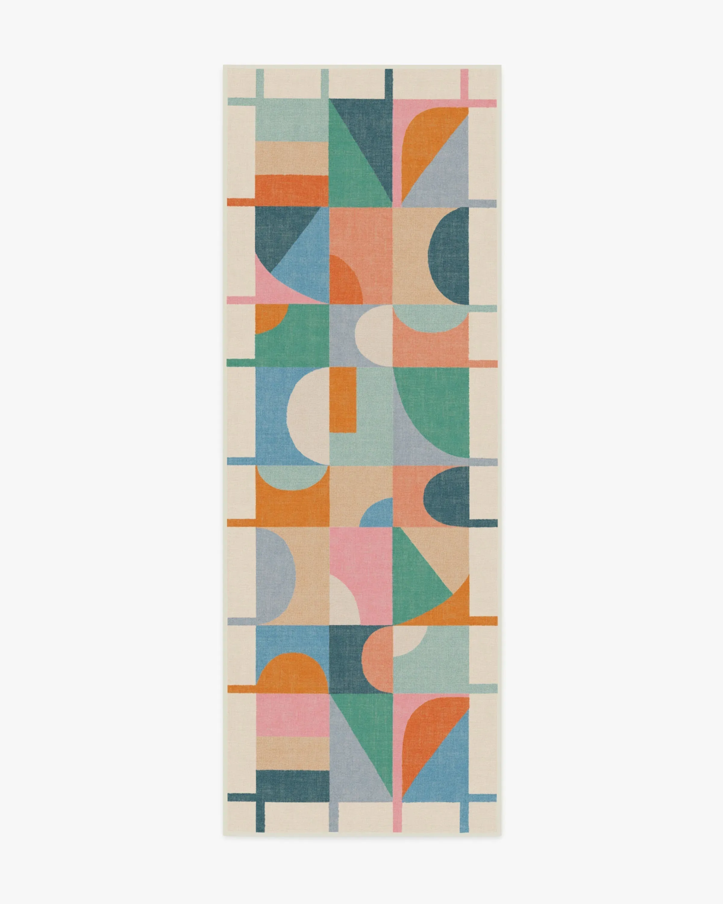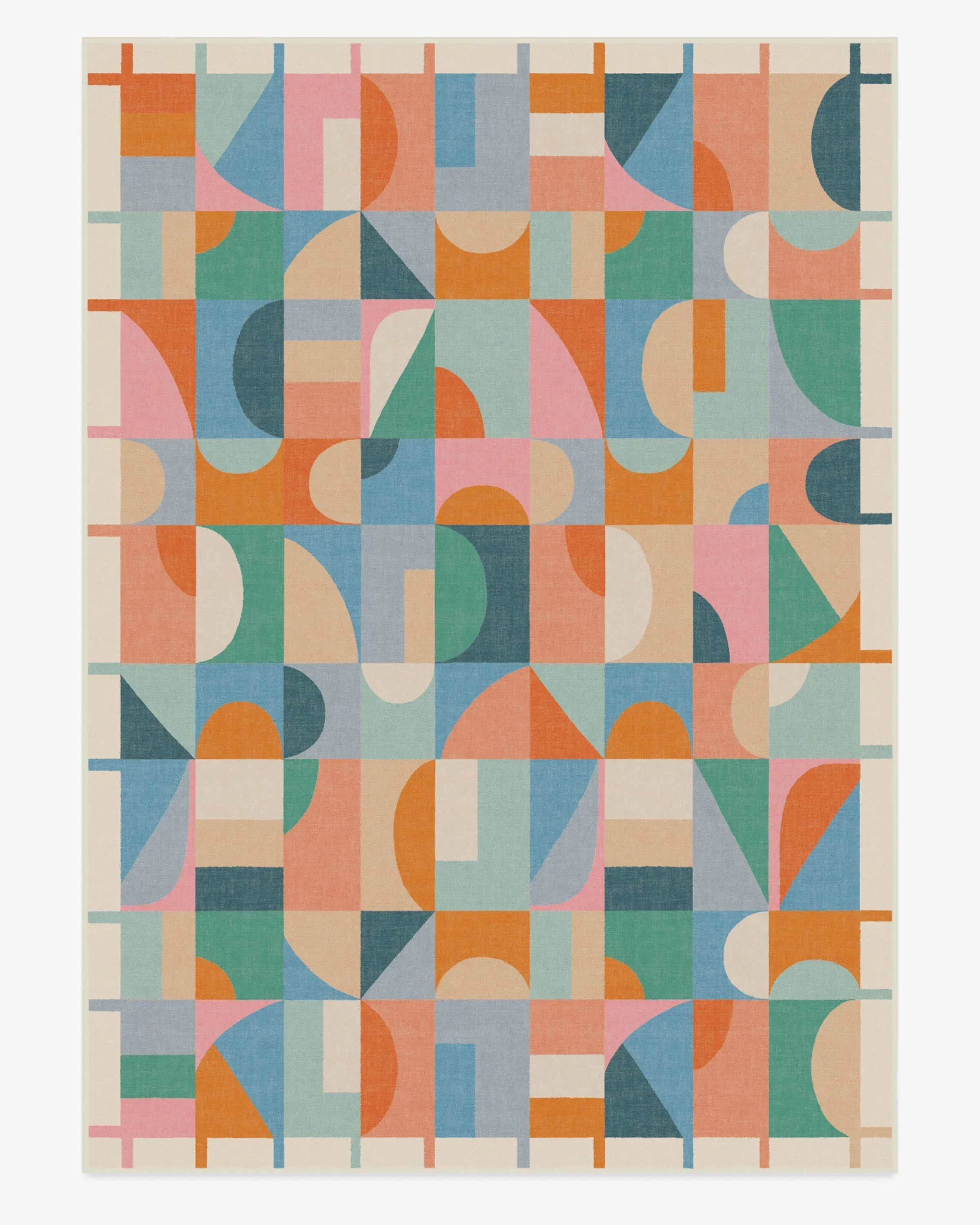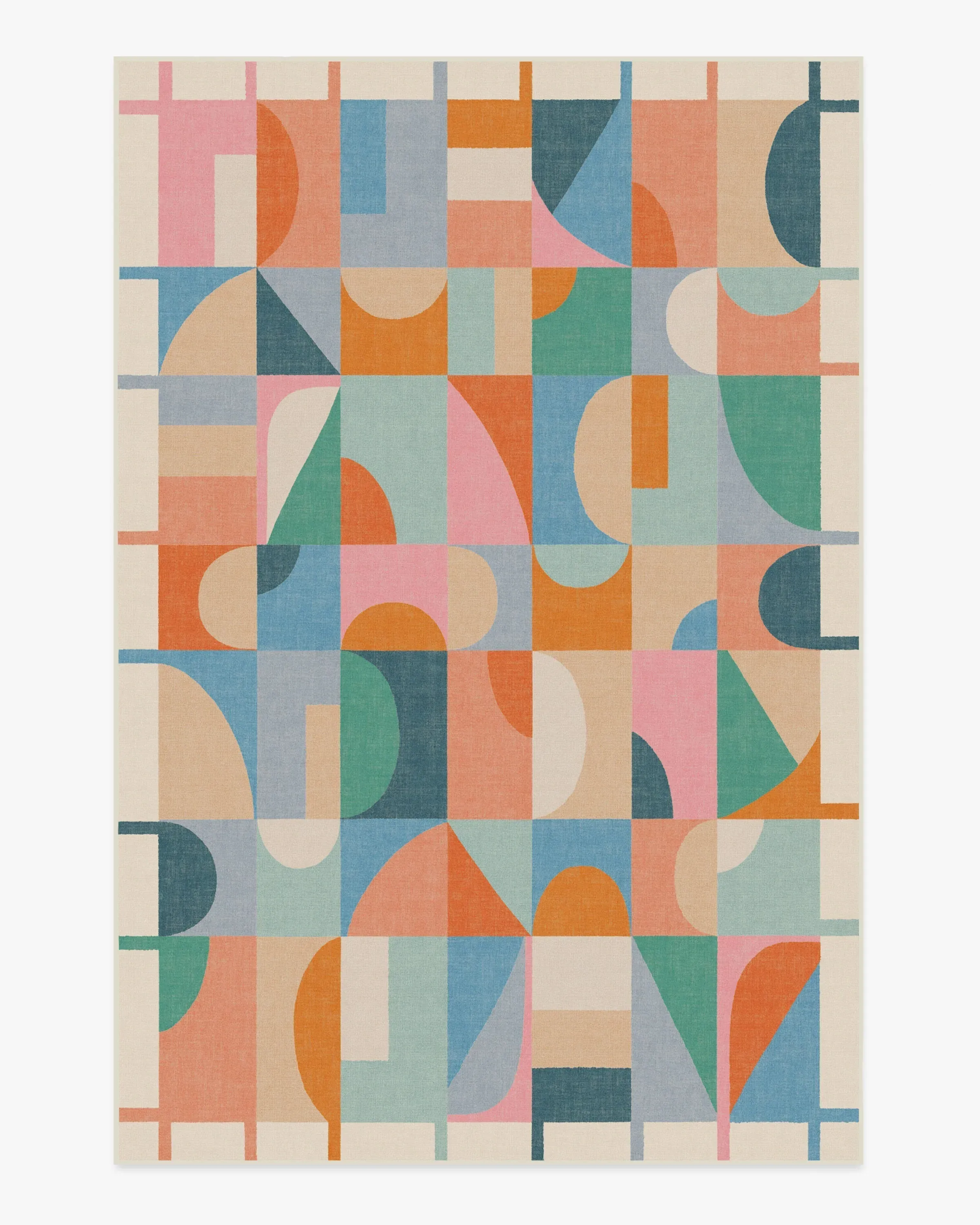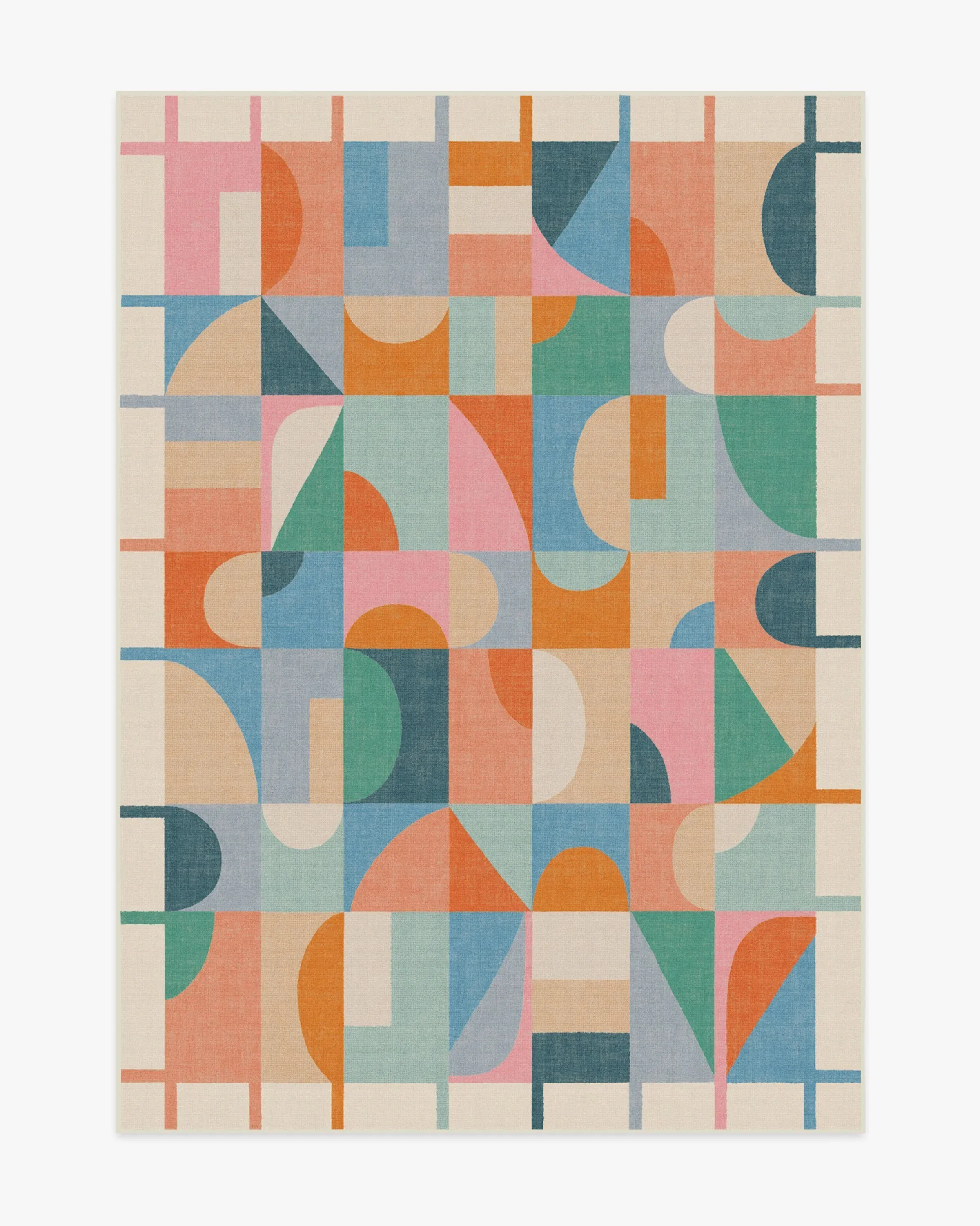 Welcome home vibrancy and playfulness with our Jennie Multicolour Rug. This geometric design features bold, asymmetrically aligned shapes that fit together in a jovial grid pattern, bringing fun and energy to any room. This rug showcases multicolour pops of light and dark blues, teals, corals, oranges, and pinks, all beautifully grounded by soft neutrals and a light cream background. A simple linear border allows the lively field to breathe. Water-resistant, stain-resistant, and machine-washable. Rug colours may vary slightly according to your device and the lighting in your space. 60x90 | Machine Washable Area Rug | Kid & Pet Friendly | Indoor Rugs | Jennie Flatwoven Rug | Ruggable