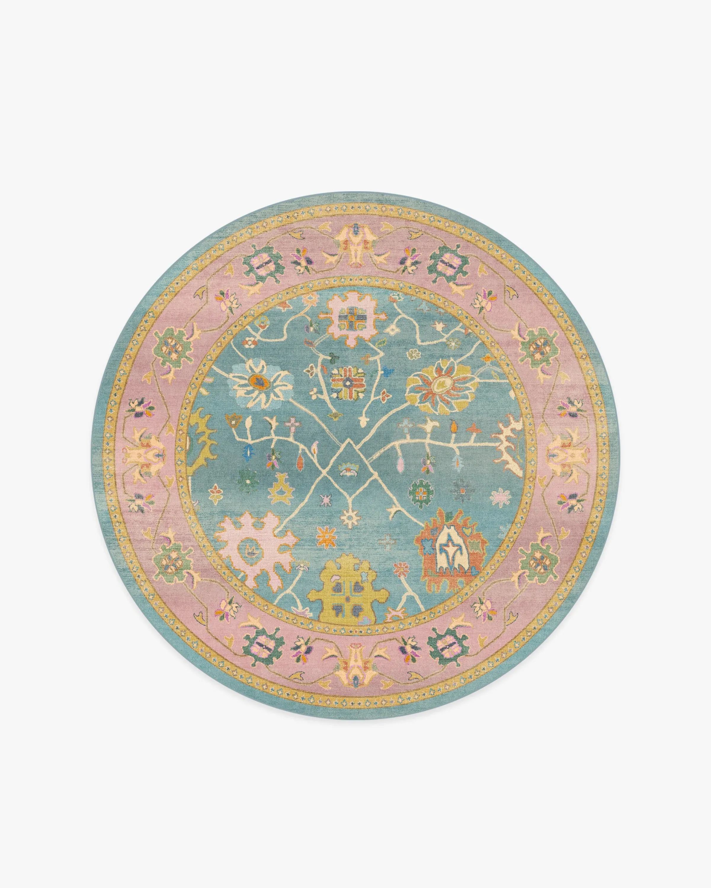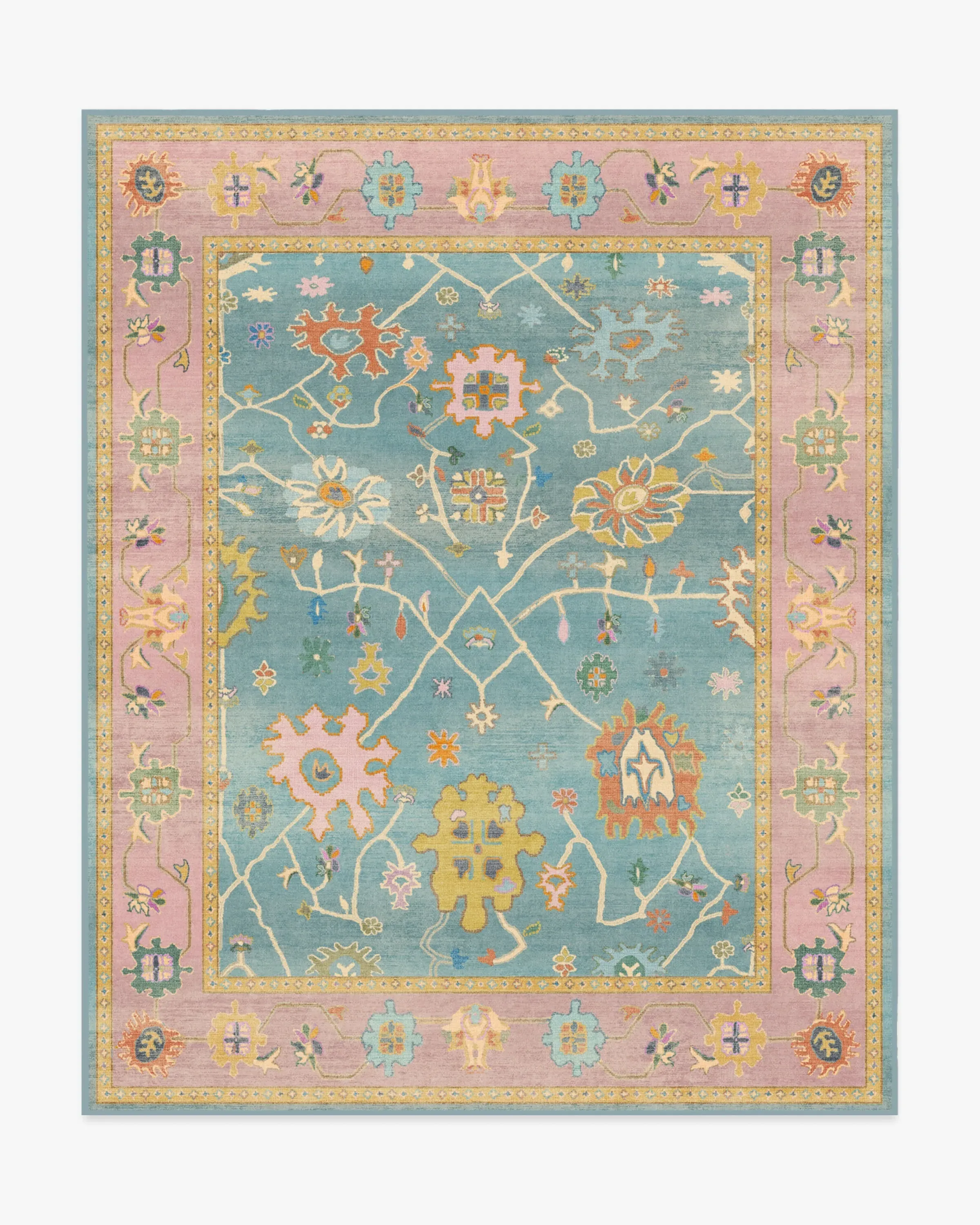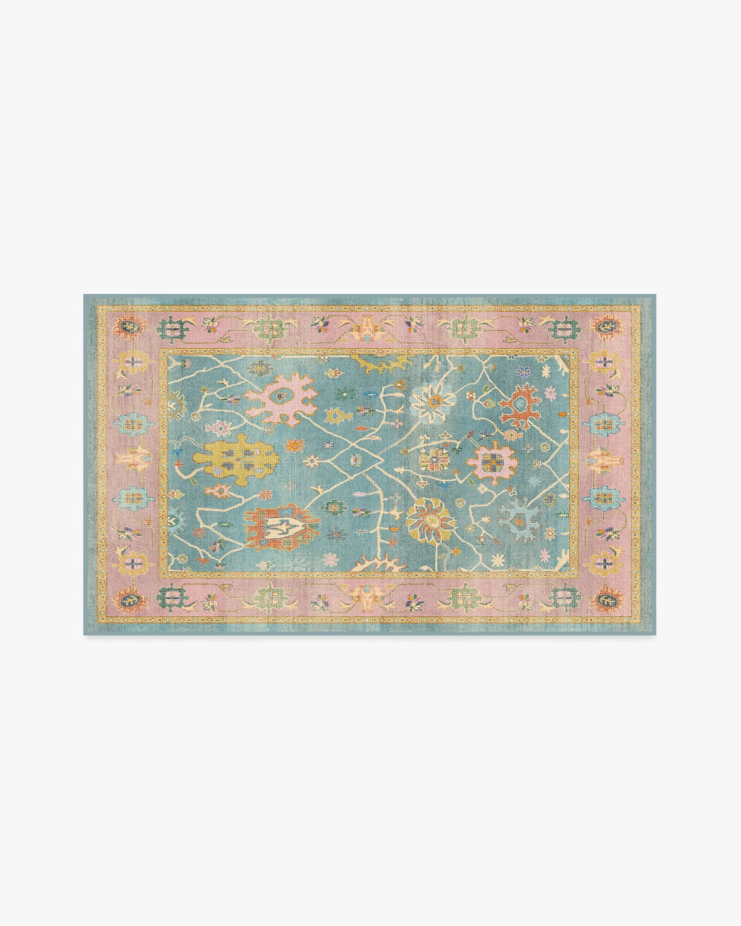 Bring the romance, without the drama, with our Regency-era Jemima Multicolour Rug. Inspired by timeless Oushak rugs, this pink-bordered, opulent design has a playful blend of bright chartreuses, reds, and oranges placed atop a warm blue background. Water-resistant, stain-resistant, and machine-washable. Rug colours may vary slightly according to your device and the lighting in your space. 60x90 | Machine Washable Area Rug | Kid & Pet Friendly | Indoor Rugs | Jemima Flatwoven Rug | Ruggable