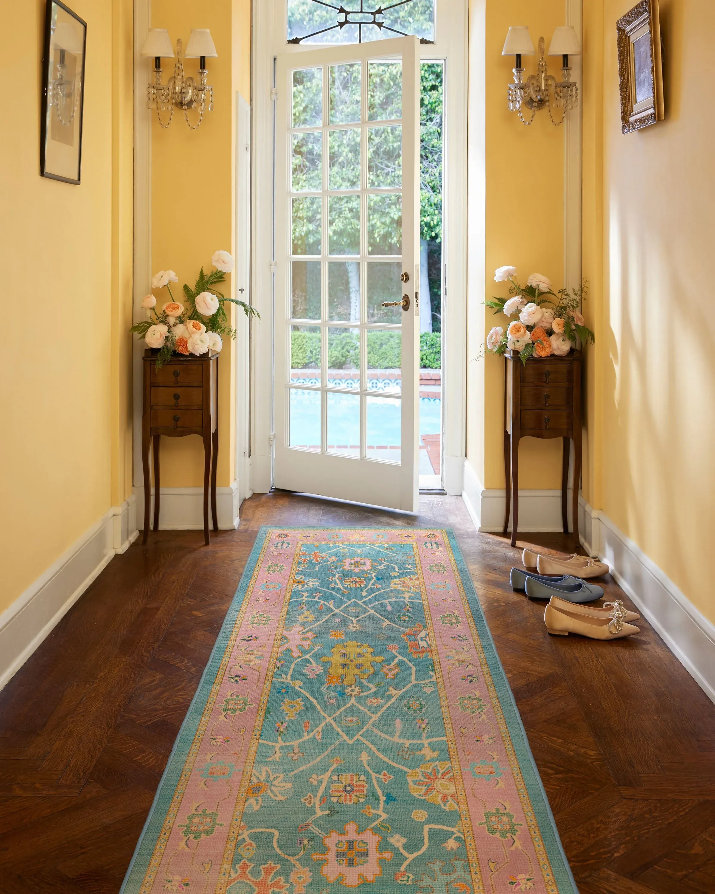 The Jemima Area Rug combines Regency-era elegance with modern practicality through its machine-washable construction. Inspired by timeless Oushak designs, it features a pink border with bright chartreuses, reds, and oranges set against a warm blue background. The flatwoven construction provides durability, while the water-resistant and stain-resistant properties ensure easy maintenance. Dimensions: 60 x 90 cm.