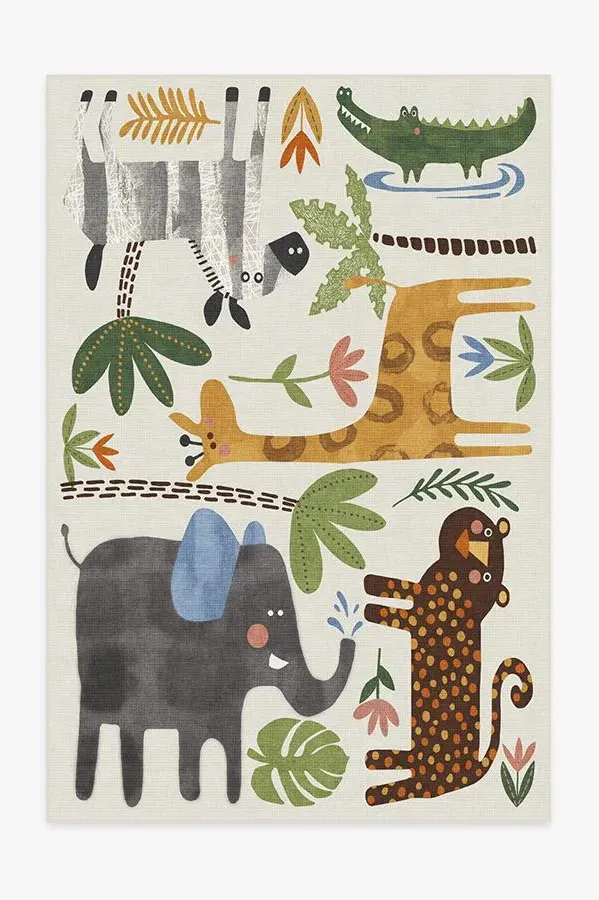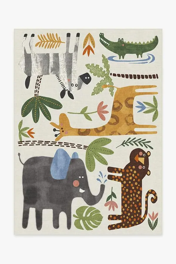 Little explorers will love this crew of critters on our Jungle Safari Multicolour Rug. Tinted in watercolor hues of blue, green, and yellow, this rug features cheerful animals - lion, zebra, giraffe, elephant, and crocodile - roaming among rubber trees, leaves, and flowers, adding a wildly whimsical touch to any child's space. 60x90 | Machine Washable Area Rug | Kid & Pet Friendly | Indoor Rugs | Jungle Safari Flatwoven Rug | Ruggable