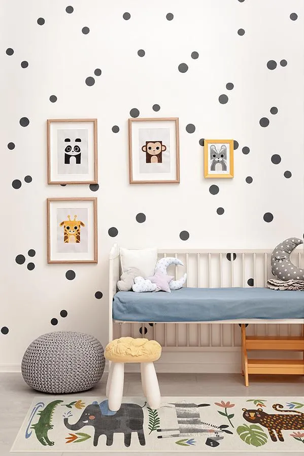 The Jungle Safari Area Rug features watercolor hues of blue, green, and yellow with cheerful safari animals including lions, zebras, giraffes, elephants, and crocodiles. Its flatwoven construction provides durability, while the machine washable design offers easy maintenance. The pet-friendly material resists stains and wear, and the rubber tree and floral motifs add whimsical detail. W60 x D90 cm.