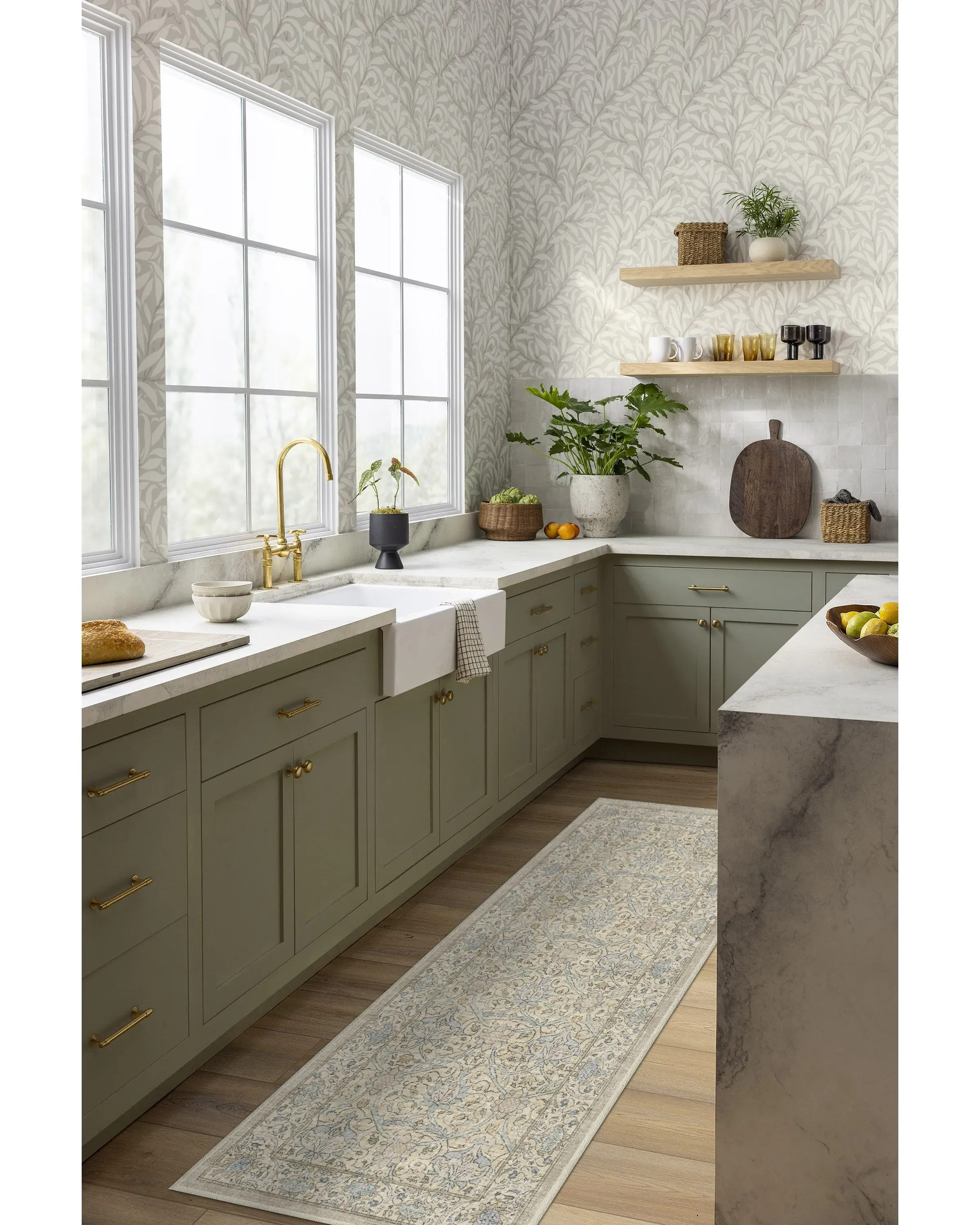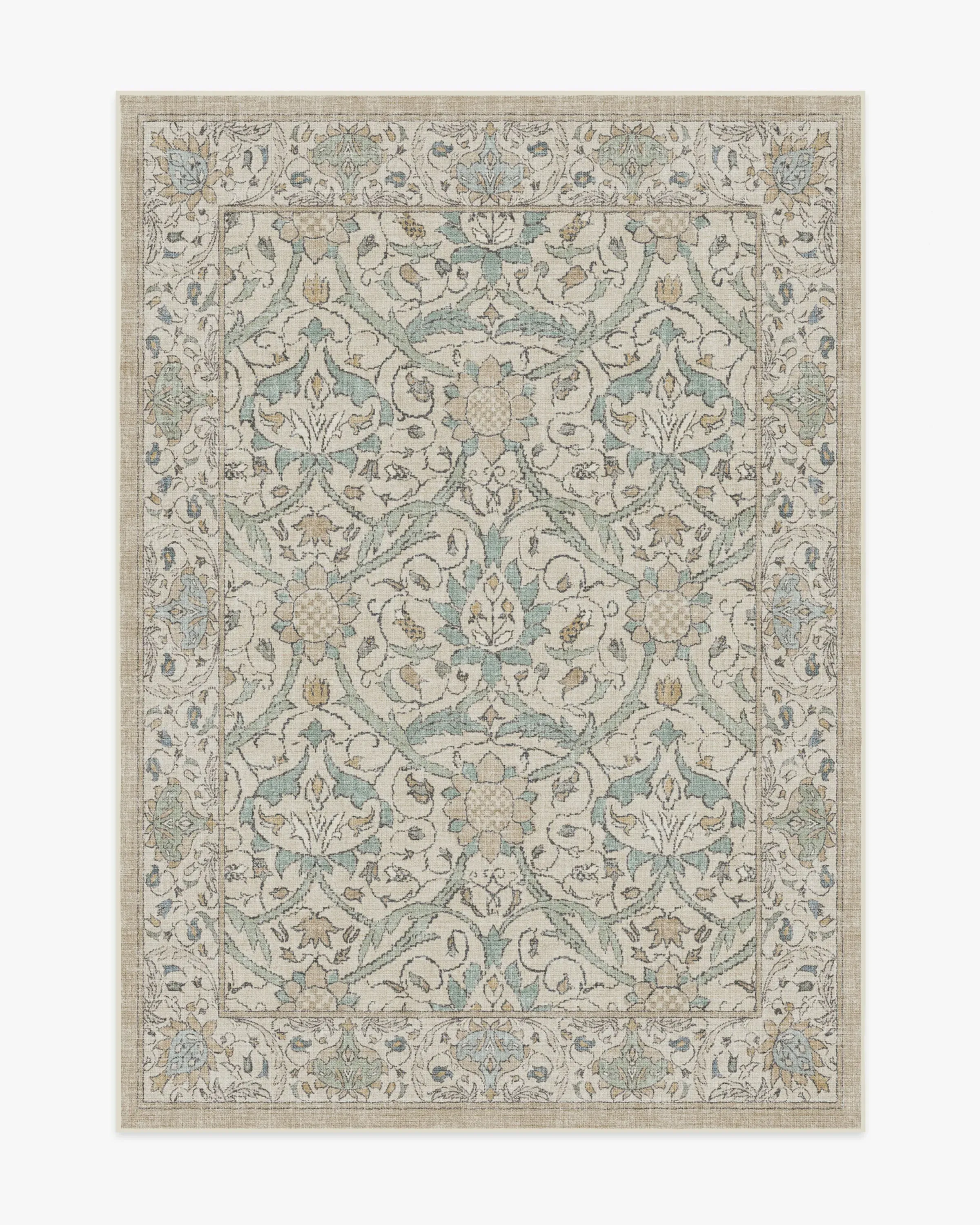 Elevate any space with the Morris & Co. Montreal Natural Jade Rug. This traditional take on John Henry Dearle's 1890's carpet design features simple line work in a soft colour palette of beiges, golds, blues, and greens. The trailing vines and floral botanicals add an ornate formality to the detailed design. Water-resistant, stain-resistant, and machine-washable. Rug colours may vary slightly according to your device and the lighting in your space. 60x90 | Machine Washable Area Rug | Kid & Pet Friendly | Indoor Rugs | Montreal Natural Jade Flatwoven Rug by Morris & Co. | Ruggable