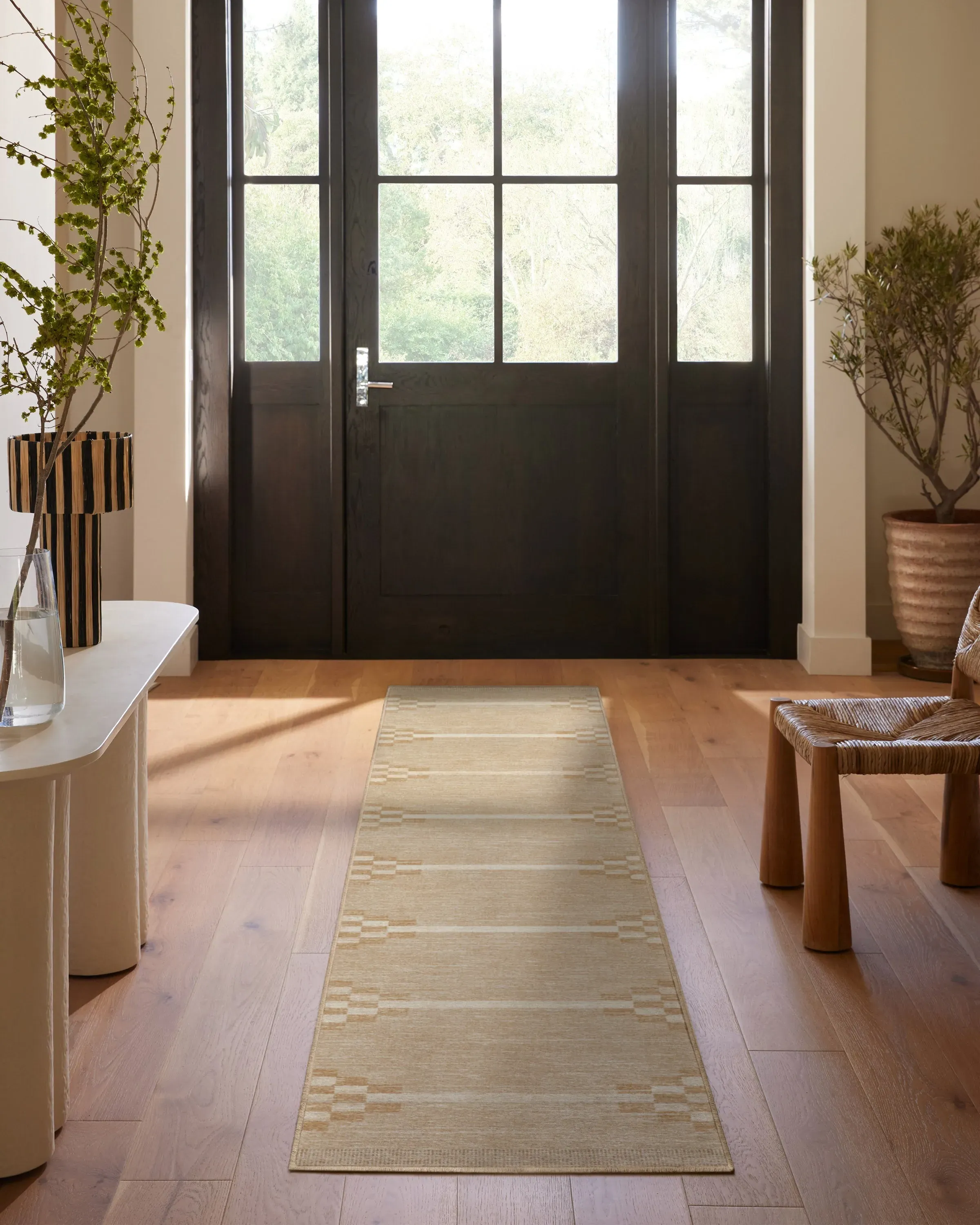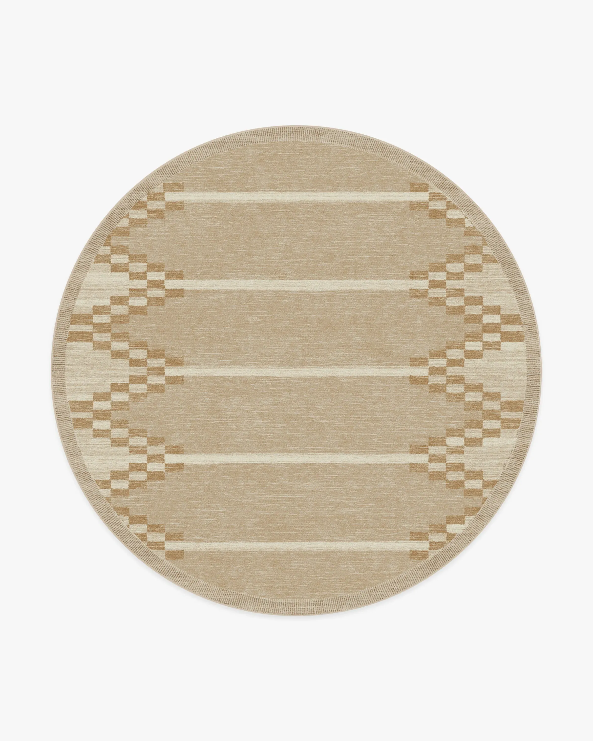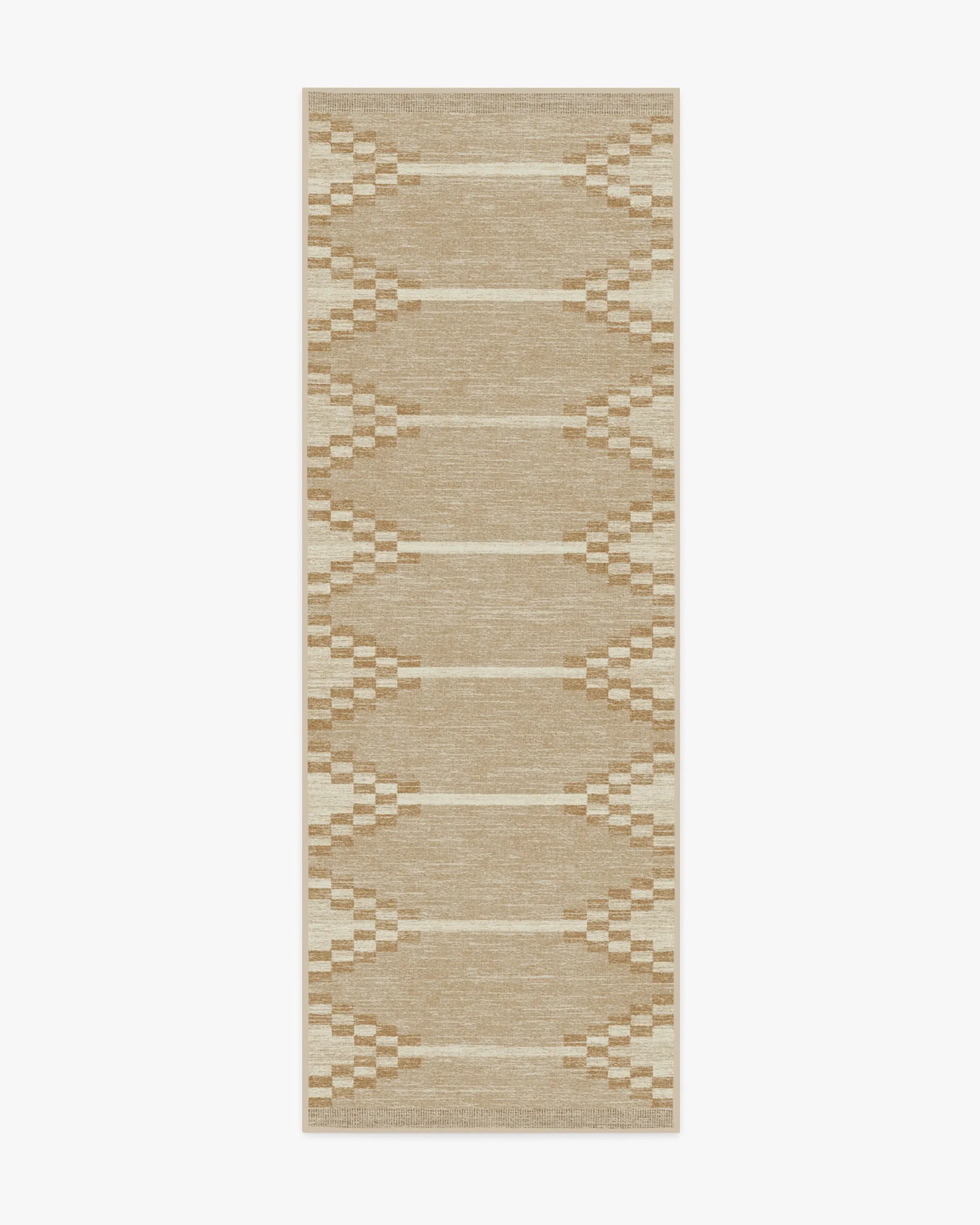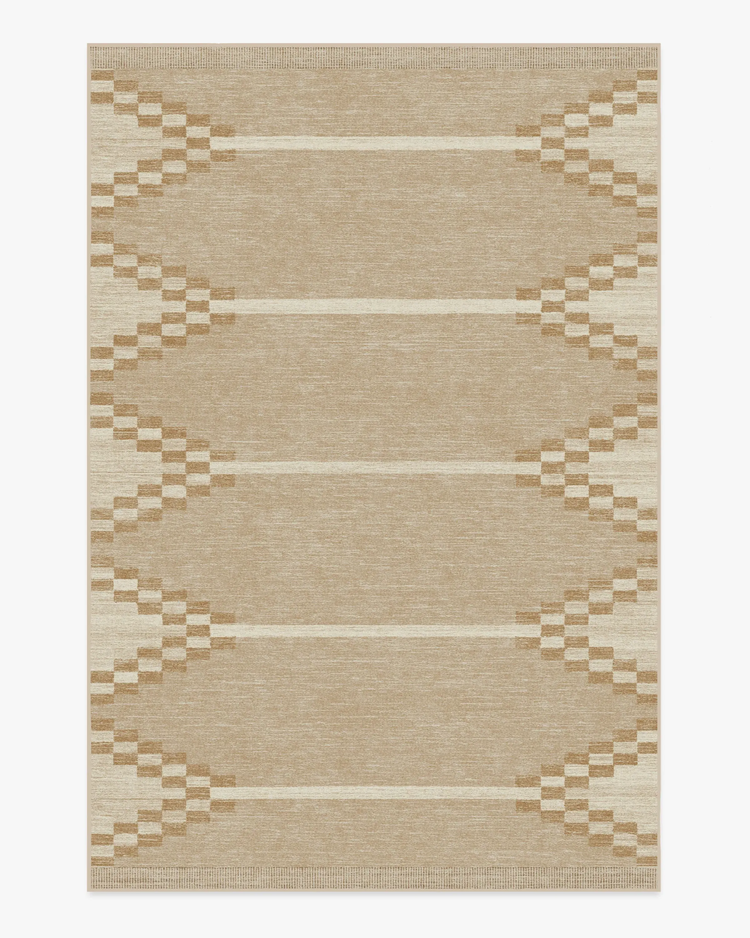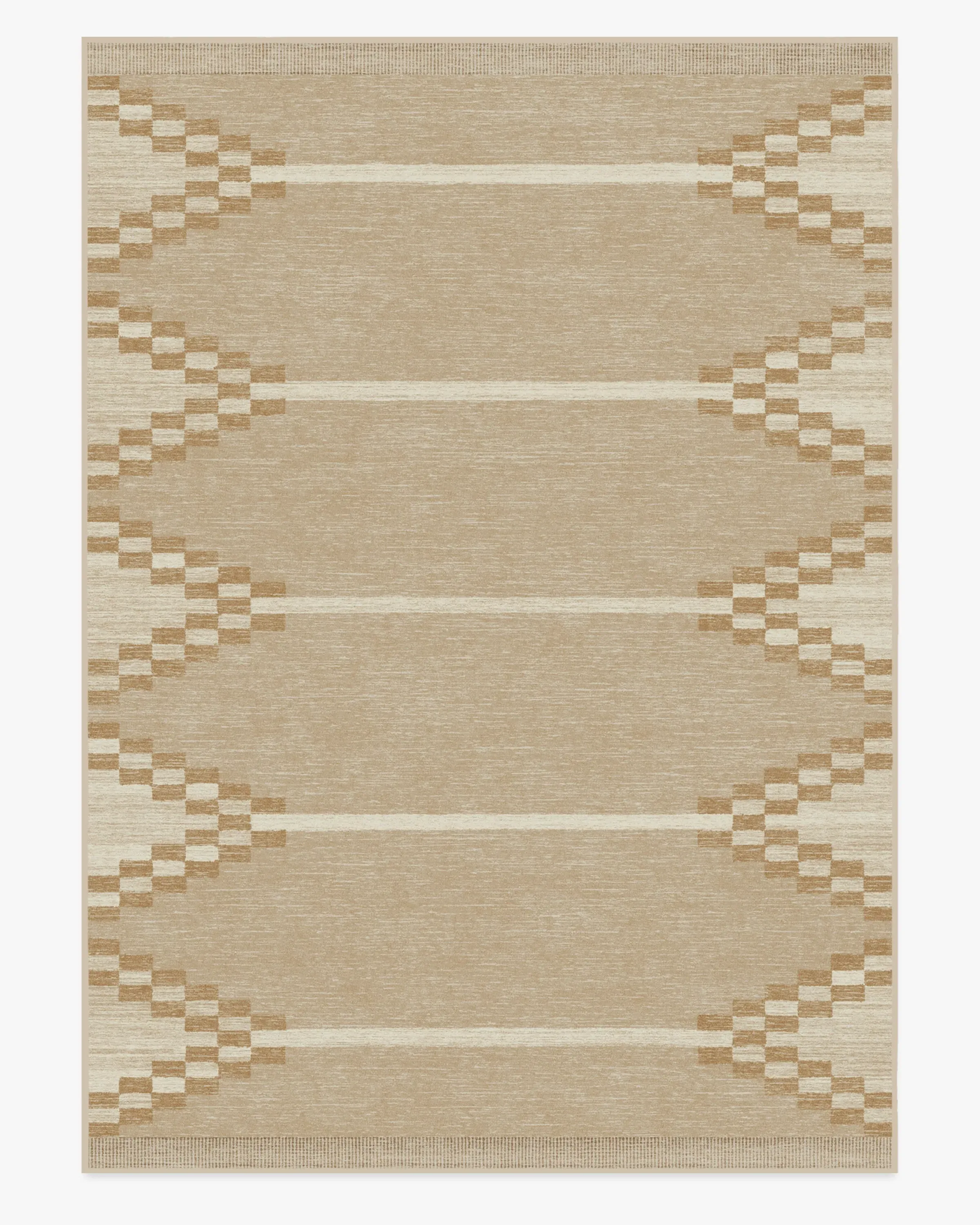 It's all in the details. Our Sloane Natural Rug features a creative geometric design with wide, cream and gold chevron borders against a warm natural background - all inspired by a rustic hand loom. Water-resistant, stain-resistant, and machine-washable. Rug colours may vary slightly according to your device and the lighting in your space. 60x90 | Machine Washable Area Rug | Kid & Pet Friendly | Indoor Rugs | Sloane Natural Flatwoven Rug | Ruggable