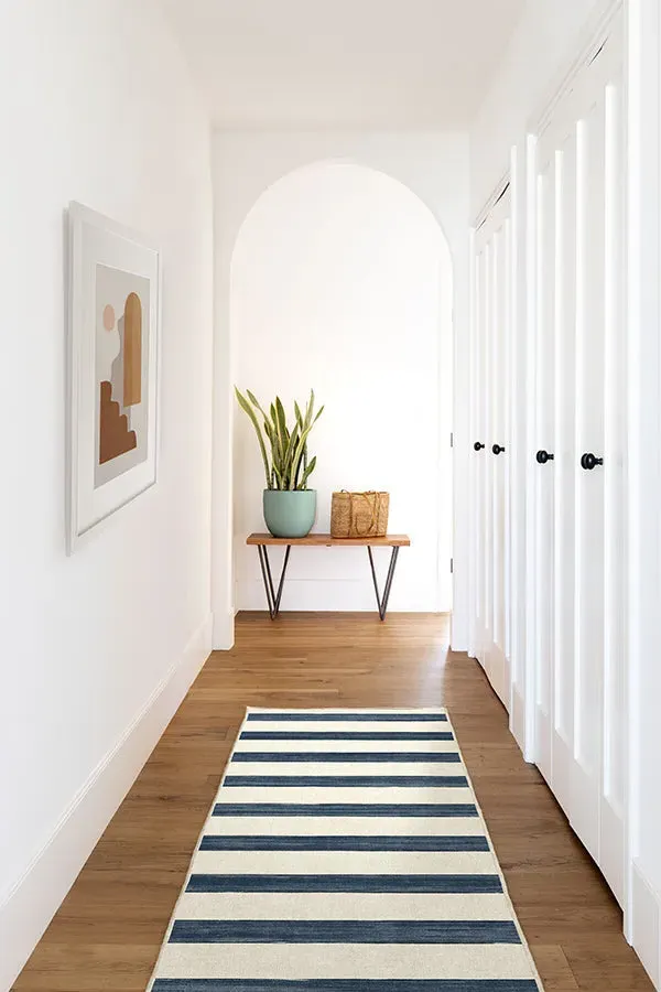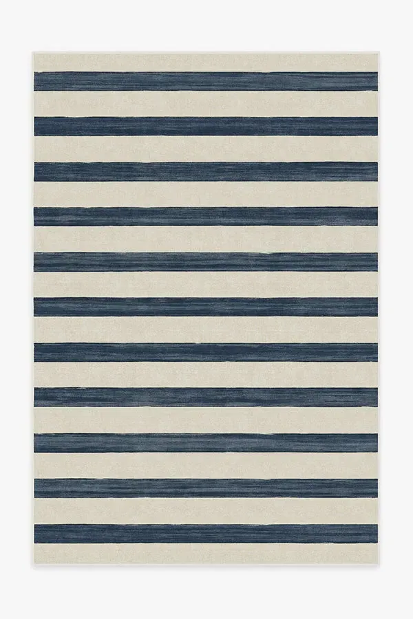 A bold take on stripes. Our Sumi Sailor Stripe Navy Rug intertwines warm navy and inky blue stripes that alternate against a soft pearl background. Made from our water-resistant, stain-resistant, and machine-washable low-pile Classic material. Our Classic Rugs are woven from a velvety smooth chenille yarn. 60x90 | Machine Washable Area Rug | Kid & Pet Friendly | Indoor Rugs | Sumi Sailor Stripe Navy Flatwoven Rug | Ruggable