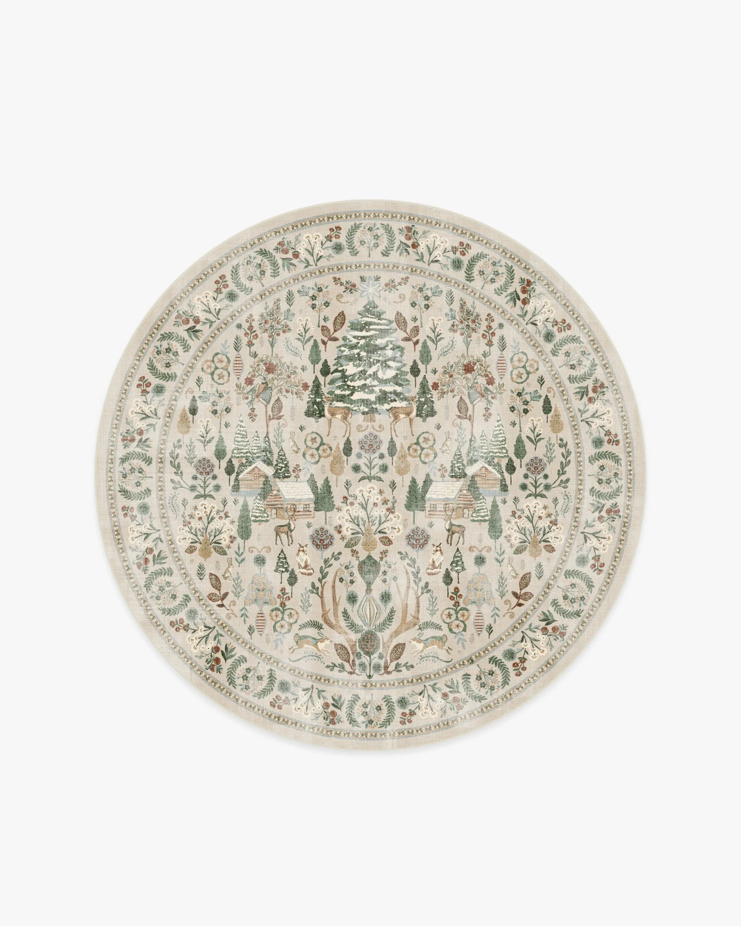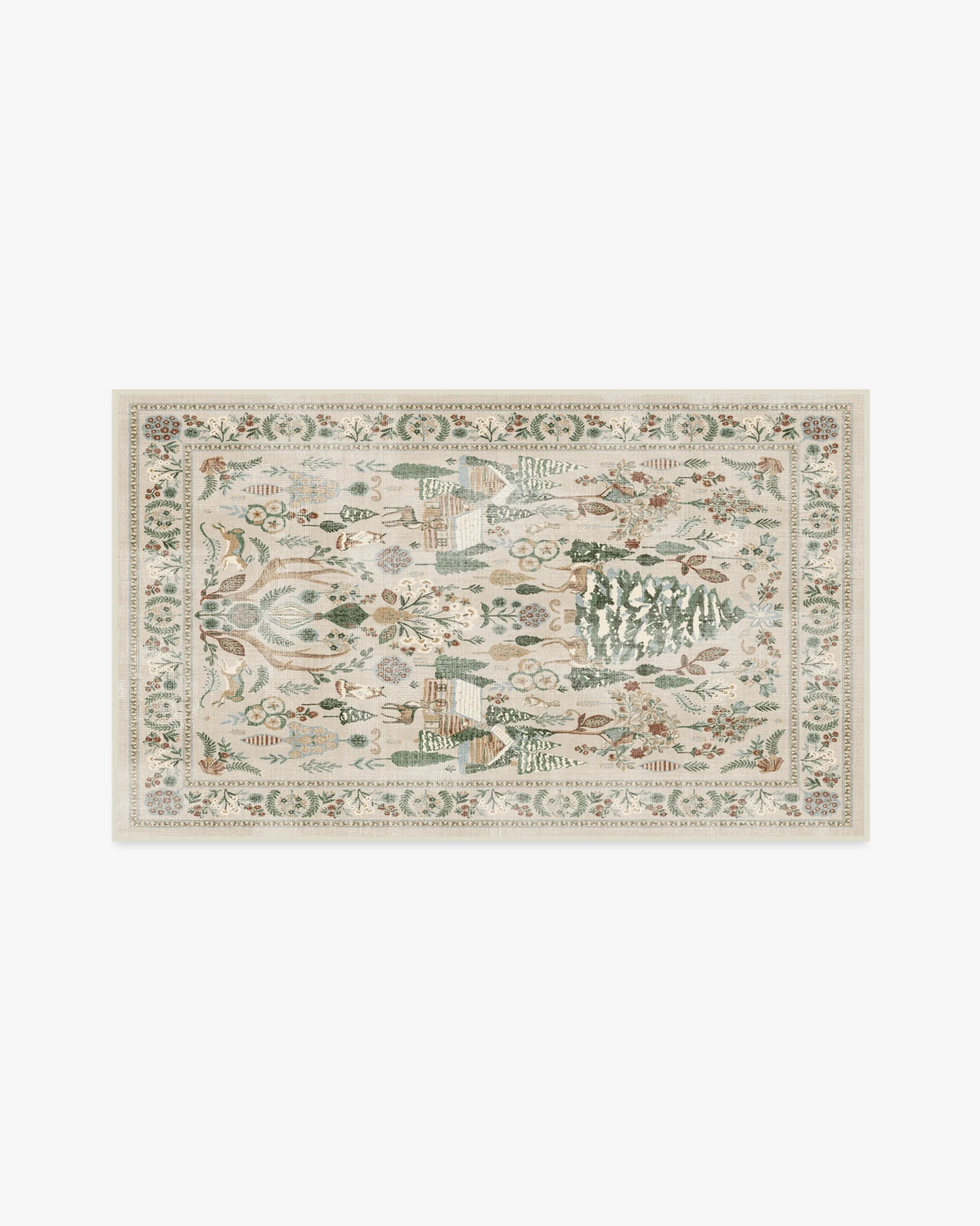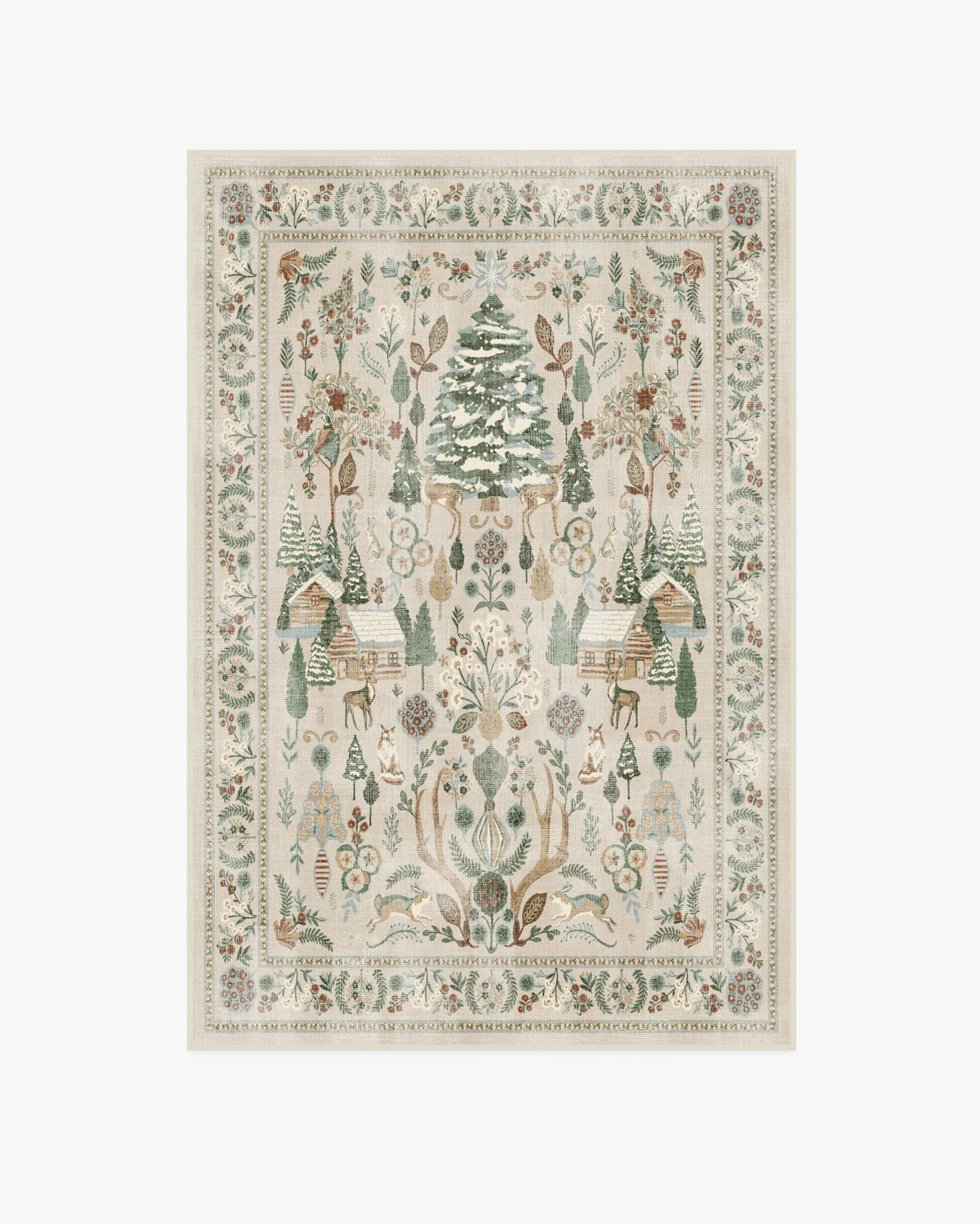 Step into a whimsical wonderland with our Juniper Neutral Multicolour Rug. This cottagecore-inspired tapestry design features pine trees, winter animals, log cabins, and pretty foliage. The warm neutral background is adorned with soft, vintage greens and reds, accented by pops of cream and gold. Water-resistant, stain-resistant, and machine-washable. Rug colours may vary slightly according to your device and the lighting in your space. 60x90 | Machine Washable Area Rug | Kid & Pet Friendly | Indoor Rugs | Juniper Neutral Flatwoven Rug | Ruggable