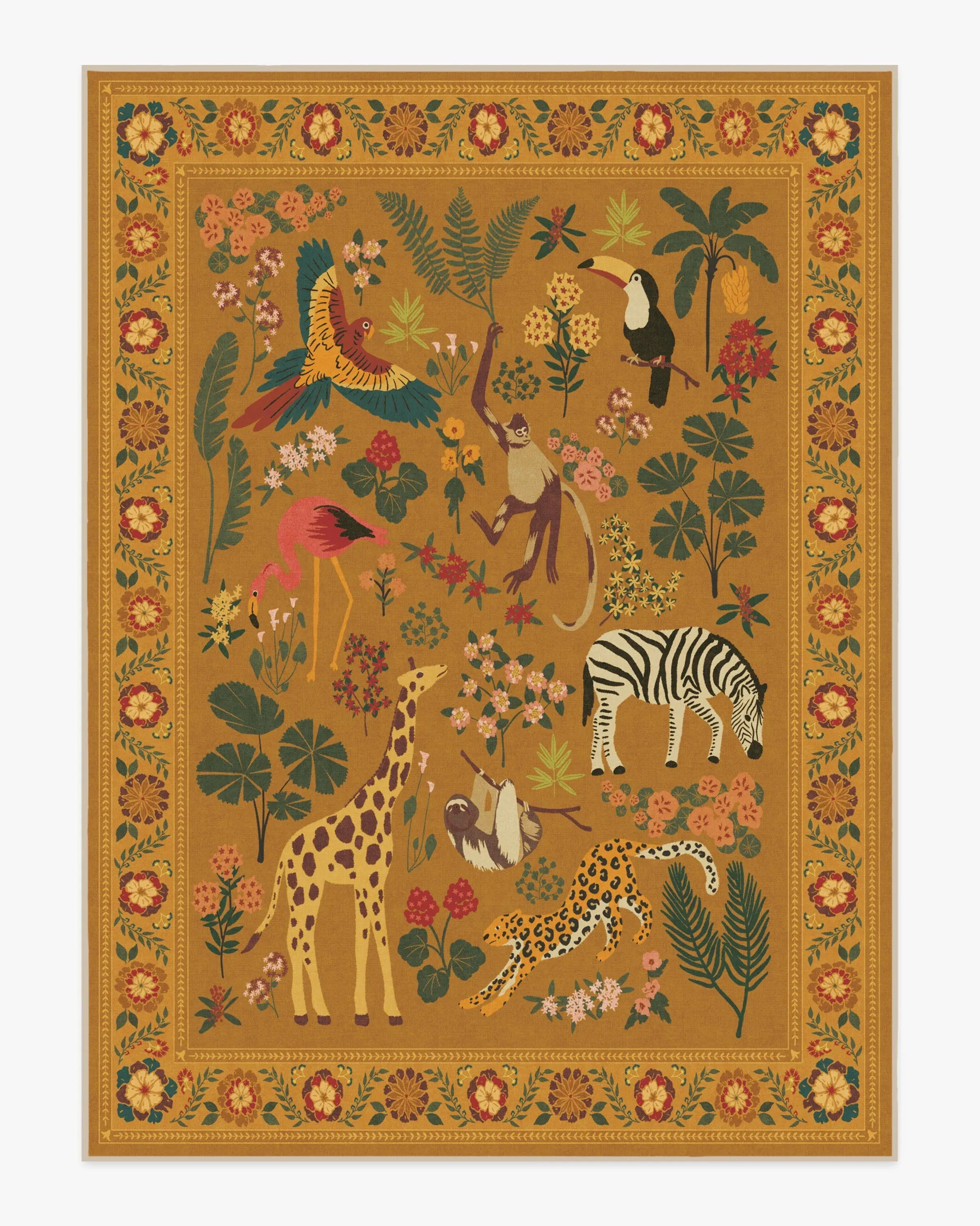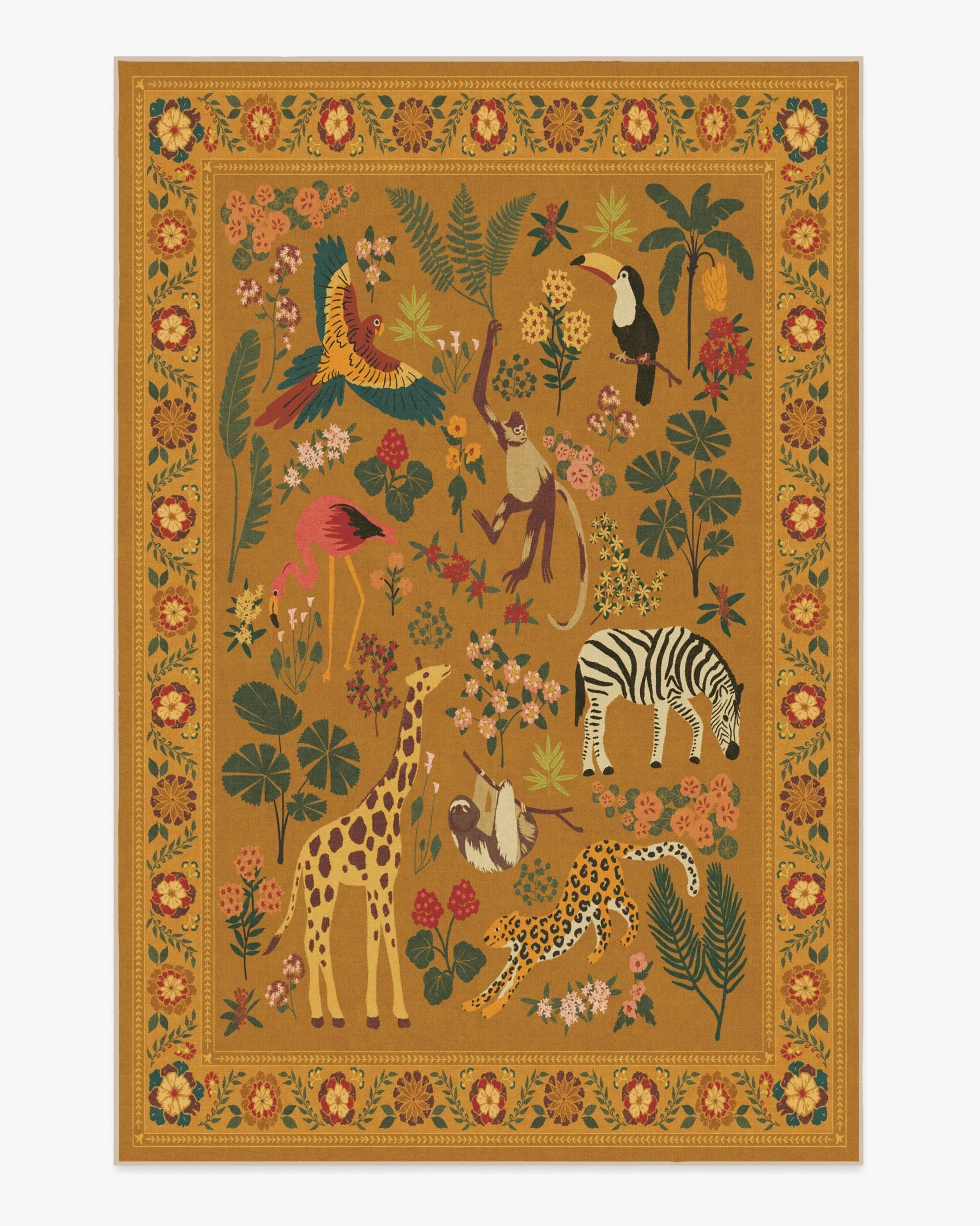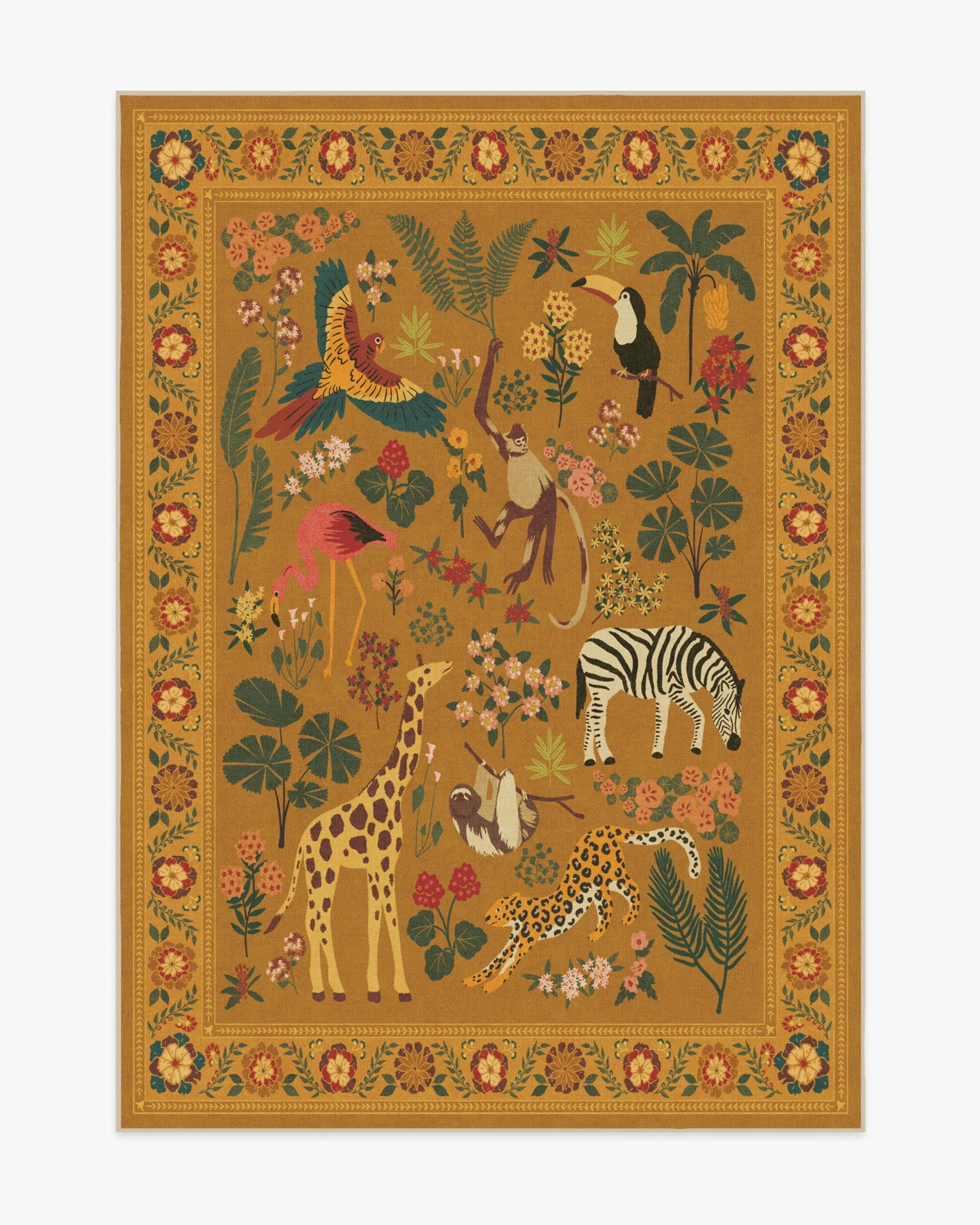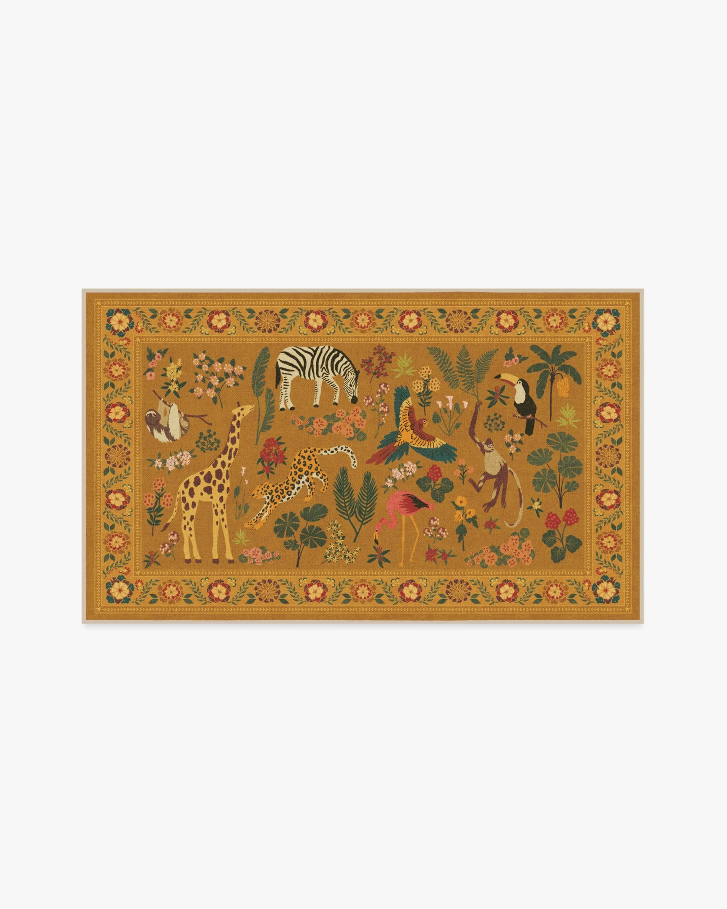 Dare to be iconic with our Iris Apfel Jingle Jungle Ochre Rug. Inspired by Iris' adventurous spirit, this wildlife-filled design features exotic animals roaming among lush foliage. A vivid colour palette with splashes of yellow, orange, coral, pink, and yellow-green, teal, and warm beige pops against an ochre background. Water-resistant, stain-resistant, and machine-washable. Rug colours may vary slightly according to your device and the lighting in your space. 60x90 | Machine Washable Area Rug | Kid & Pet Friendly | Indoor Rugs | Jingle Jungle Ochre Flatwoven Rug by Iris Apfel Orange | Ruggable