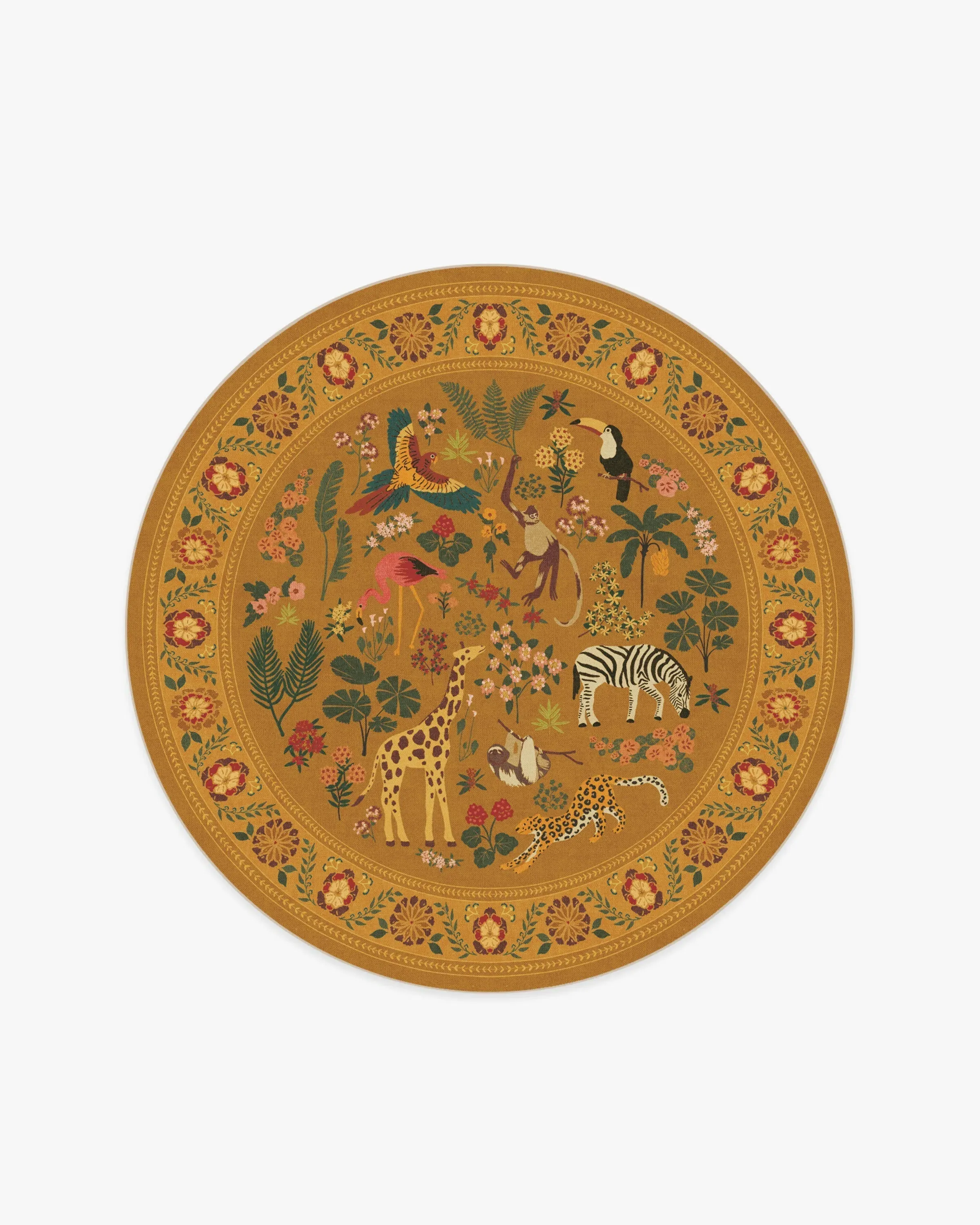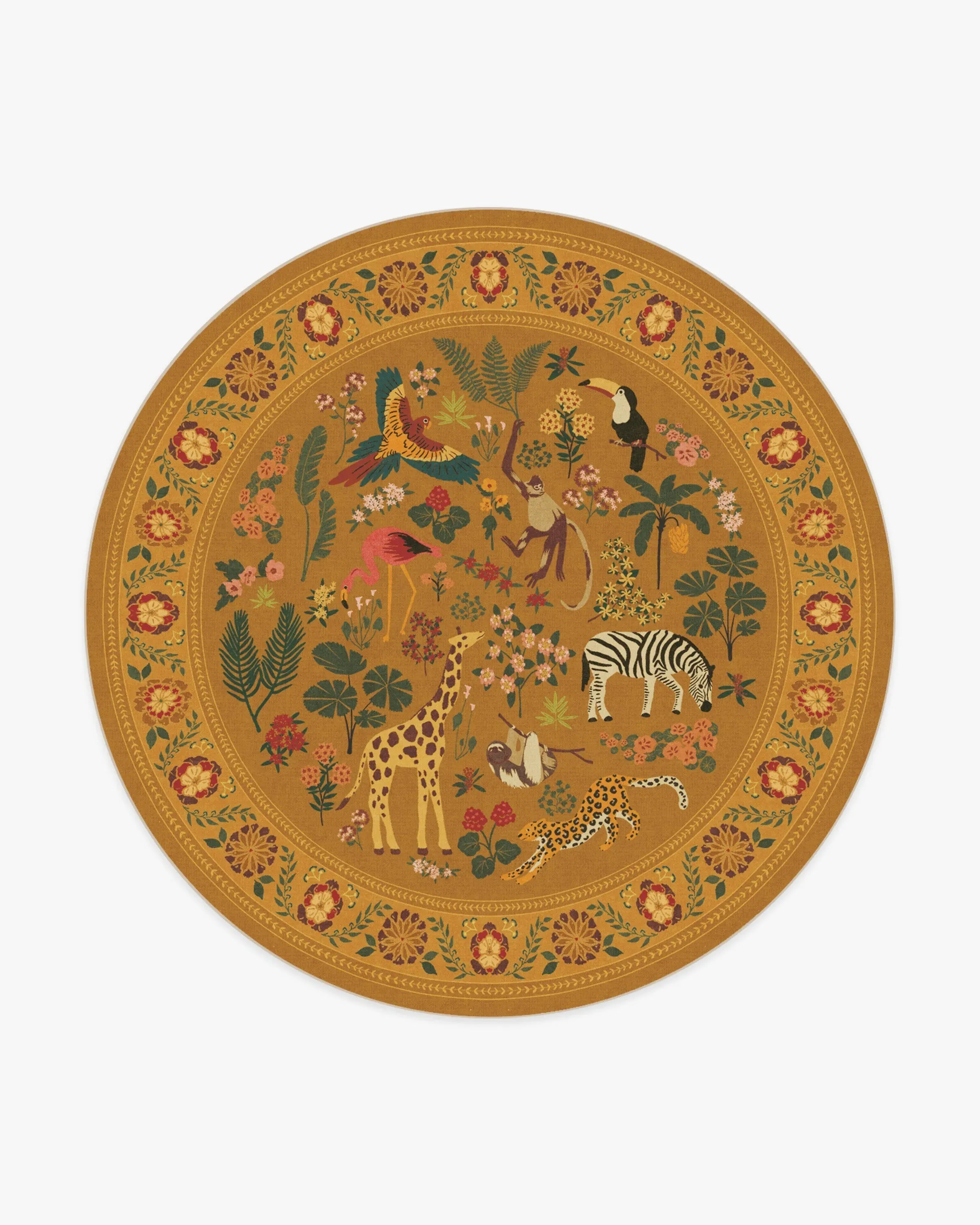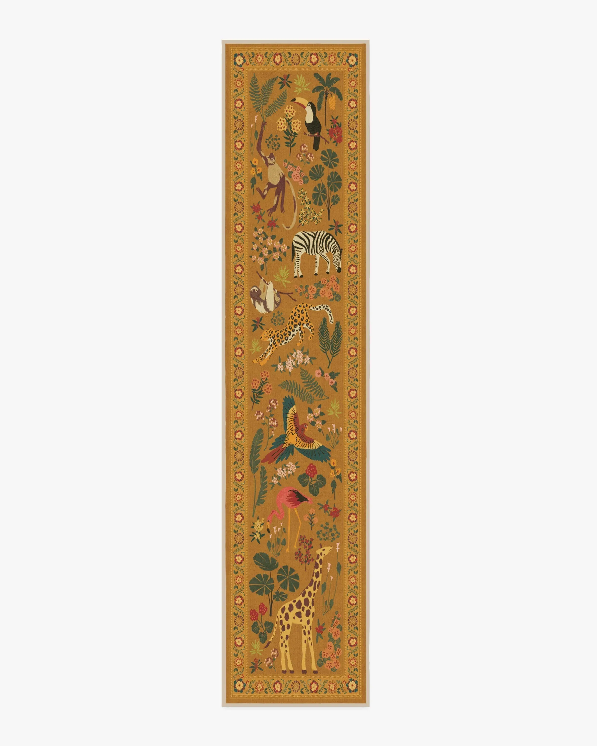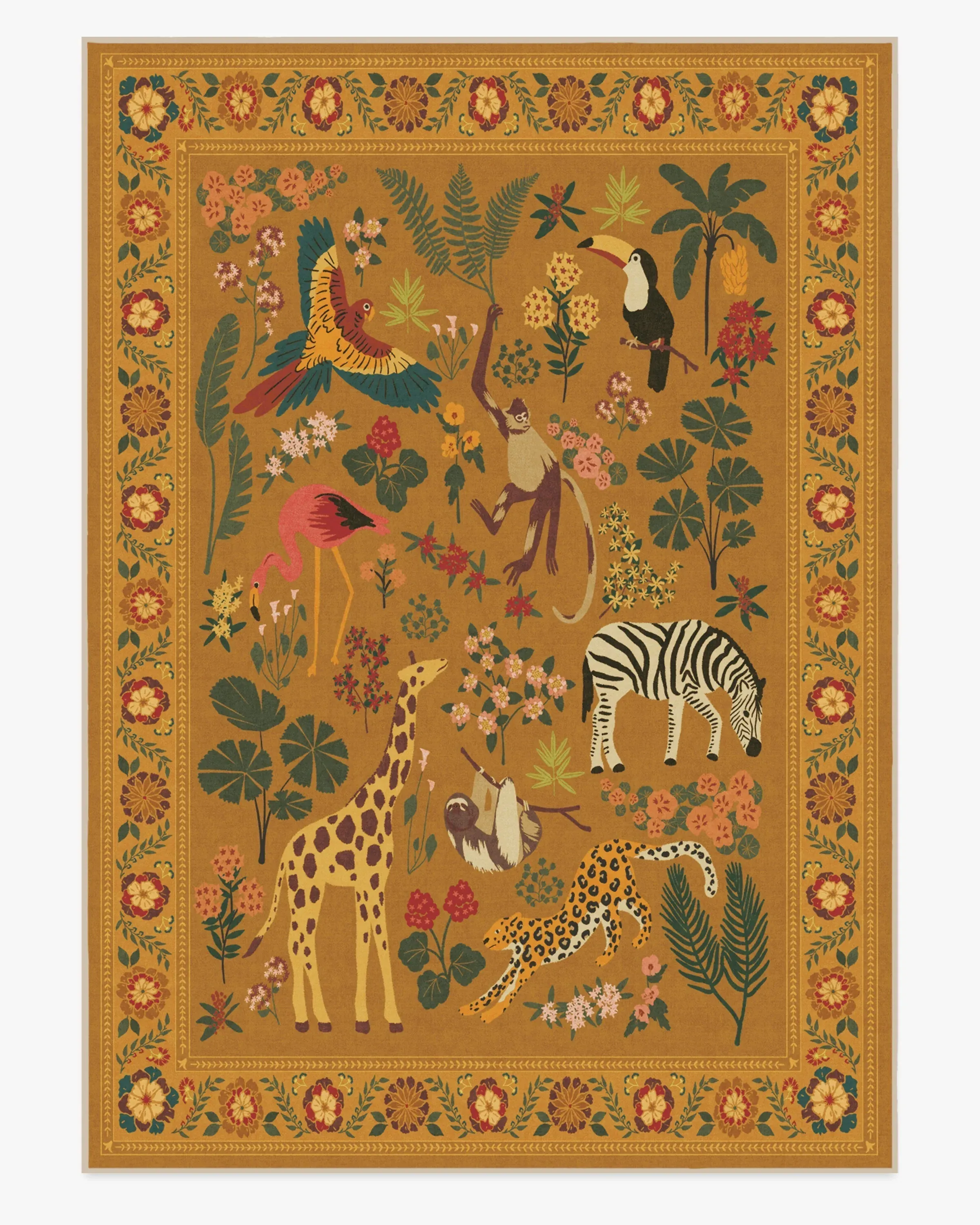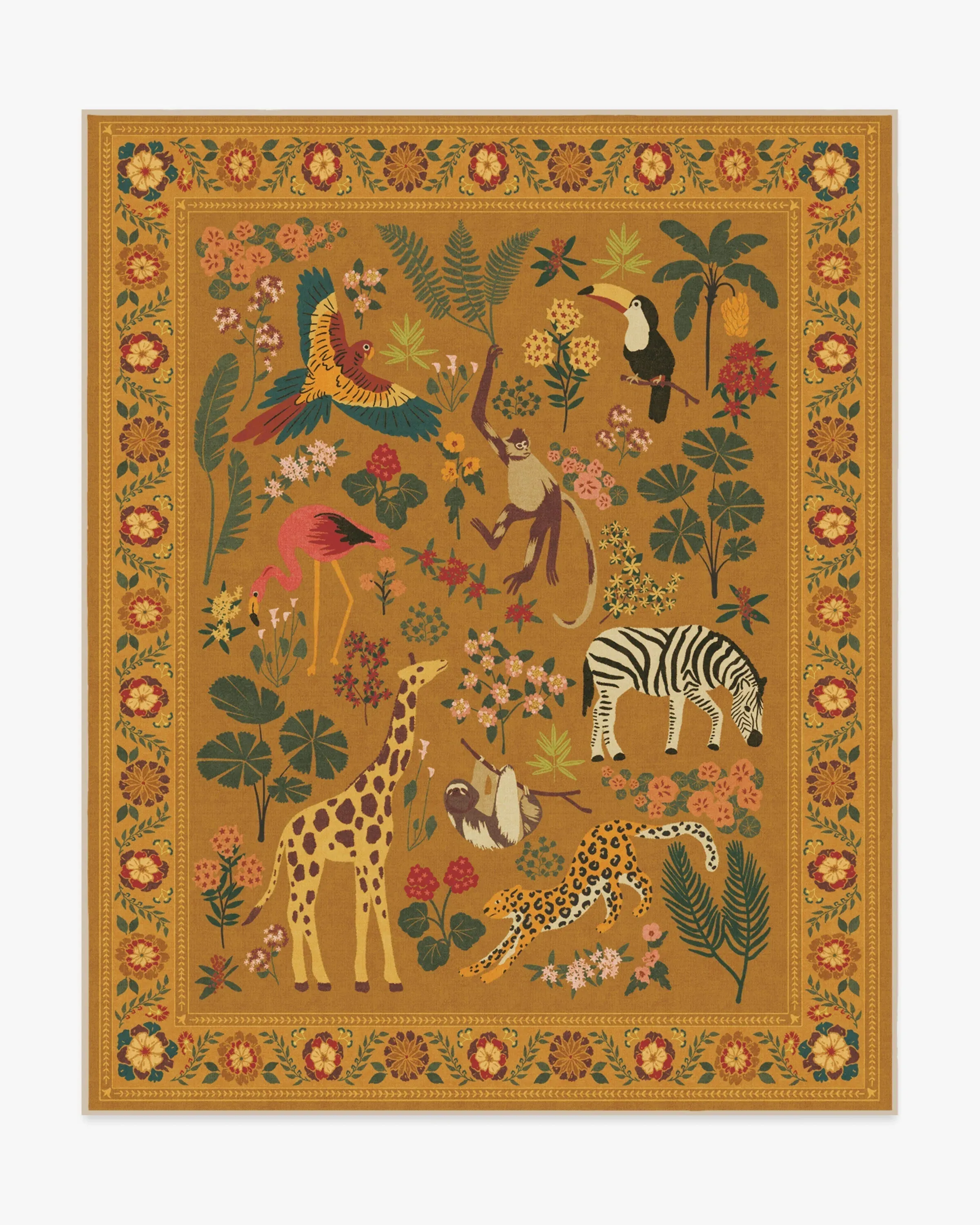 Dare to be iconic with our Iris Apfel Jingle Jungle Ochre Rug. Inspired by Iris' adventurous spirit, this wildlife-filled design features exotic animals roaming among lush foliage. A vivid colour palette with splashes of yellow, orange, coral, pink, and yellow-green, teal, and warm beige pops against an ochre background. Water-resistant, stain-resistant, and machine-washable. Rug colours may vary slightly according to your device and the lighting in your space. 60x90 | Machine Washable Area Rug | Kid & Pet Friendly | Indoor Rugs | Jingle Jungle Ochre Flatwoven Rug by Iris Apfel Orange | Ruggable
