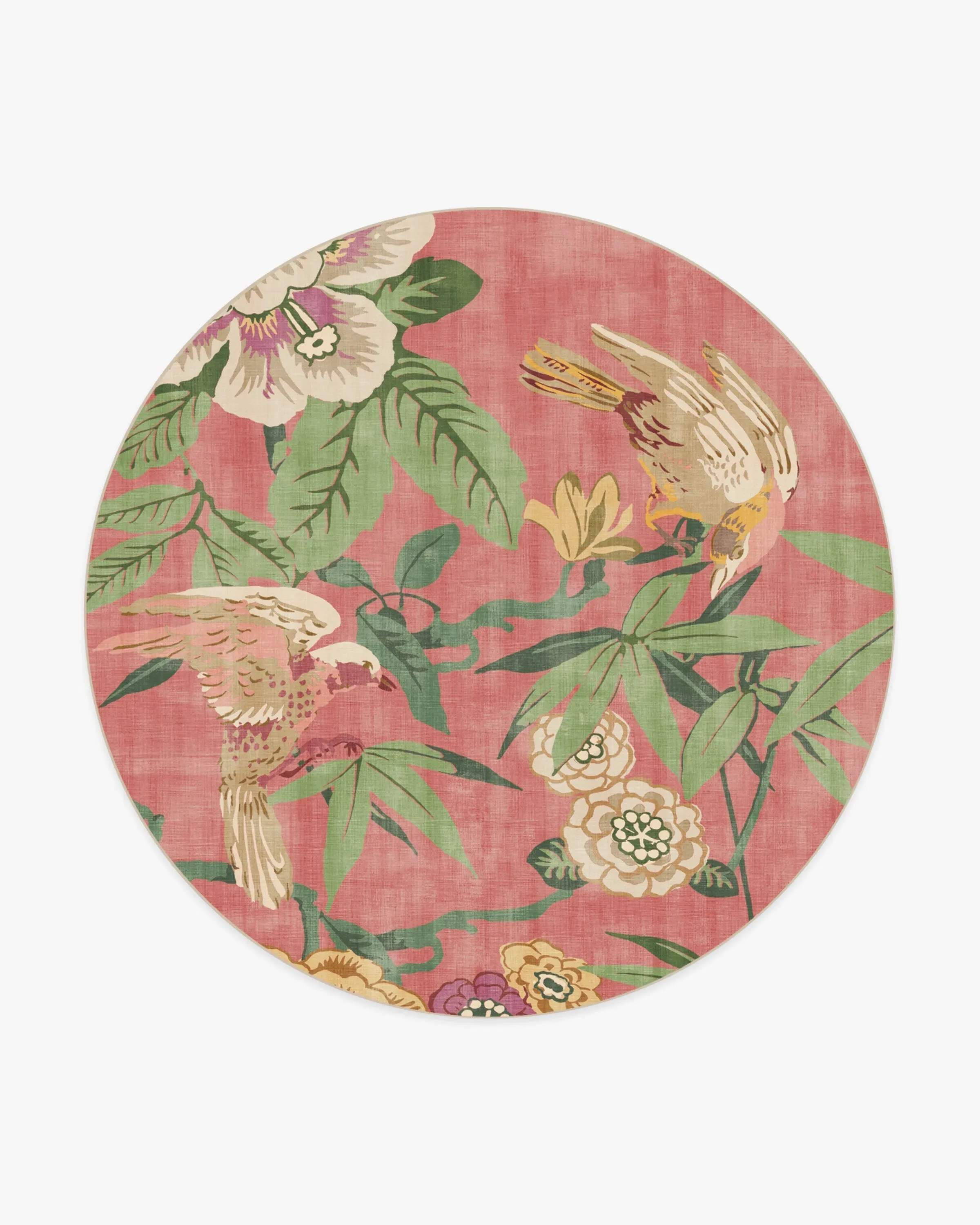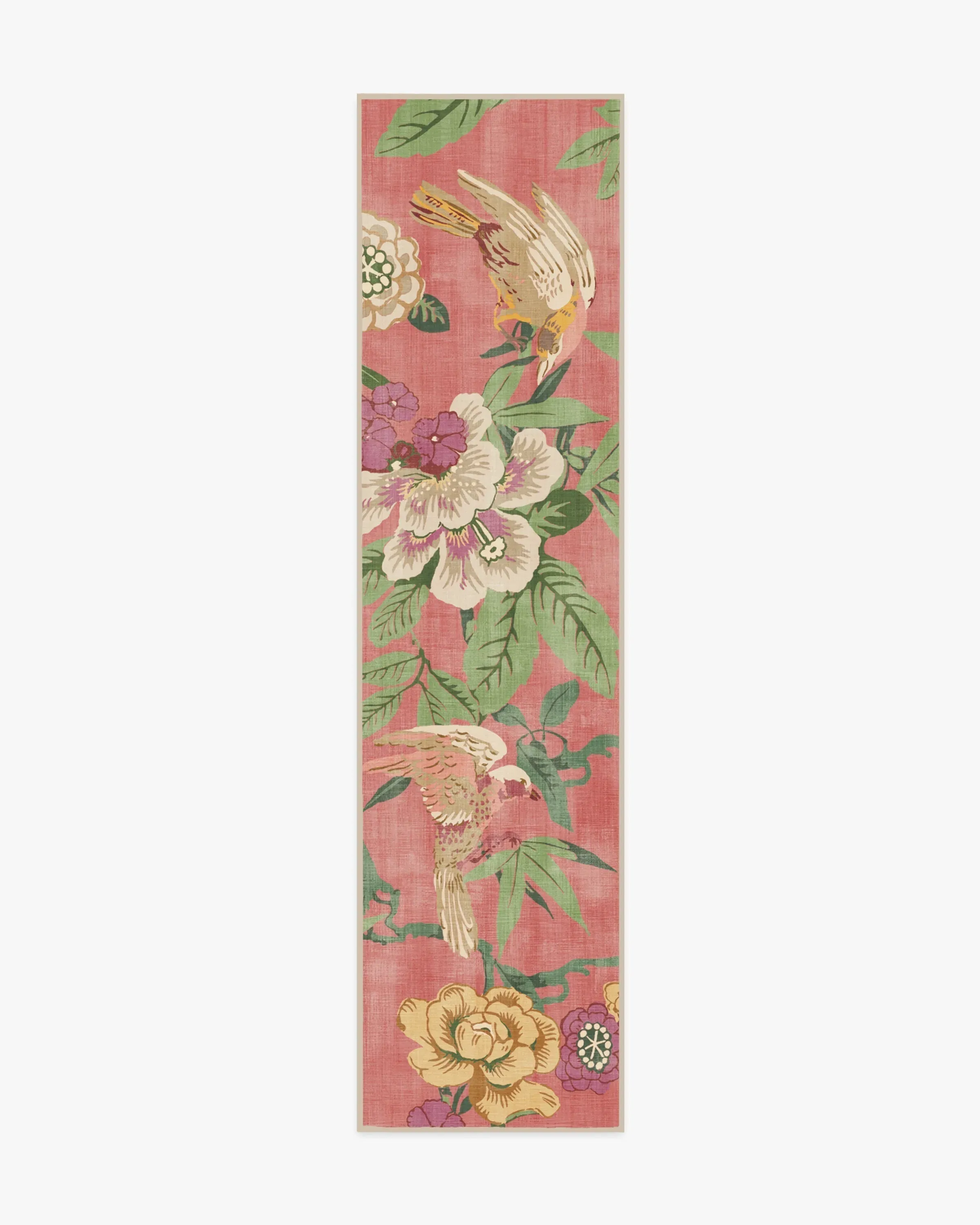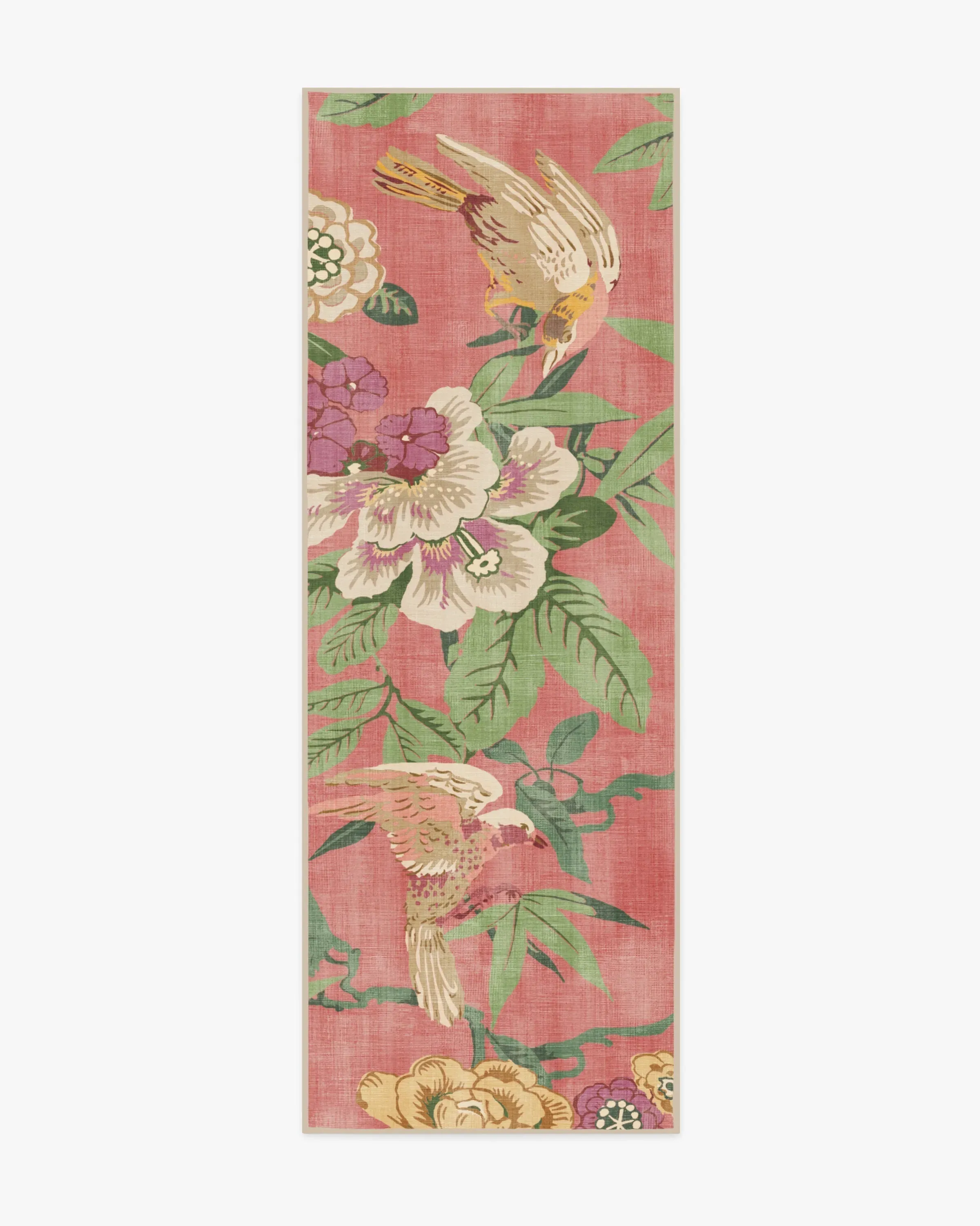 The area rug features delicate bamboo, hibiscus, hydrangea, and wisteria motifs that create a twisting framework for birds to perch. Its palette blends greens, magentas, pinks, neutrals, yellows, and beiges with pops of light cream against a pink coral background. The water-resistant and stain-resistant construction provides durability, while the machine-washable design offers easy maintenance. W60 x D90 cm.