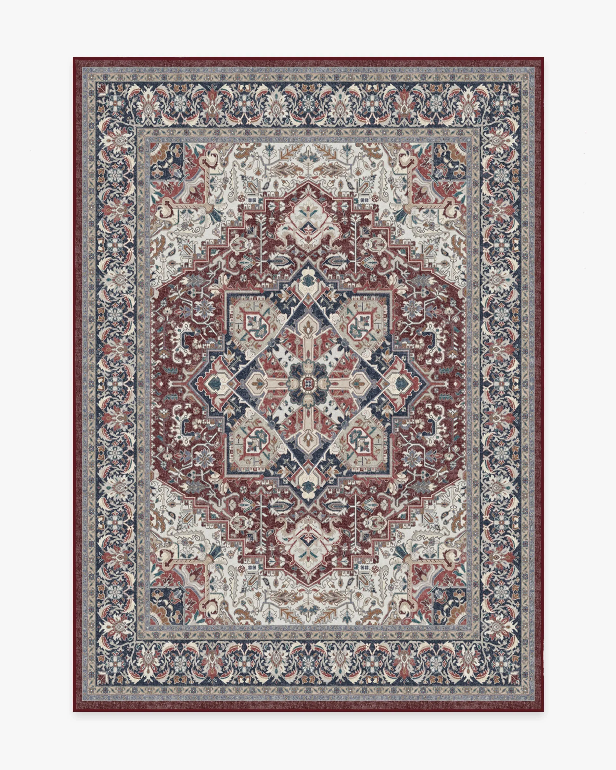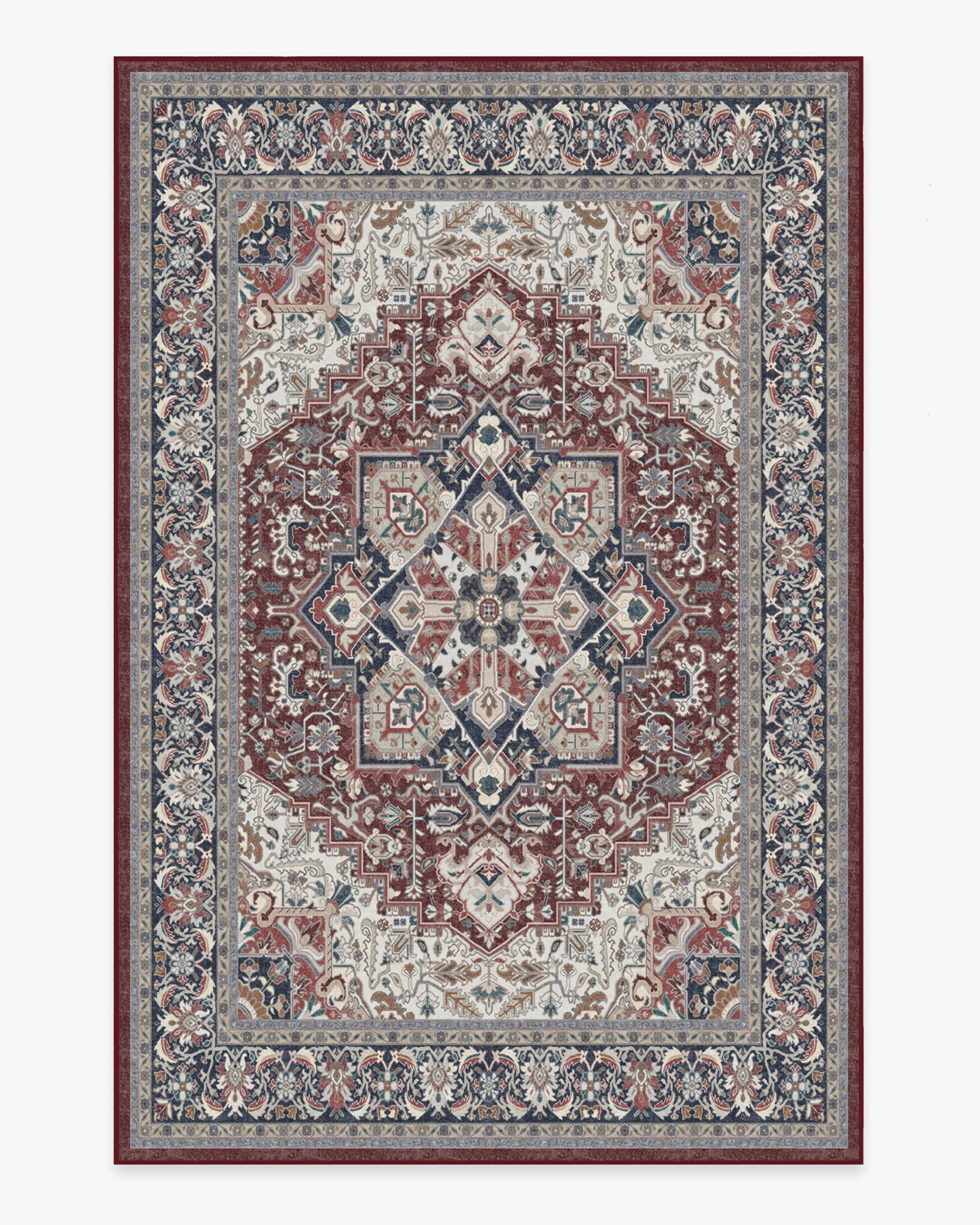 The Hendesi Heriz Bordeaux Rug is a contemporary take on the classic Persian style rug design. Featuring a wine-colored medallion centerpiece, flanked by a cool blue border motif, this rug lends an air of sophistication to any room. 60x90 | Machine Washable Area Rug | Kid & Pet Friendly | Indoor Rugs | Hendesi Heriz Bordeaux Flatwoven Rug Red | Ruggable