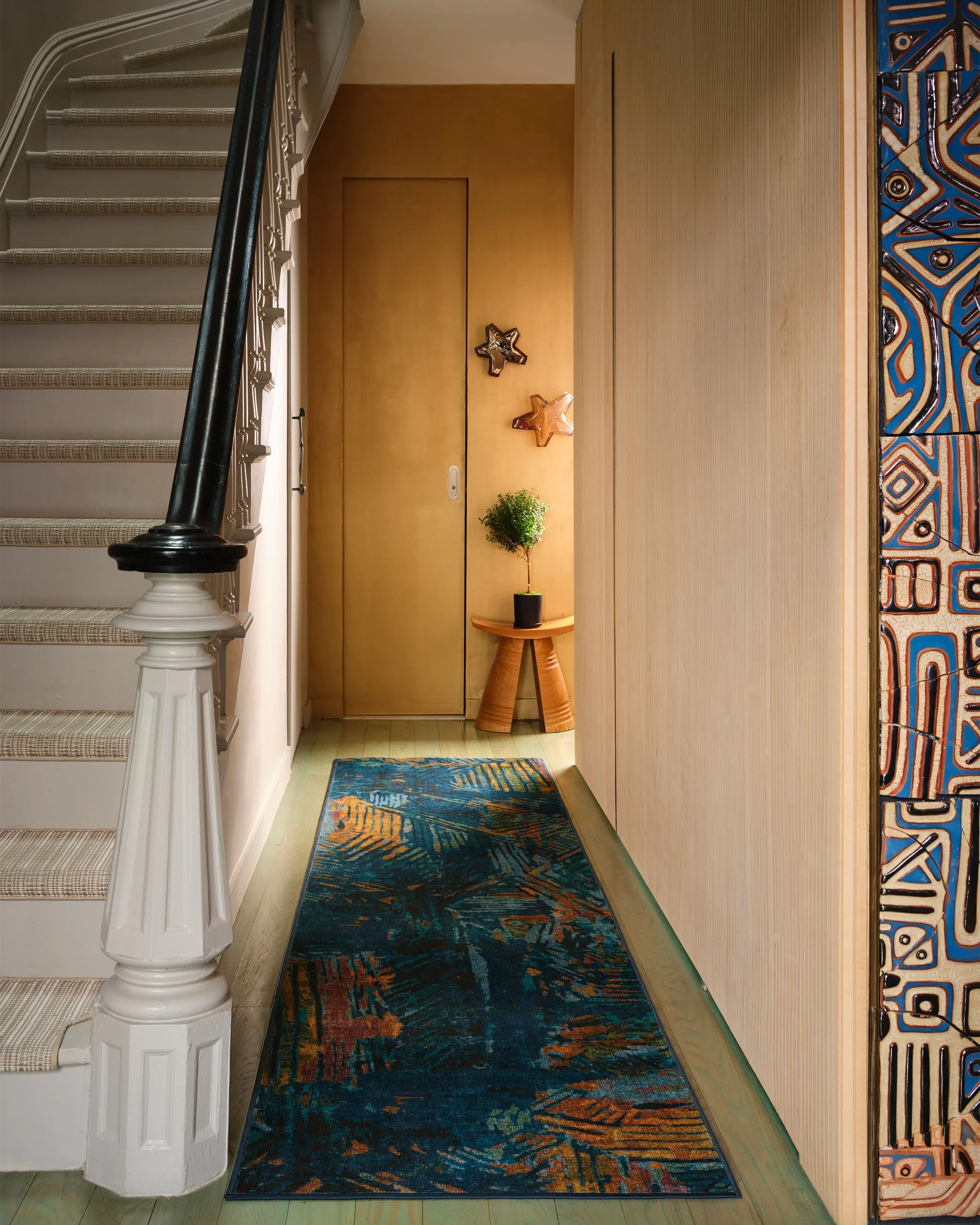 The area rug features an abstract sgraffito design with layered painterly strokes carved into each other. Its dynamic colour palette combines turquoise, smoky blue, soft red, orange, and lime green against a royal blue background. The flatwoven construction provides durability, while the water-resistant and stain-resistant properties ensure easy maintenance. Machine-washable for convenient care. W60 x D90 cm