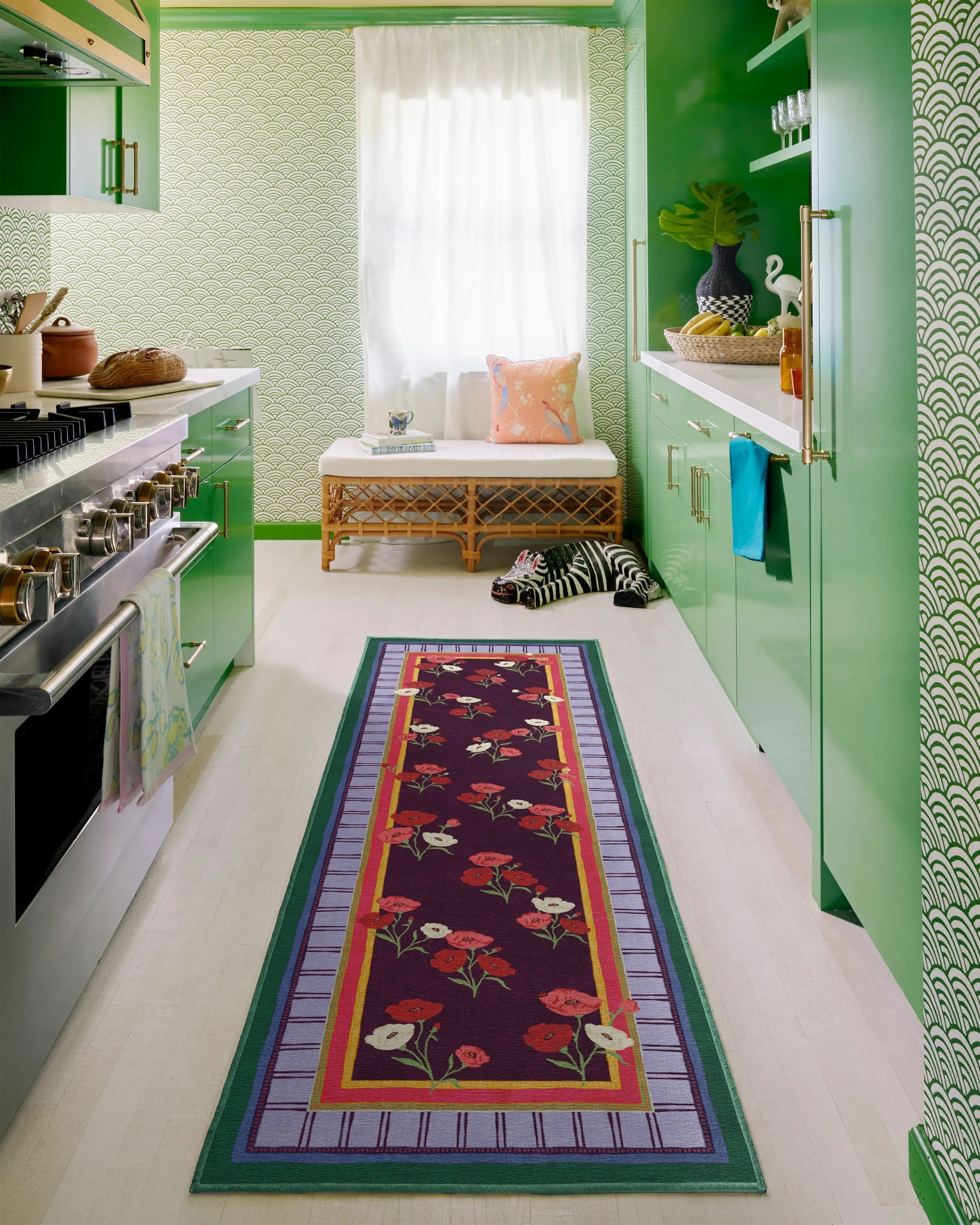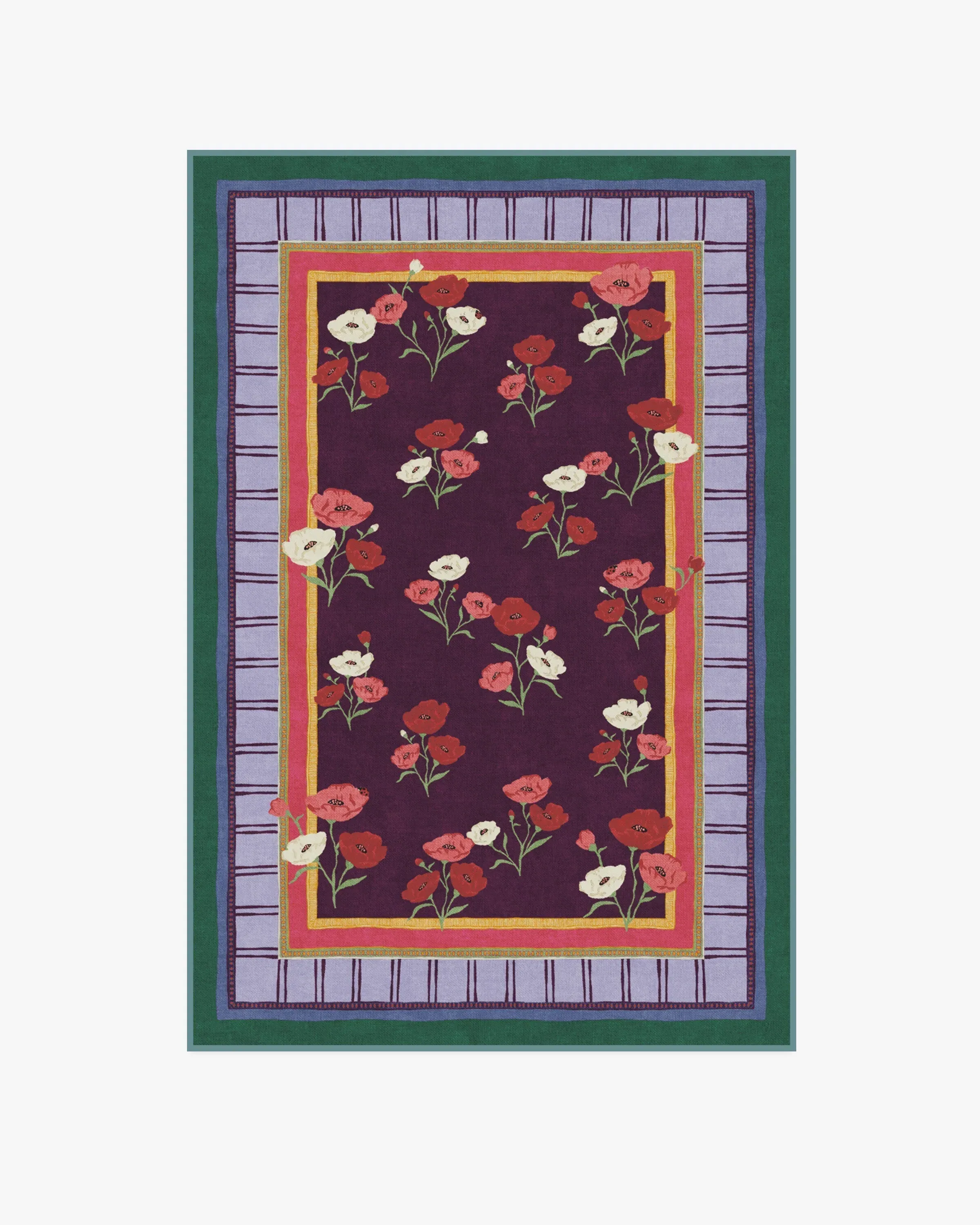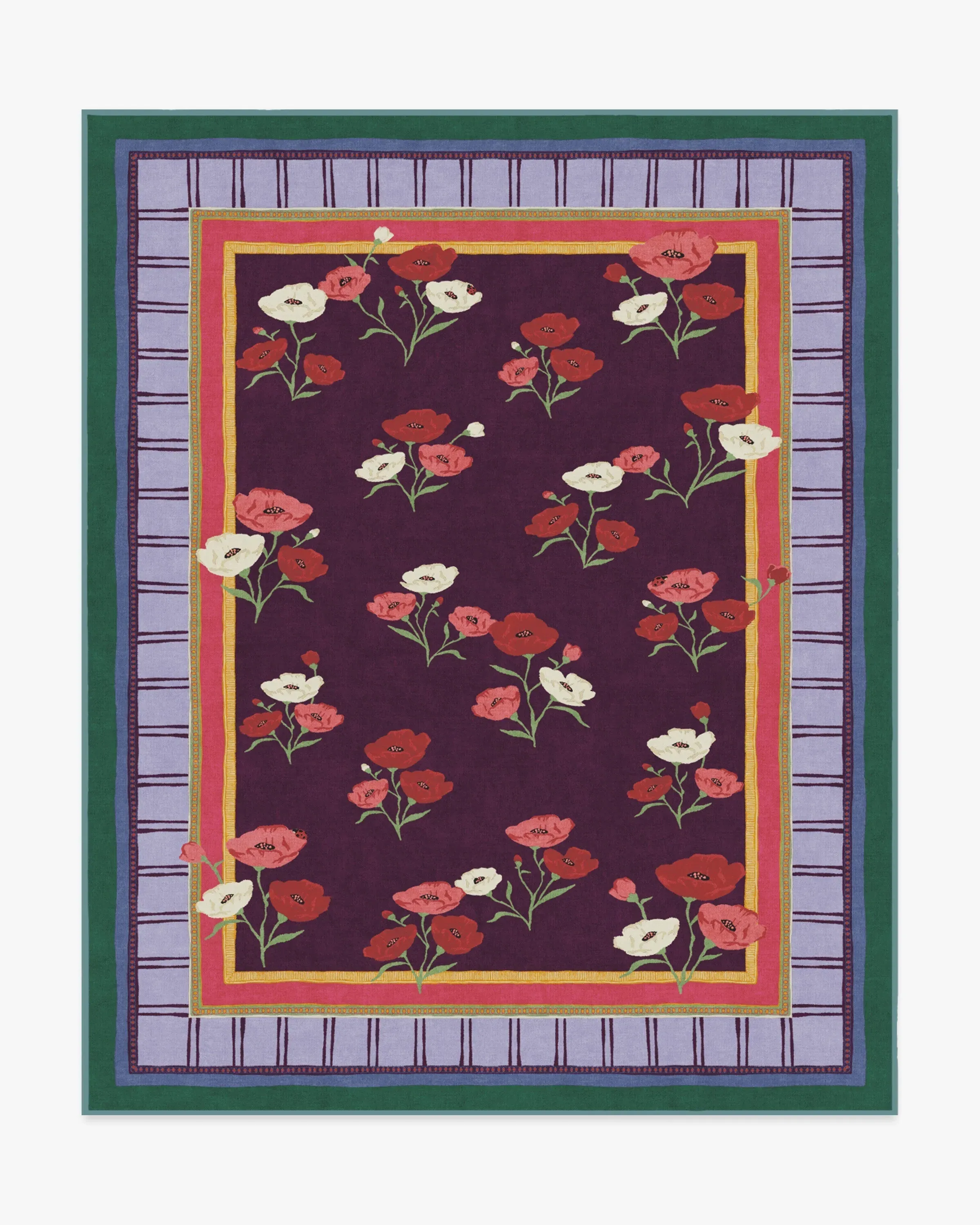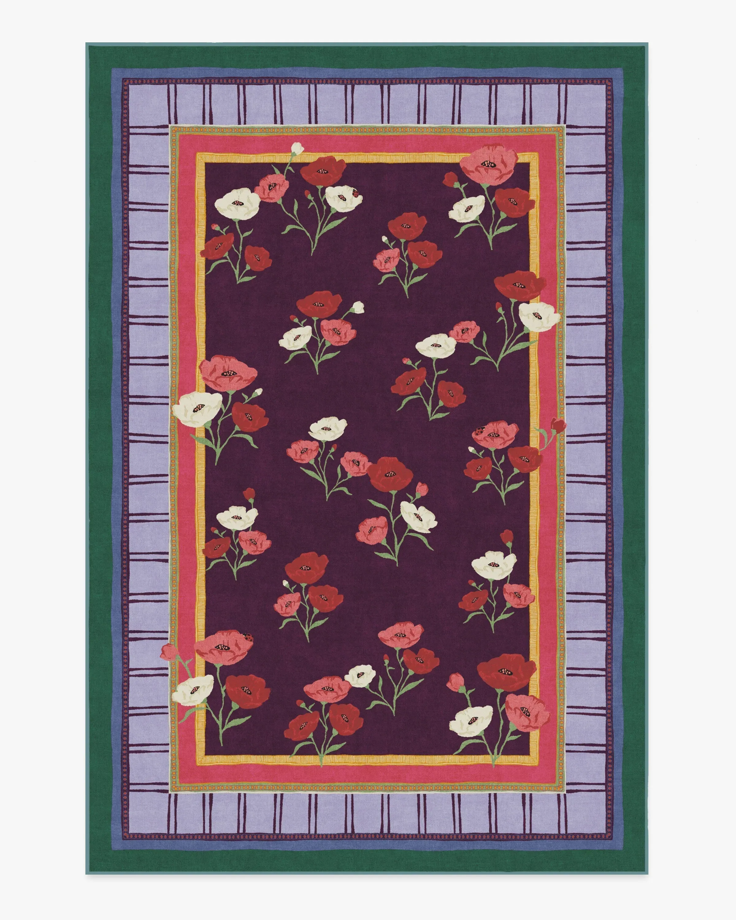 BACK BY POPULAR DEMAND: Step into a garden of creativity with our Iris Apfel Ambroeus Royal Plum Rug. Inspired by Iris' collection of vintage textiles and heirloom, hand-painted scarves, this blooming design features delicate floral motifs with ladybirds hidden among the petals. An intricate border with varied line widths complements the crimson, pink, and white poppies that stretch beautifully against a royal plum background. Bright marigold, pinks, light purples, and deep blue-green blend in the lively-coloured border. Water-resistant, stain-resistant, and machine-washable. Rug colours may vary slightly according to your device and the lighting in your space. 60x90 | Machine Washable Area Rug | Kid & Pet Friendly | Indoor Rugs | Ambroeus Royal Plum Flatwoven Rug by Iris Apfel | Ruggable