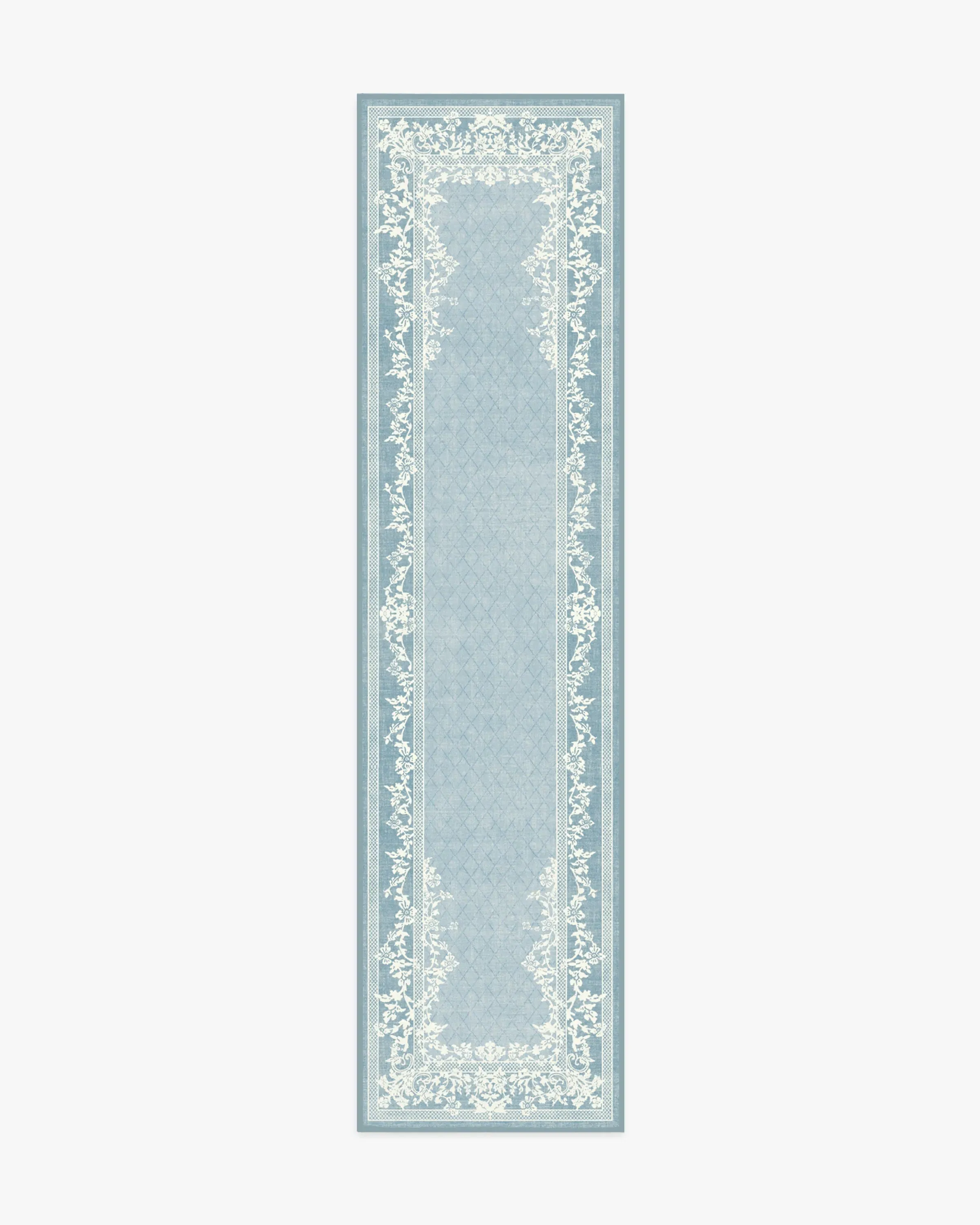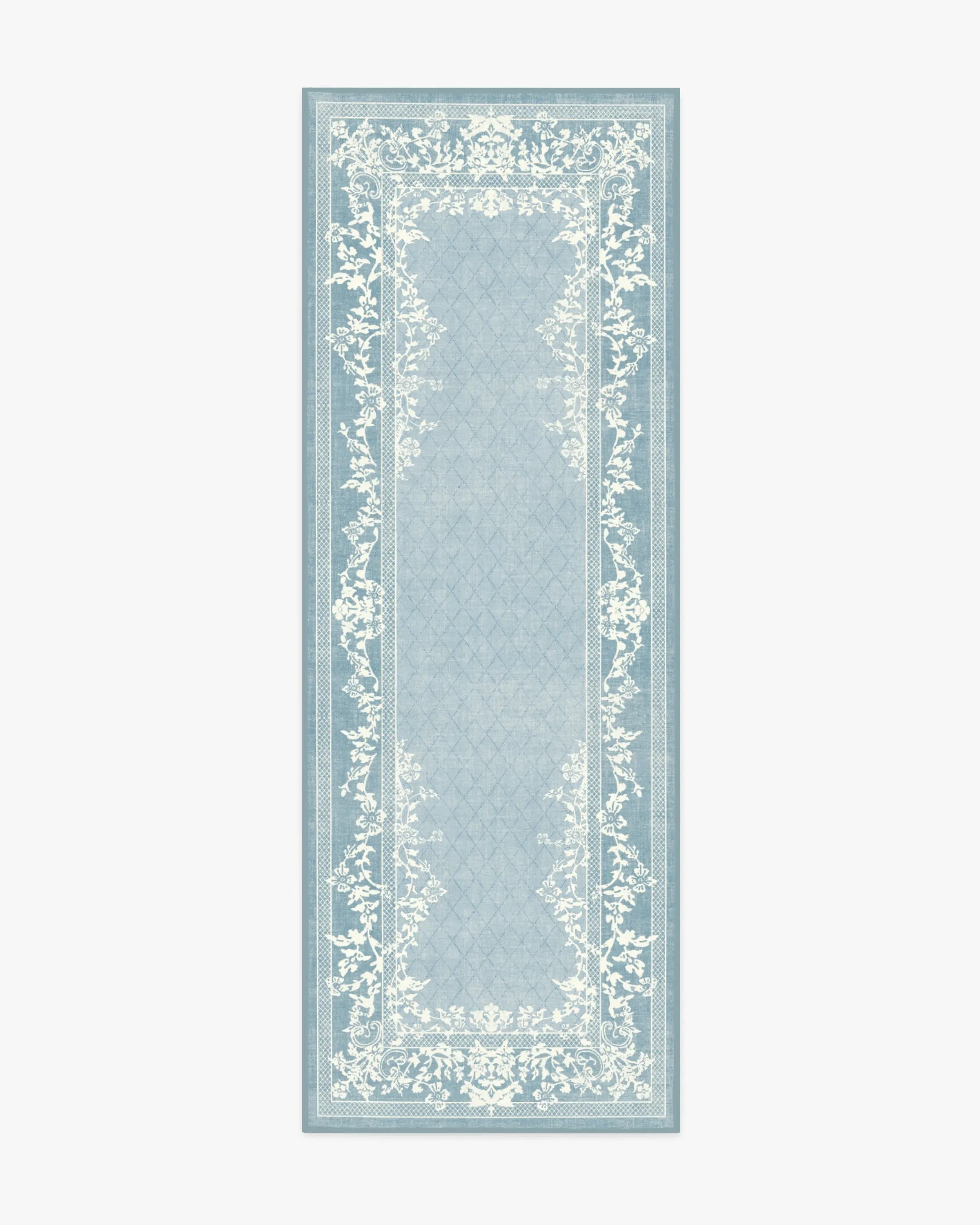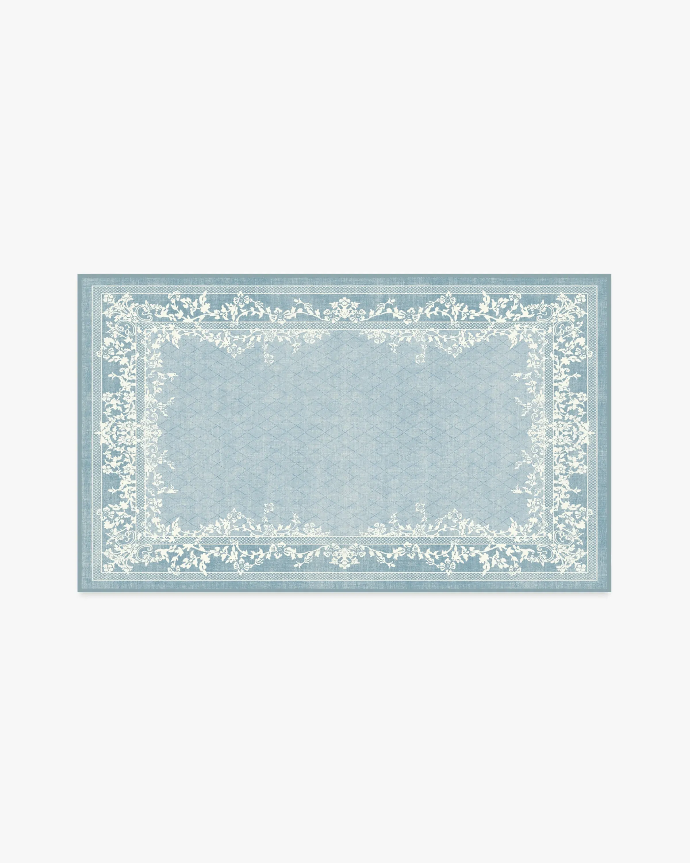 Romanticise the everyday with our Regency-era Juliet Slate Blue Rug. A two-tone, floral border gracefully frames a subtle trellis field pattern against a soft, light blue-grey background. Water-resistant, stain-resistant, and machine-washable. Rug colours may vary slightly according to your device and the lighting in your space. 60x90 | Machine Washable Area Rug | Kid & Pet Friendly | Indoor Rugs | Juliet Slate Blue Rug | Ruggable