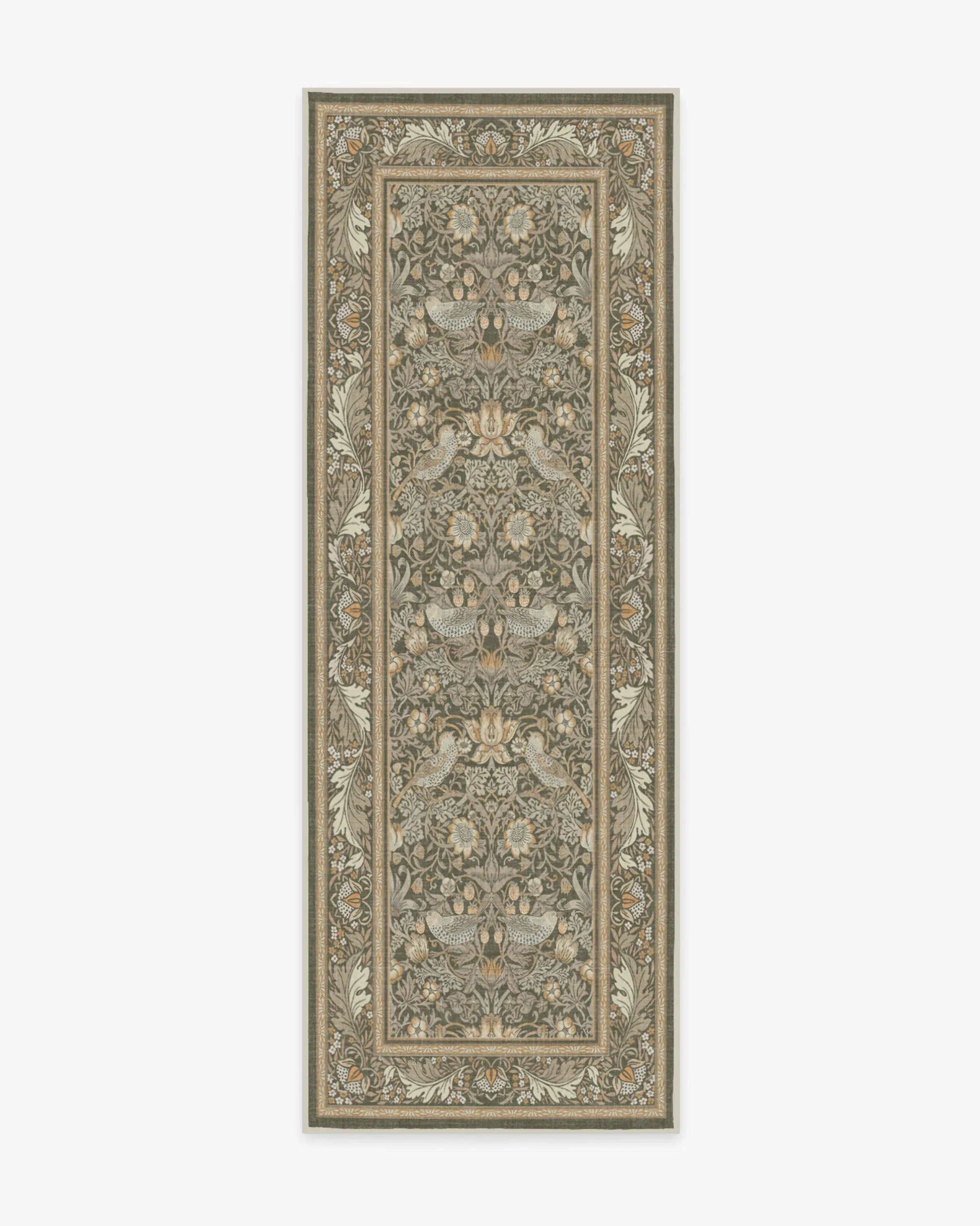 Step into Kelmscott Manor's garden with the Morris & Co. Strawberry Thief Indigo Rug. A direct translation of William Morris's recognisable block print textile, this rug depicts Morris's thrushes stealing fruit from his kitchen garden. This exclusive colourway layers warm taupe and ivory with neutral grey and beige for subtle sophistication. Water-resistant, stain-resistant, and machine-washable. Rug colours may vary slightly according to your device and the lighting in your space. 60x90 | Machine Washable Area Rug | Kid & Pet Friendly | Indoor Rugs | Strawberry Thief Stone Gold Flatwoven Rug by Morris & Co. | Ruggable
