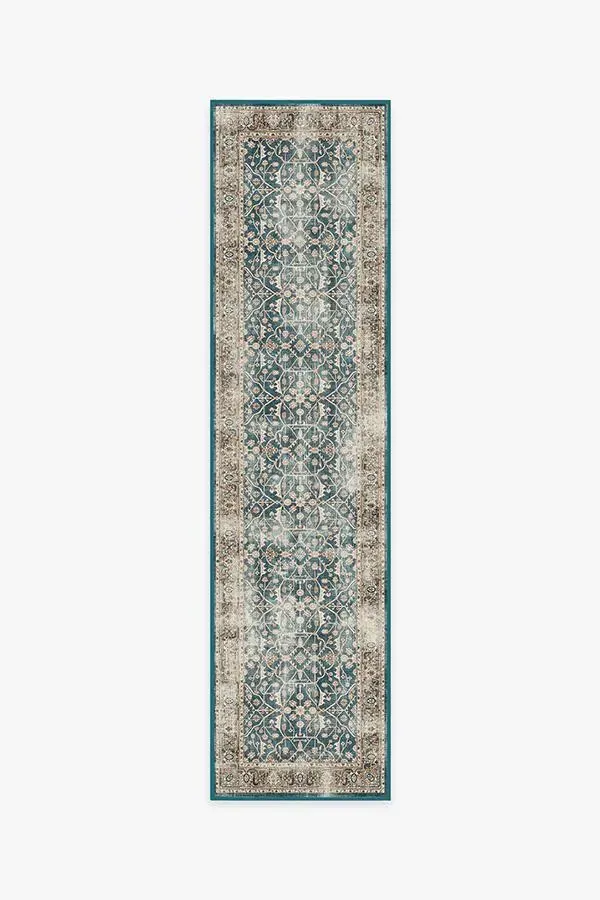 Celestine Teal Blue Rug gives off a celestial vibe with its whimsical floral theme. Designed to look like a lattice panel, this rug features a slim border and a large field of floral vines crawling through a grid-like pattern. Its palette of teal blue and coral orange is slightly distressed to give it a modern vintage feel. 60x90 | Machine Washable Area Rug | Kid & Pet Friendly | Indoor Rugs | Celestine Teal Blue Rug | Ruggable