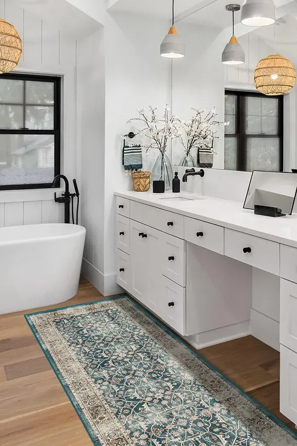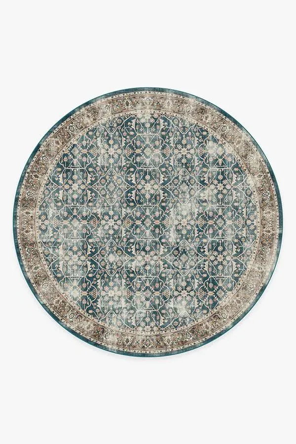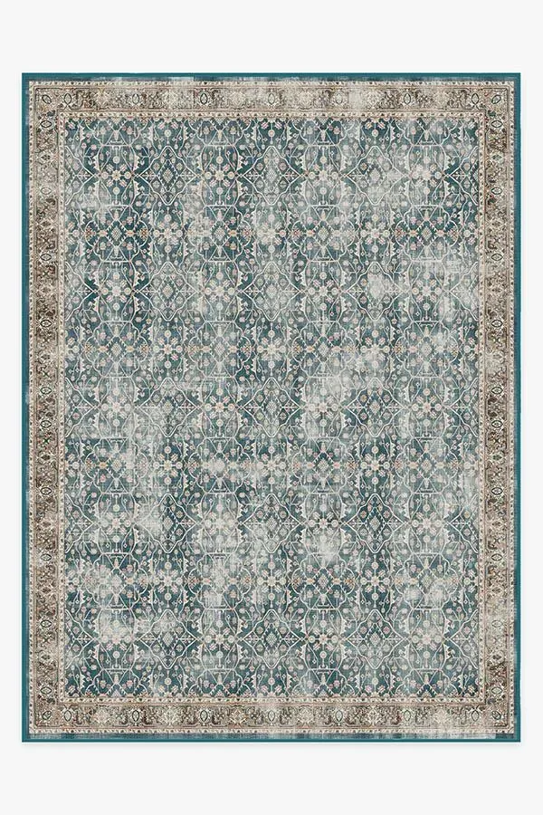 Celestine Teal Blue Rug gives off a celestial vibe with its whimsical floral theme. Designed to look like a lattice panel, this rug features a slim border and a large field of floral vines crawling through a grid-like pattern. Its palette of teal blue and coral orange is slightly distressed to give it a modern vintage feel. 60x90 | Machine Washable Area Rug | Kid & Pet Friendly | Indoor Rugs | Celestine Teal Blue Flatwoven Rug | Ruggable