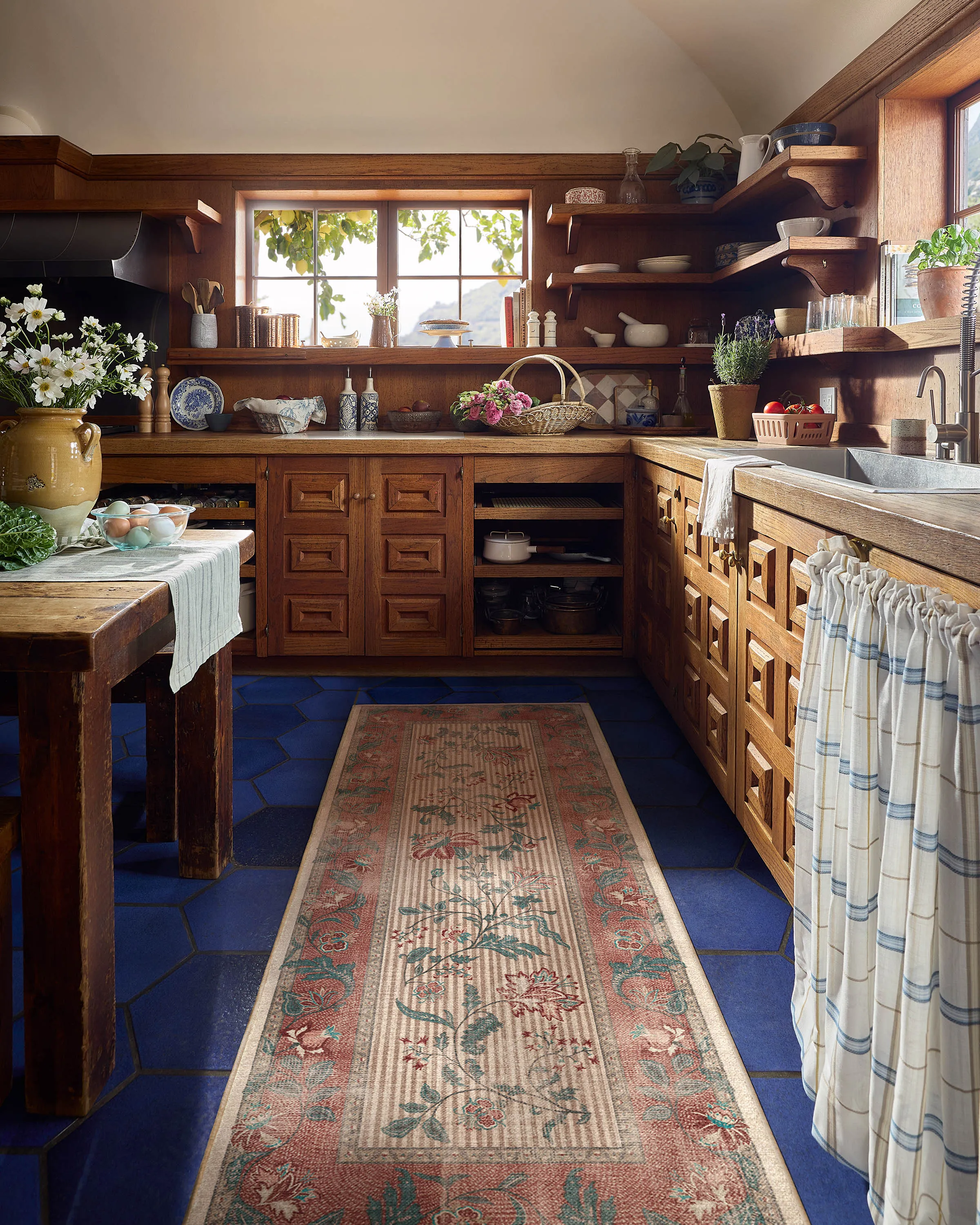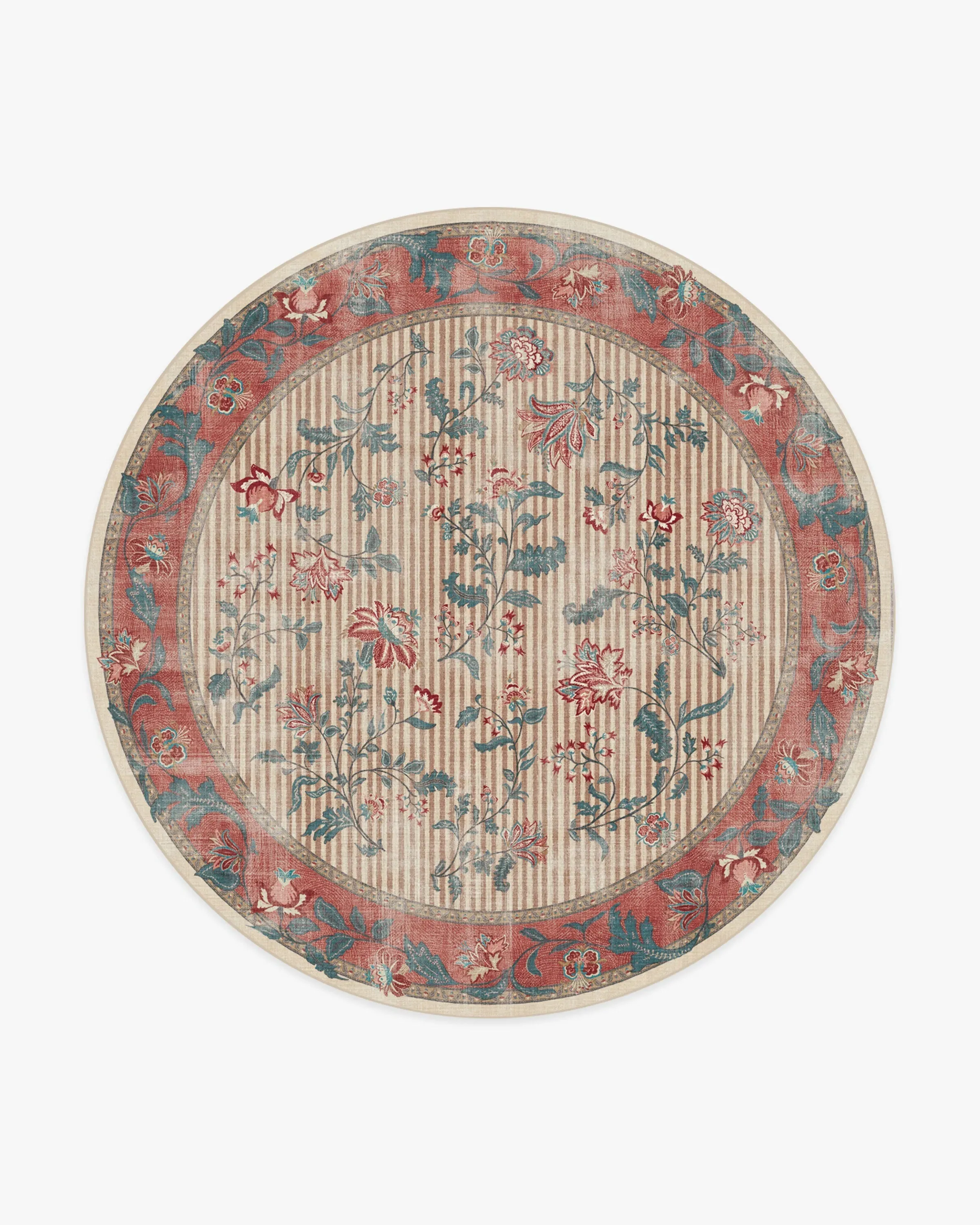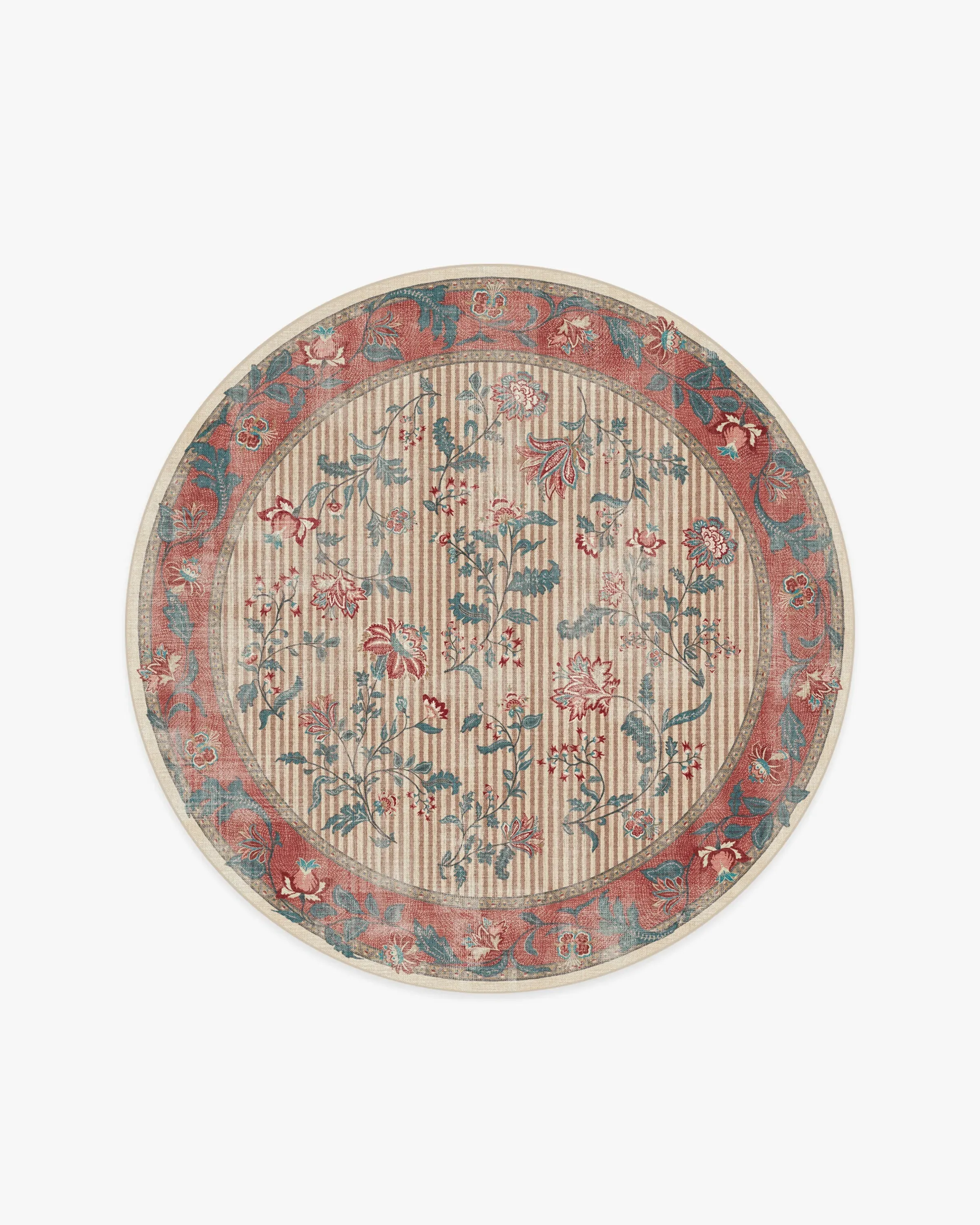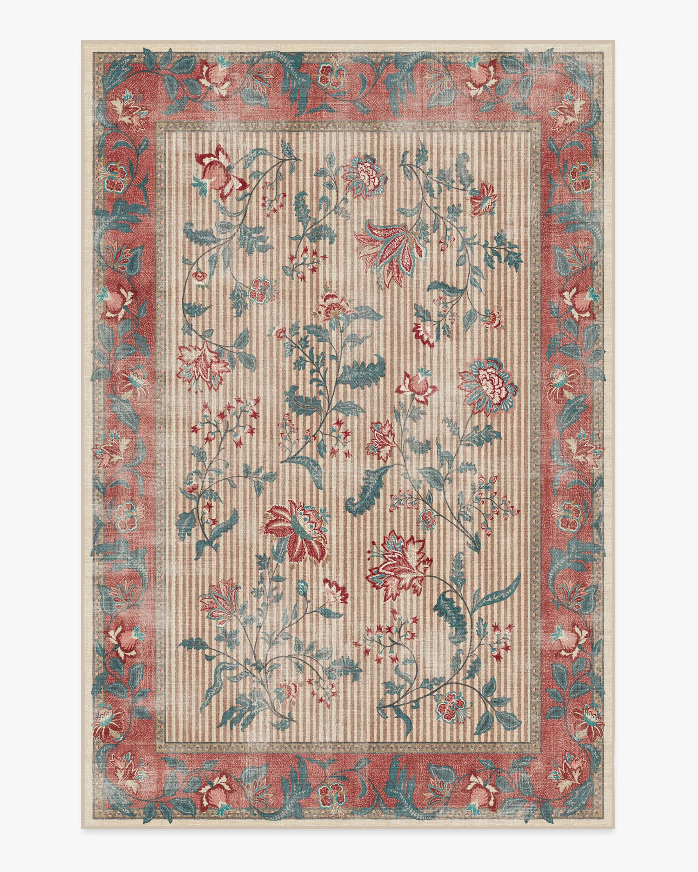 Inspired by Indian and French foulard prints, our Lilou Currant & Teal Green Rug features flowing bouquets set against a striped background, bordered by wavy florals. A palette of pinks, red, teal, ivory, and neutral tones adds a balance of colour and depth. Water-resistant, stain-resistant, and machine-washable. Rug colours may vary slightly according to your device and the lighting in your space. 60x90 | Machine Washable Area Rug | Kid & Pet Friendly | Indoor Rugs | Lilou Currant & Teal Green Flatwoven Rug | Ruggable
