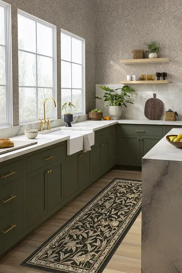 Let your room sing with our Morris & Co. Bird & Pomegranate Soft Black Rug. We've transformed the 1926 wallpaper design into a charming vignette with a modern, playful border. Originally inspired by views from William Morris's personal home, this whimsical scene features birds swooping, perching, and pecking amidst a maze of pomegranate plants. The composition features moody contrasted black, browns, gold and desaturated neutrals for a more subdued feel. Water-resistant, stain-resistant, and machine-washable. Rug colours may vary slightly according to your device and the lighting in your space. 60x90 | Machine Washable Area Rug | Kid & Pet Friendly | Indoor Rugs | Bird & Pomegranate Soft Black Flatwoven Rug by Morris & Co. | Ruggable