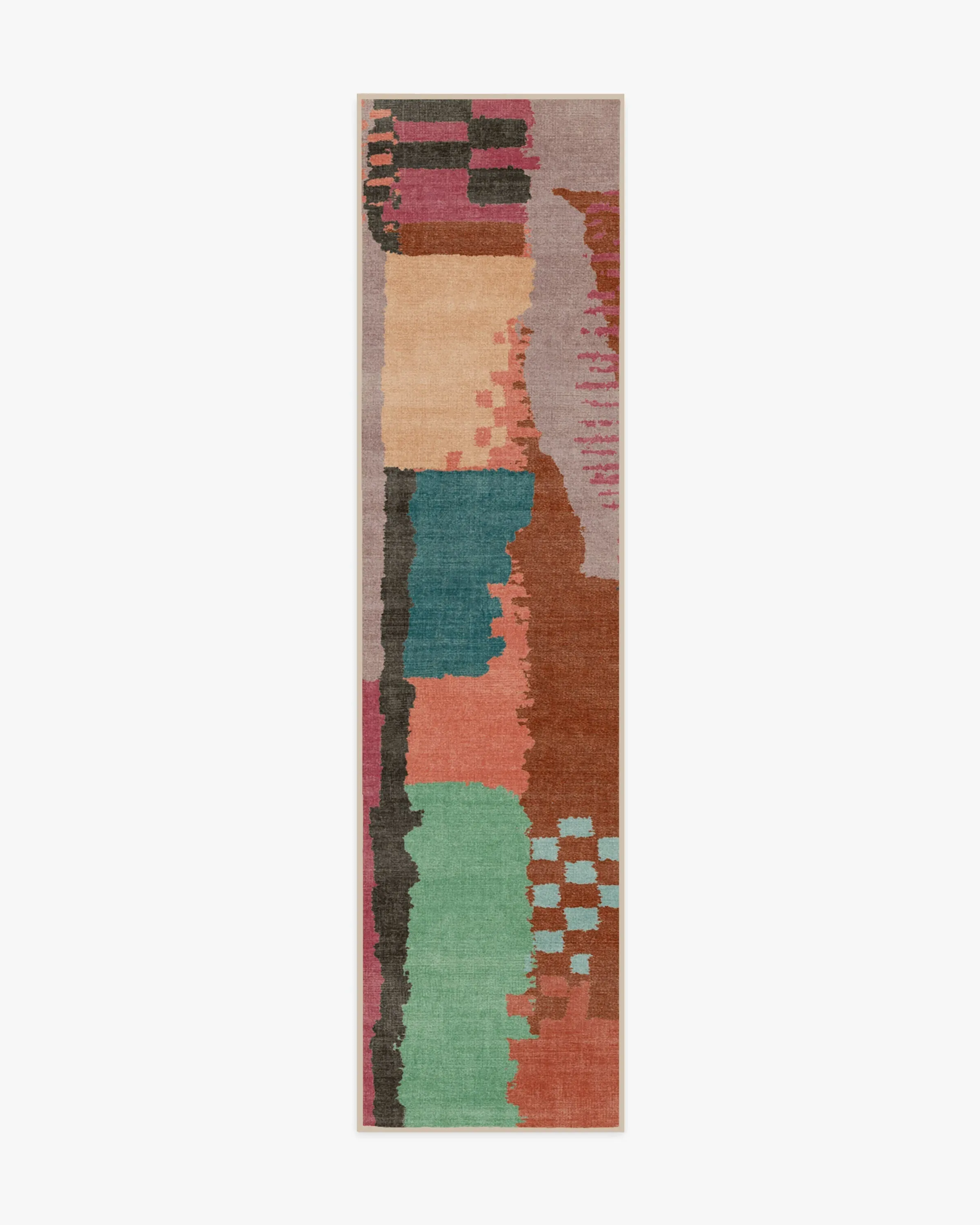 The flatwoven rug features a Moroccan Berber-inspired chequerboard pattern with abstract colourblocks in rust red, dusty lilac, teal, sky blue, soft fuchsia, peach, and seaglass green. Its water-resistant and stain-resistant construction provides durability, while the machine-washable design offers easy maintenance. The organic composition draws inspiration from hand-woven imperfections, creating detailed visual texture. W60 x D90 cm.