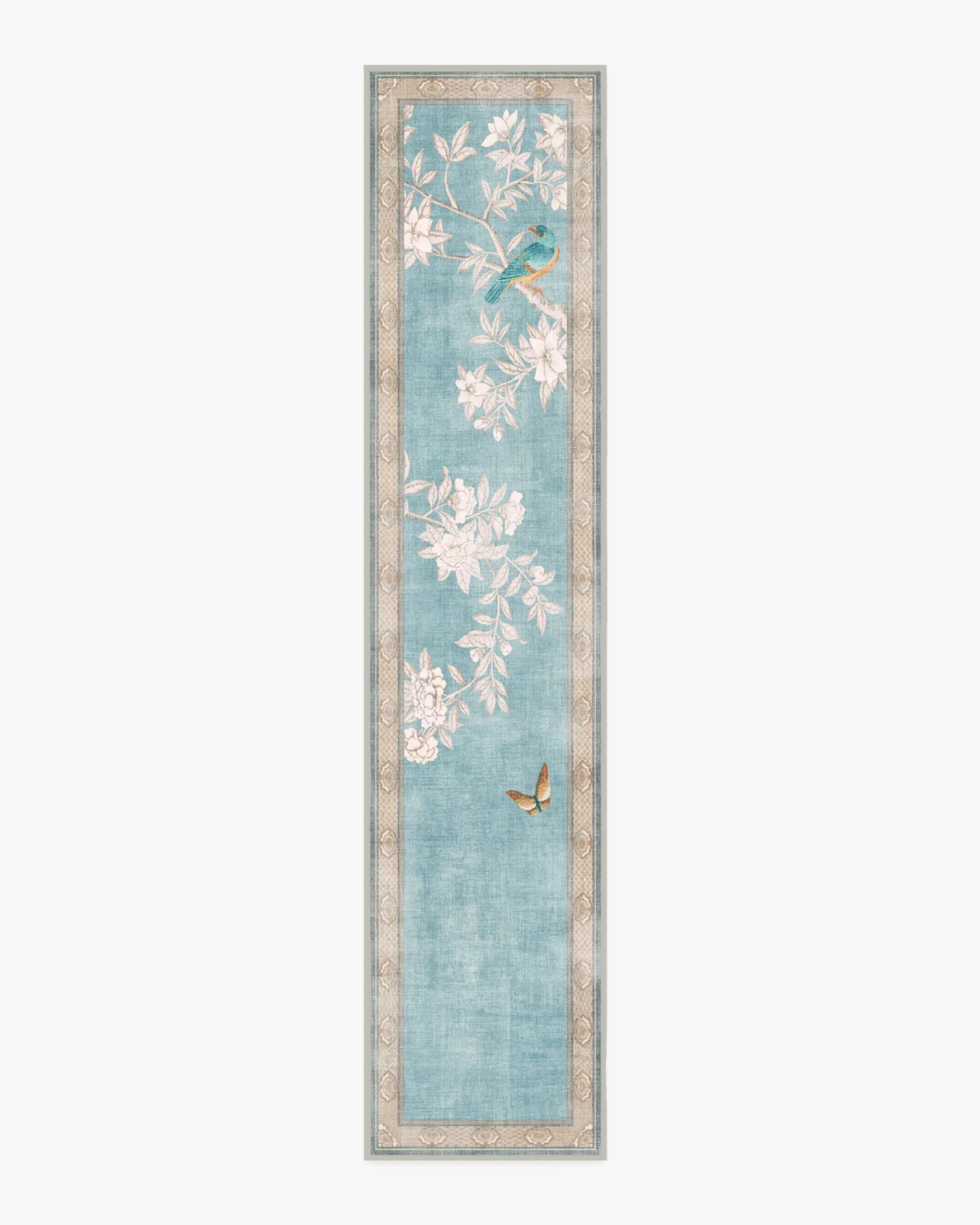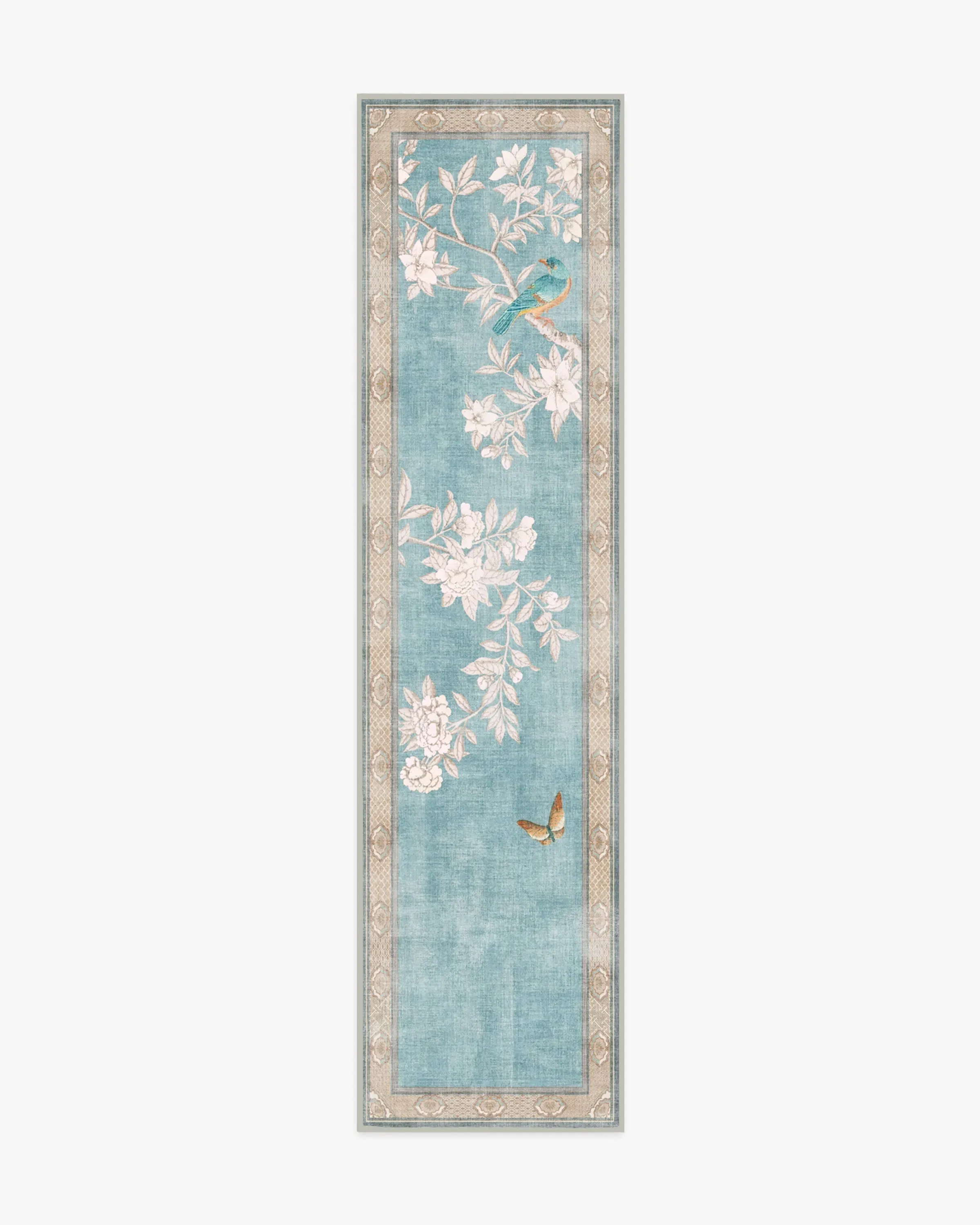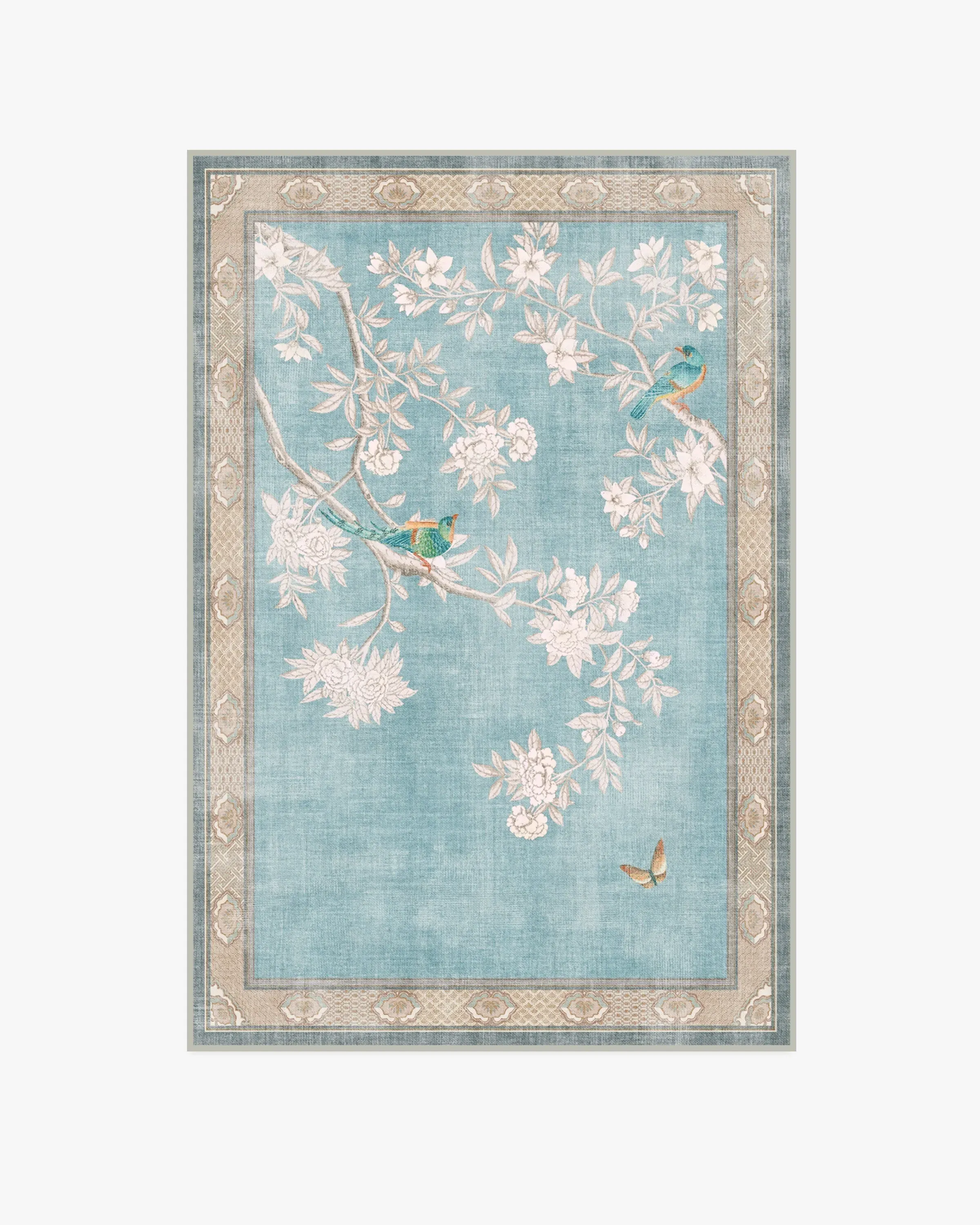 Inspired by handpainted Chinese artistry, Gracie Hampton Soft Blue Rug features richly-coloured birds and butterflies, framed by subtle patterns. A soft palette of graphite-coloured florals, blue-greens, dusty reds, soft oranges, and yellows pops beautifully against a soft robin's egg blue background. Water-resistant, stain-resistant, and machine-washable. Rug colours may vary slightly according to your device and the lighting in your space. 60x90 | Machine Washable Area Rug | Kid & Pet Friendly | Indoor Rugs | Hampton Soft Blue Rug by Gracie | Ruggable
