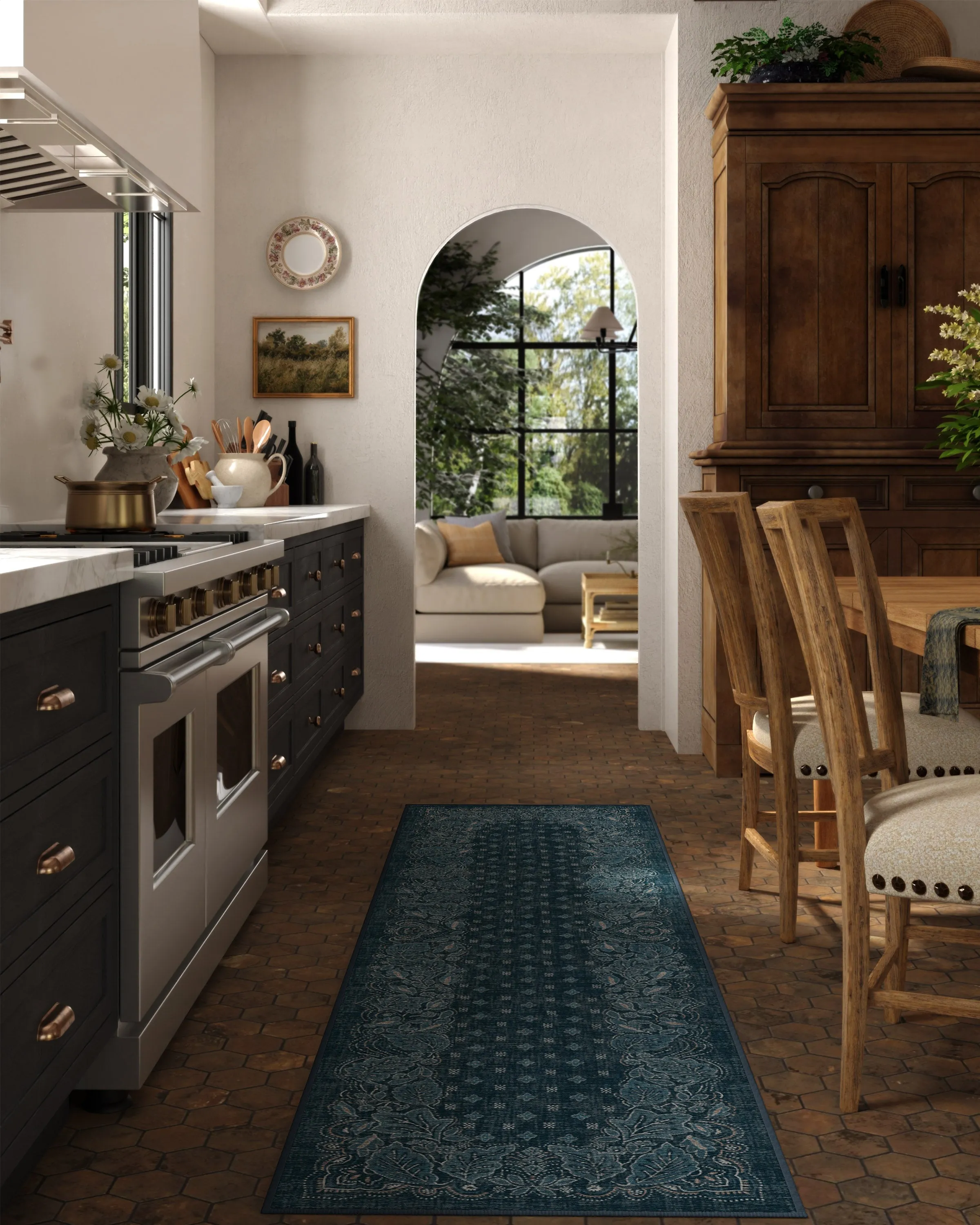 The Prato rug provides vintage bandana-inspired styling with intricate leaf motifs and dotted border details. Its midnight blue background features pops of cream and neutral shades for visual appeal, while the flatwoven construction delivers lasting quality. The water-resistant and stain-resistant treatment ensures easy upkeep, and the machine-washable capability makes cleaning convenient.