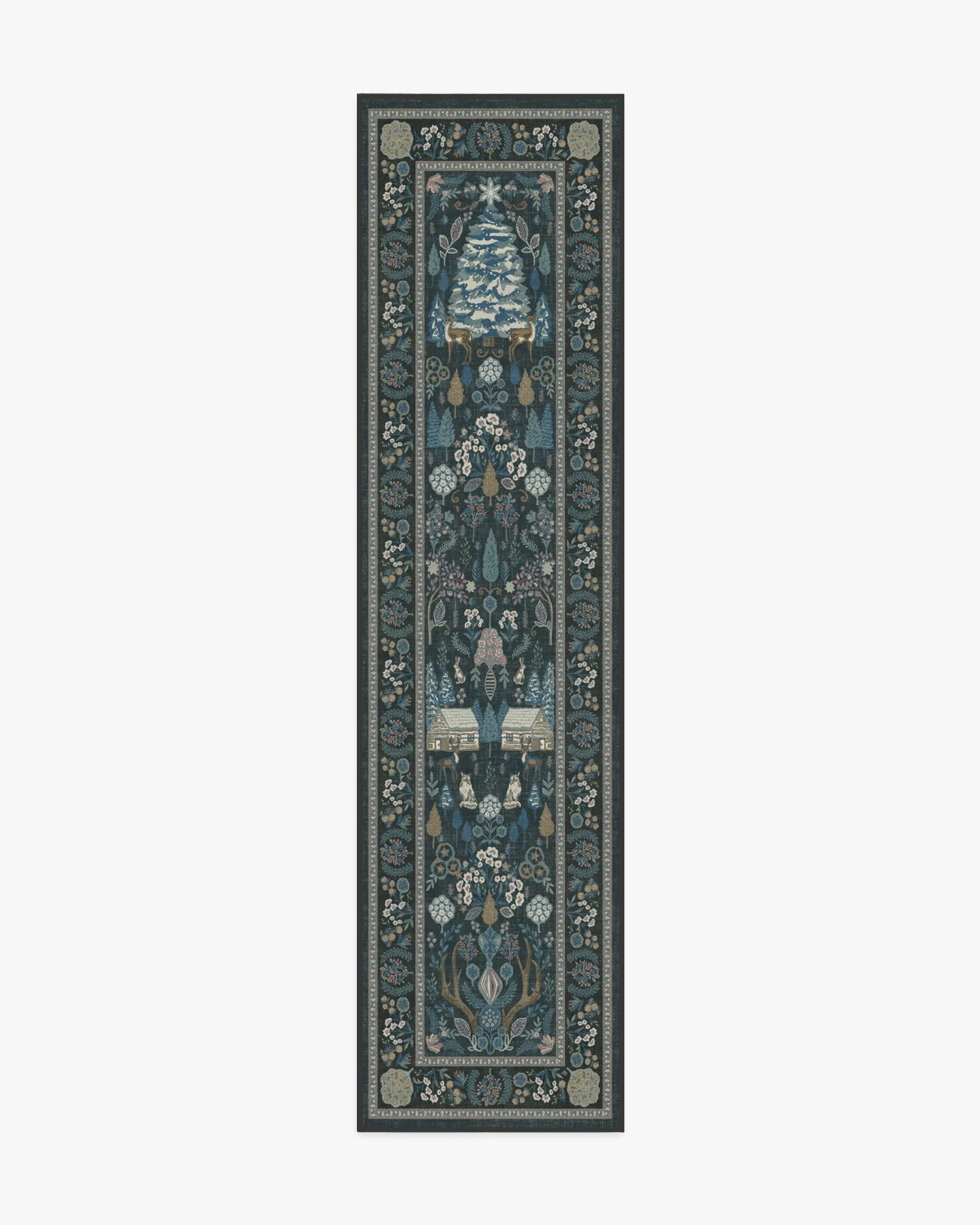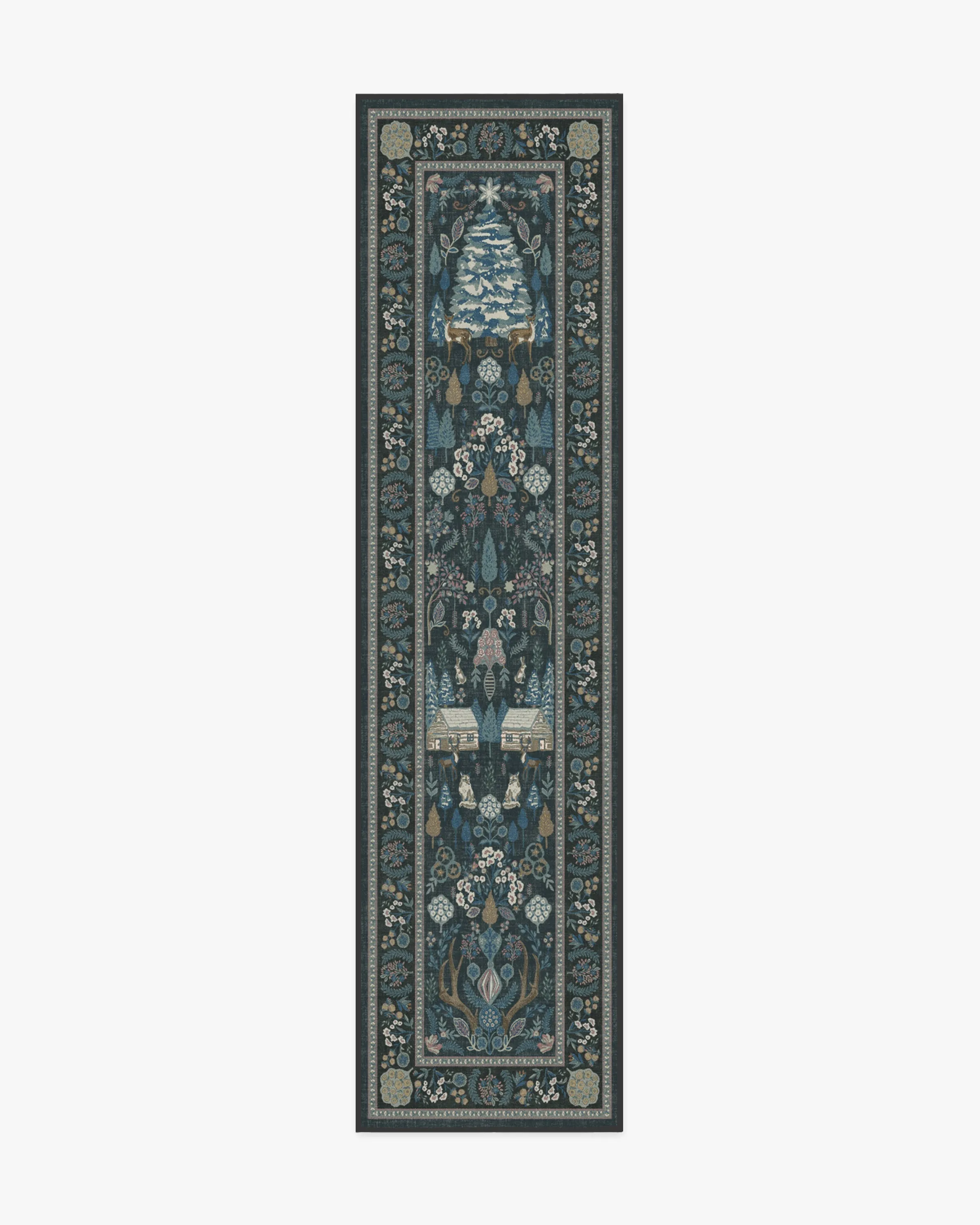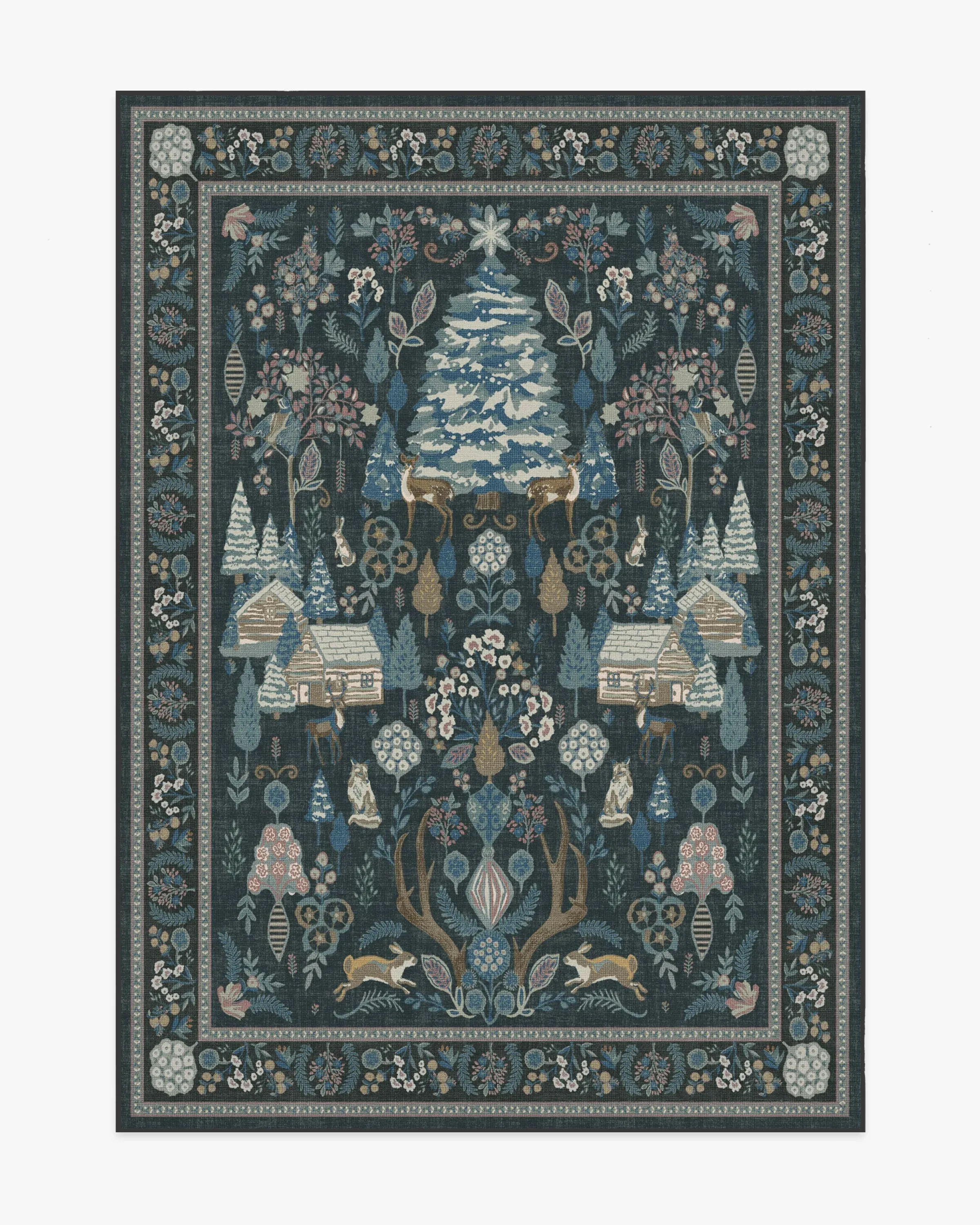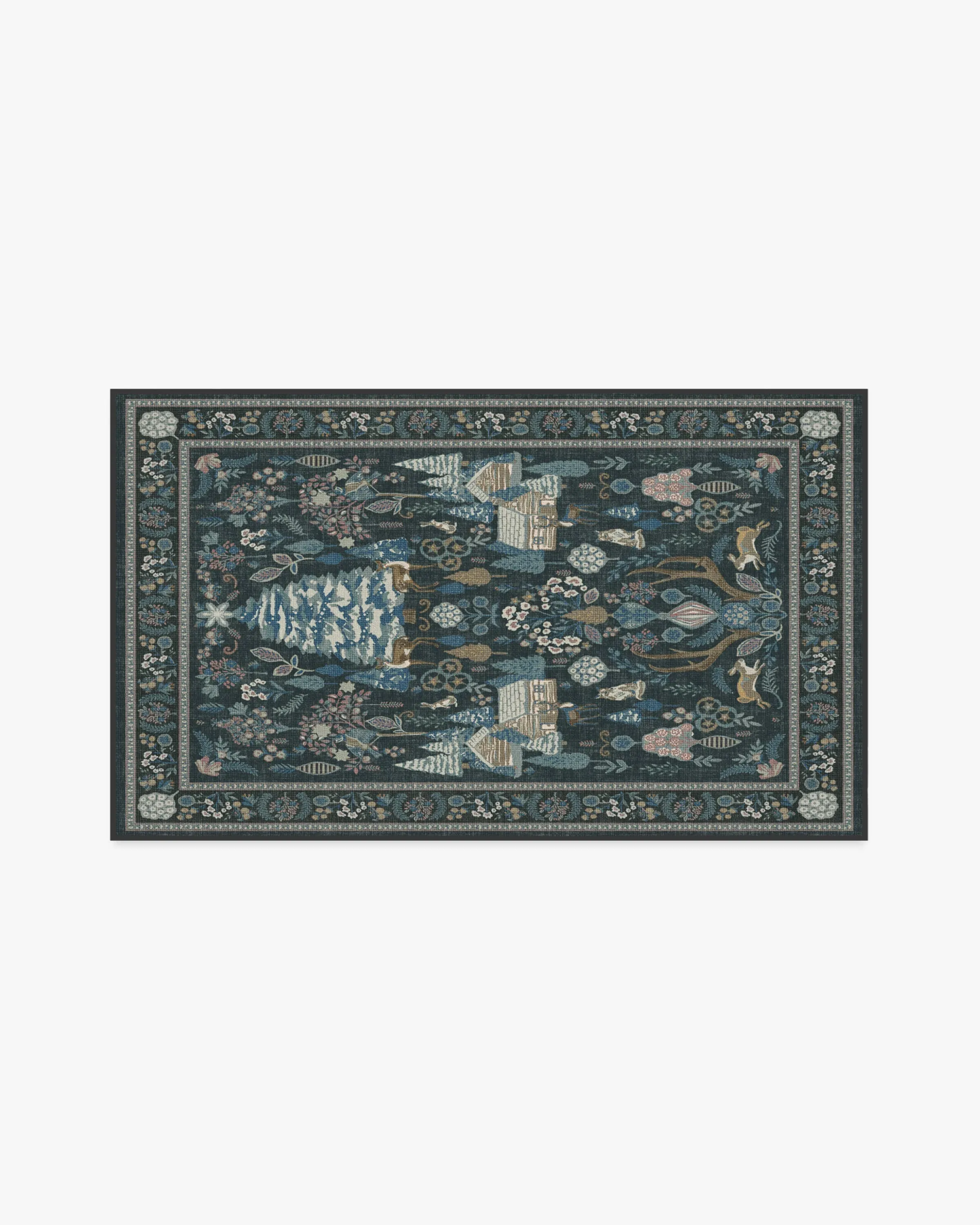 Step into a whimsical wonderland with our Juniper Pastel Multicolour Rug. This cottagecore-inspired tapestry design features a slightly washed blue ground, with shades of blue, mauves, and other neutral colours that bring retro Christmas charm to any room. Pine trees, cosy cabins, and woodland friends will give you all the festive feels. Water-resistant, stain-resistant, and machine-washable. Colours may vary by device and lighting. 60x90 | Machine Washable Area Rug | Kid & Pet Friendly | Indoor Rugs | Juniper Blue Multicolor Rug | Ruggable