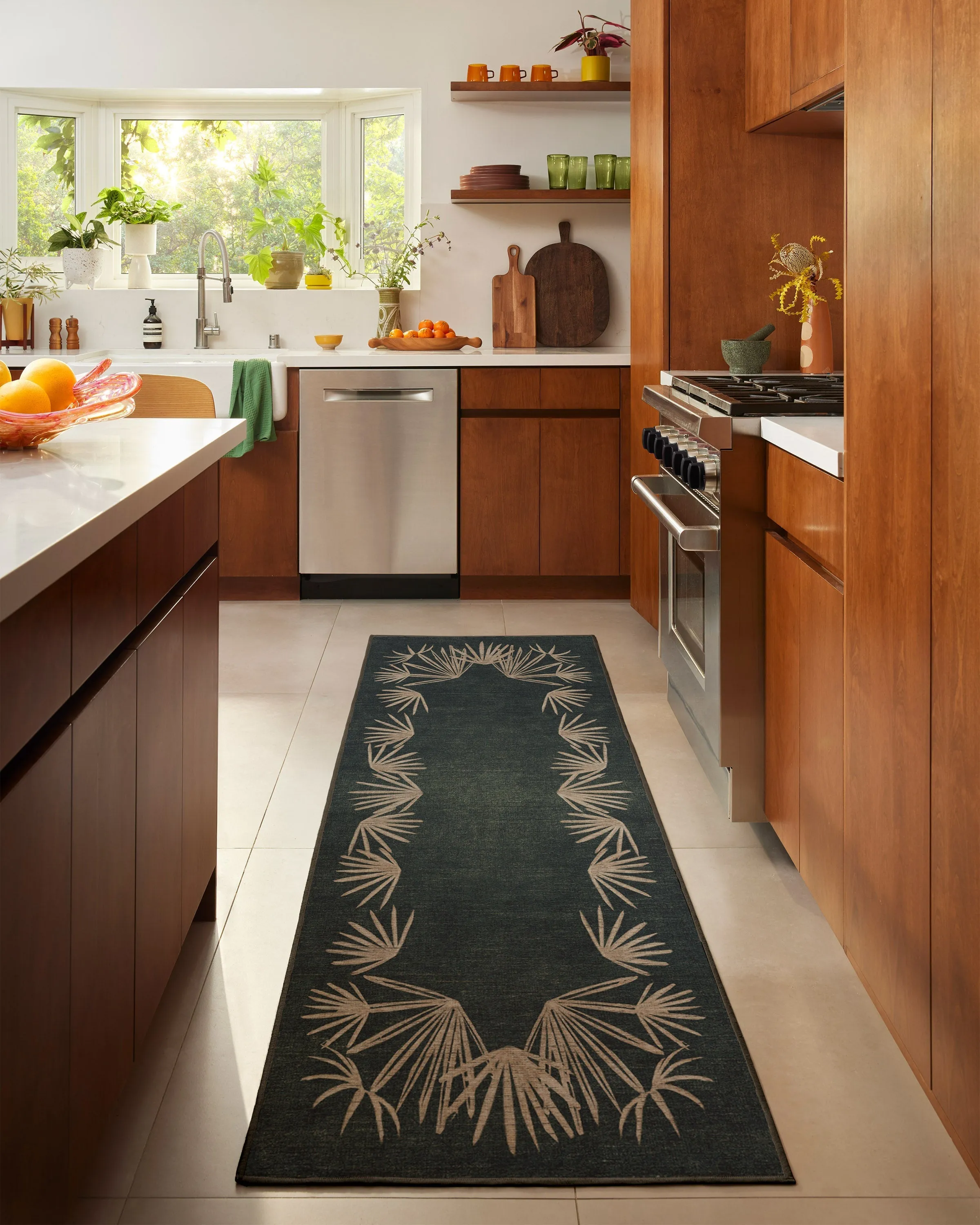 Beautiful. Breezy. Boho. Inspired by the swaying palm trees in Elysian Valley, Justina's former home, our Justina Blakeney Tarsila Forest Rug borrows artistic influence from Brazilian painter Tarsila de Aguiar do Amaral. The rich forest green background is surrounded by natural, warm palm motifs that bring serenity and style to any space. Water-resistant, stain-resistant, and machine-washable. Rug colours may vary slightly according to your device and the lighting in your space. 60x90 | Machine Washable Area Rug | Kid & Pet Friendly | Indoor Rugs | Tarsila Forest Flatwoven Rug by Justina Blakeney Green | Ruggable